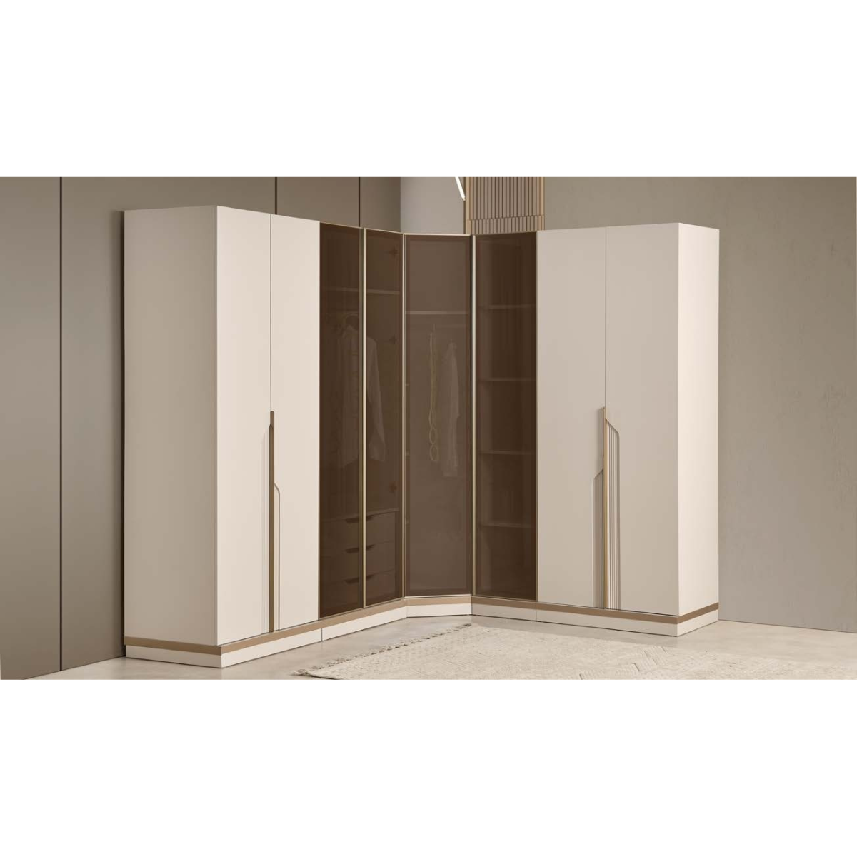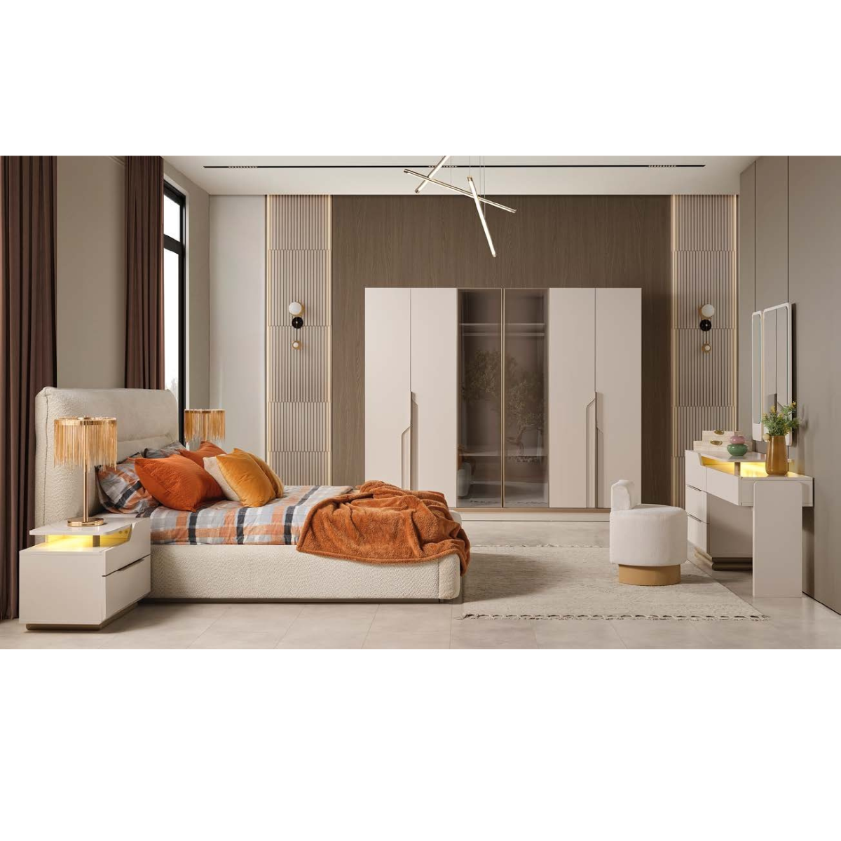 Das Beta Schlafzimmer zeigt klare Formen und eine ruhige, helle Farbgebung. Die Fronten wirken geradlinig; der 6-türige Kleiderschrank besitzt mittige Spiegelelemente und seitliche Türen mit integrierten Griffkonturen. Das Polsterbett hat ein weich gepolstertes Kopfteil und einen integrierten Bettkasten. Ergänzt wird das Set durch 2 Nachttische, einen Schminktisch mit Spiegel sowie einen Hocker – alles im abgestimmten Design.