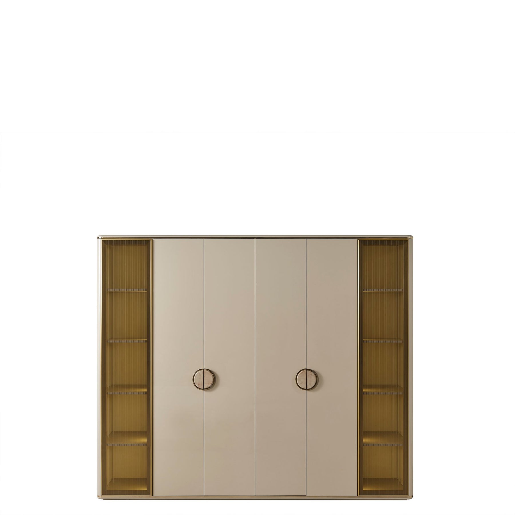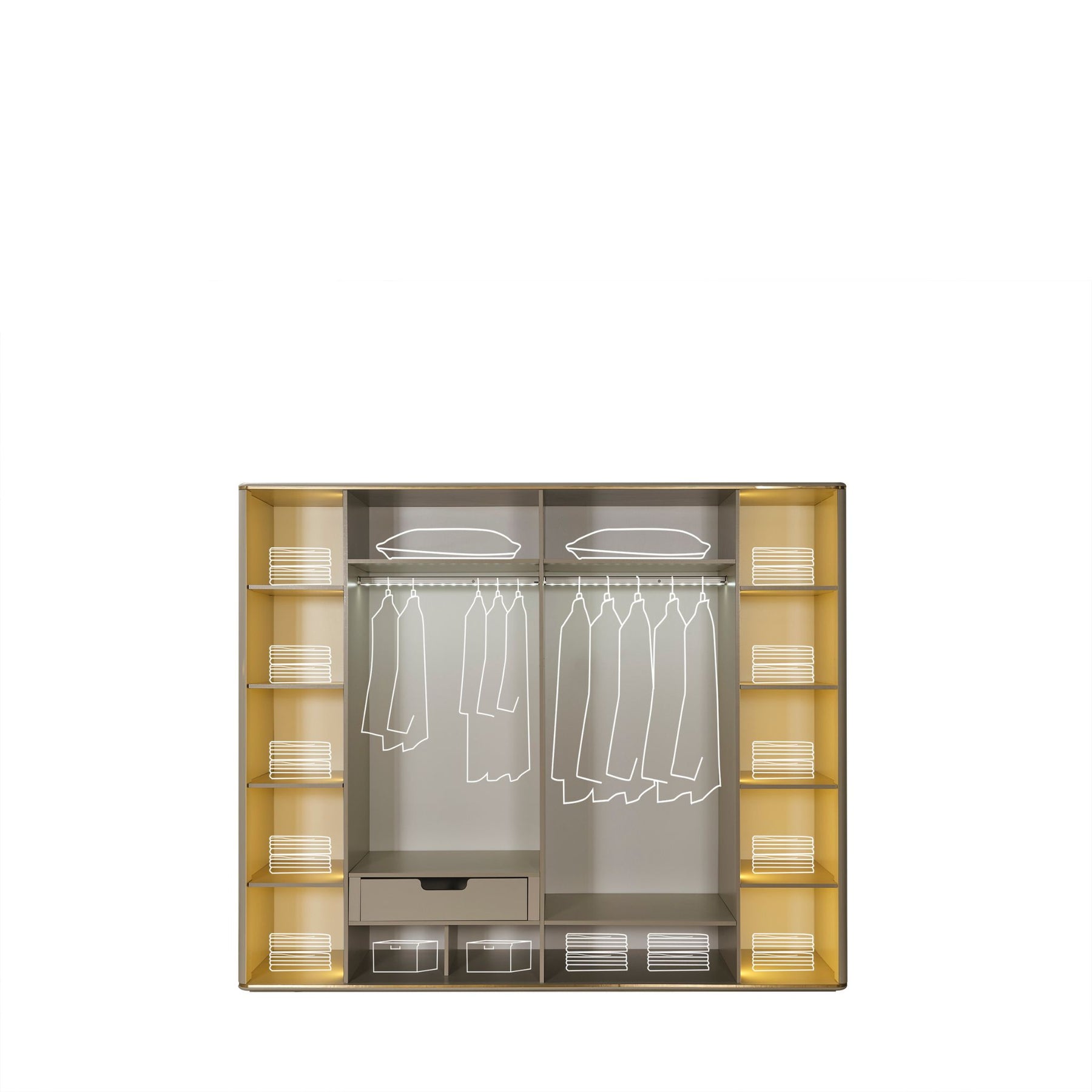 6-türiger Kleiderschrank: Mit zentralen Drehtüren, seitlichen Glasvitrinen und Innenbeleuchtung. Viel Platz für Kleidung, Wäsche und Accessoires.