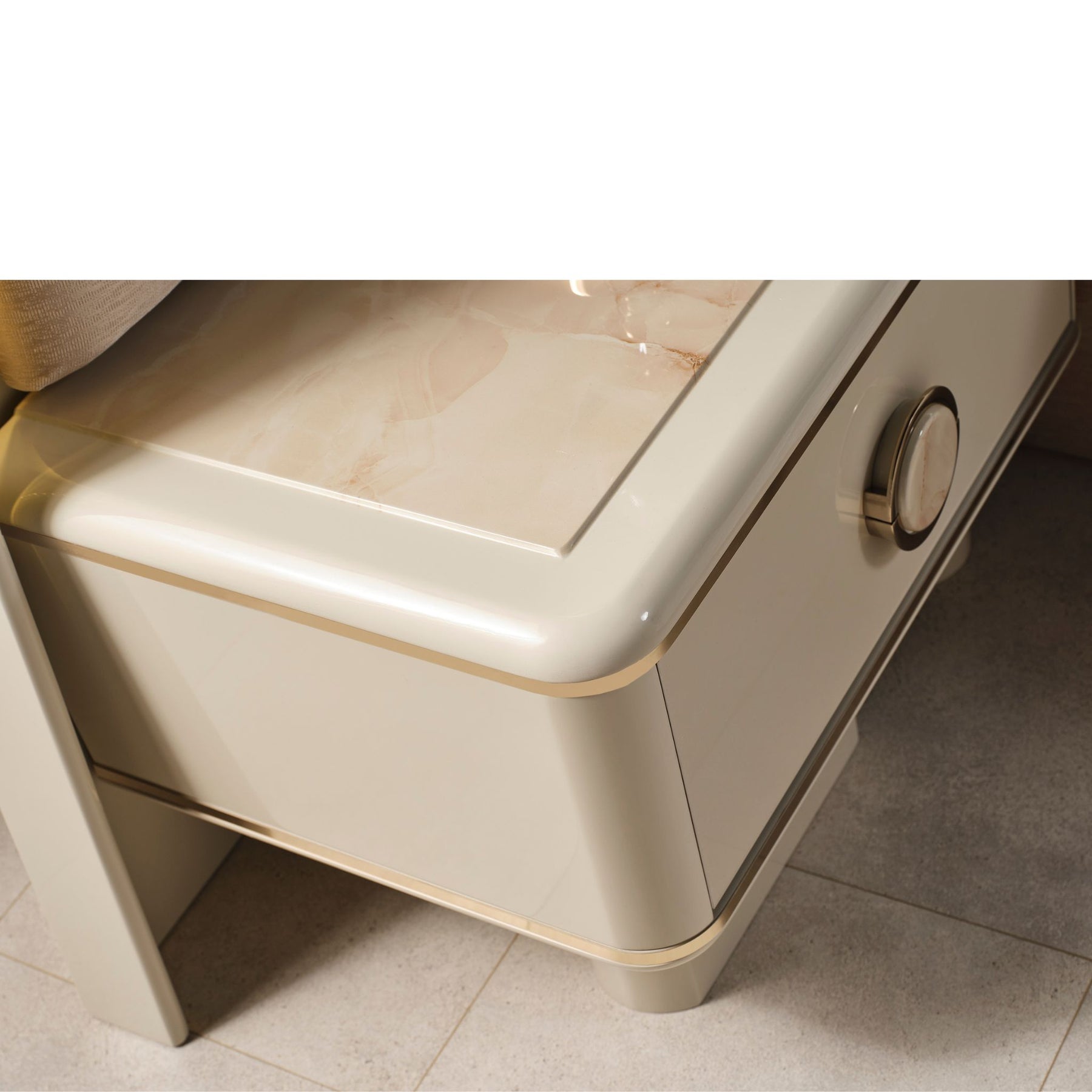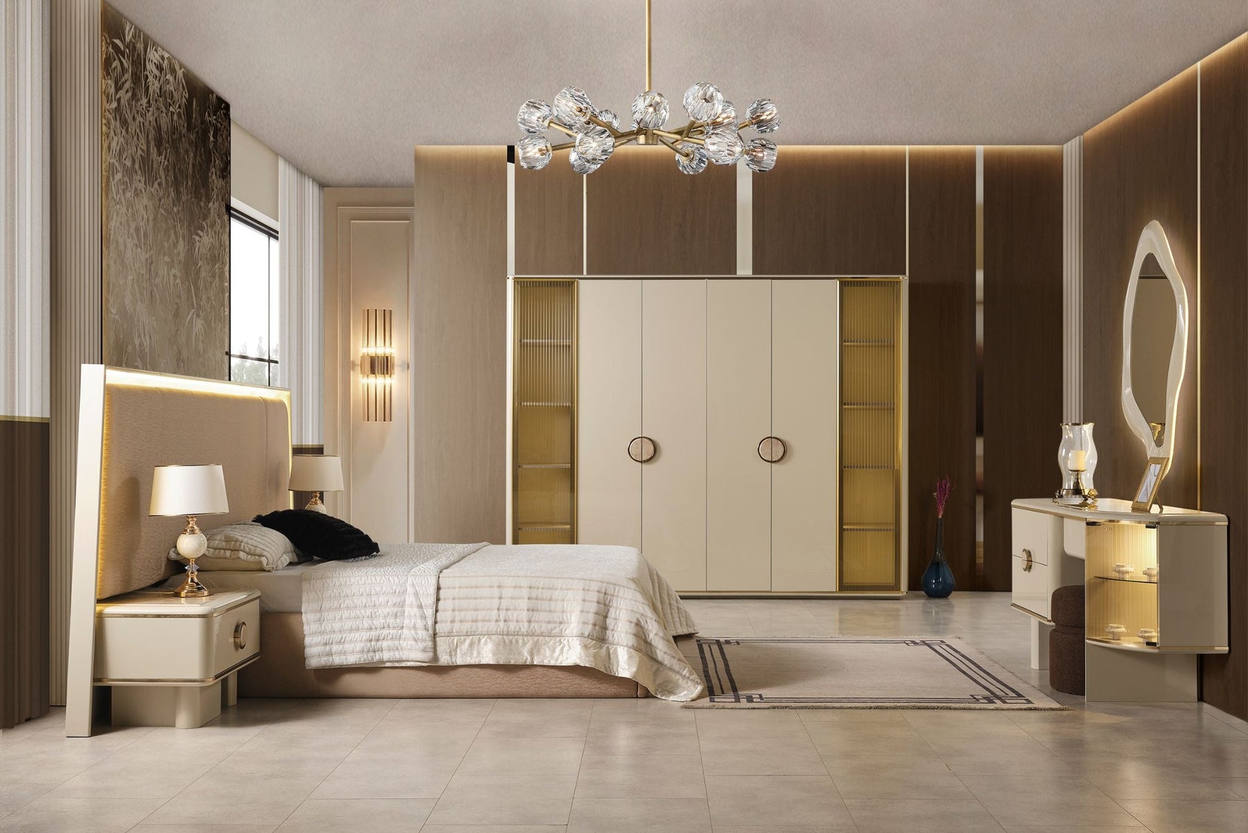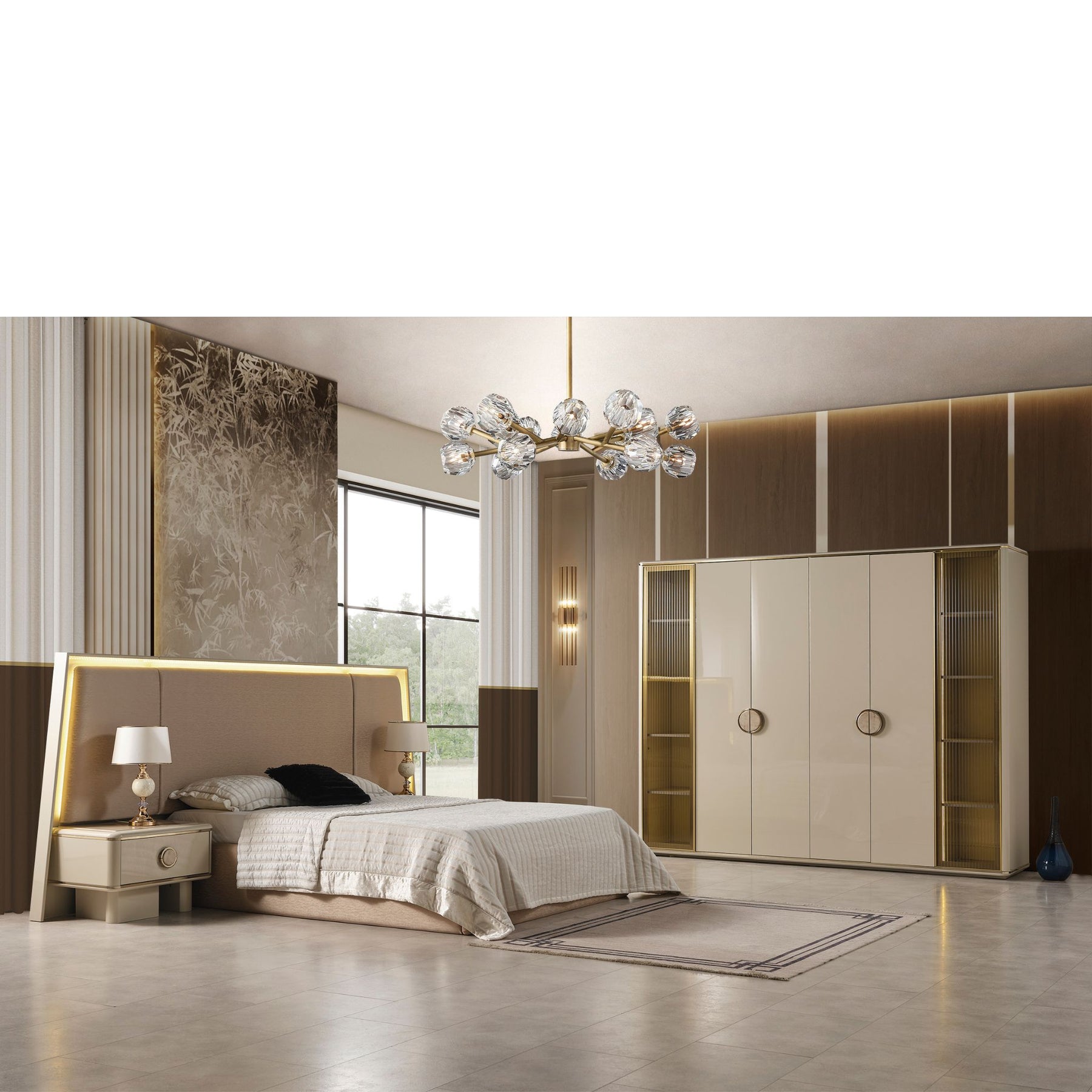 Das Ciragan Schlafzimmer-Set kombiniert Eleganz mit höchstem Komfort und setzt durch seine raffinierten Details stilvolle Akzente. Warme Creme- und Beigetöne, goldene Linien und integrierte Beleuchtung sorgen für eine luxuriöse Atmosphäre, die Ruhe und Harmonie ausstrahlt.