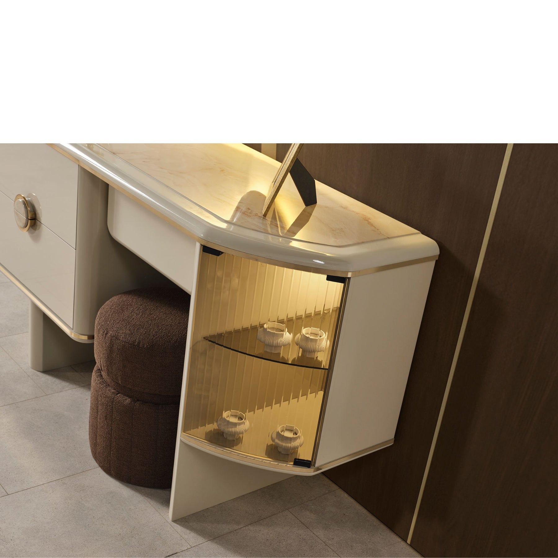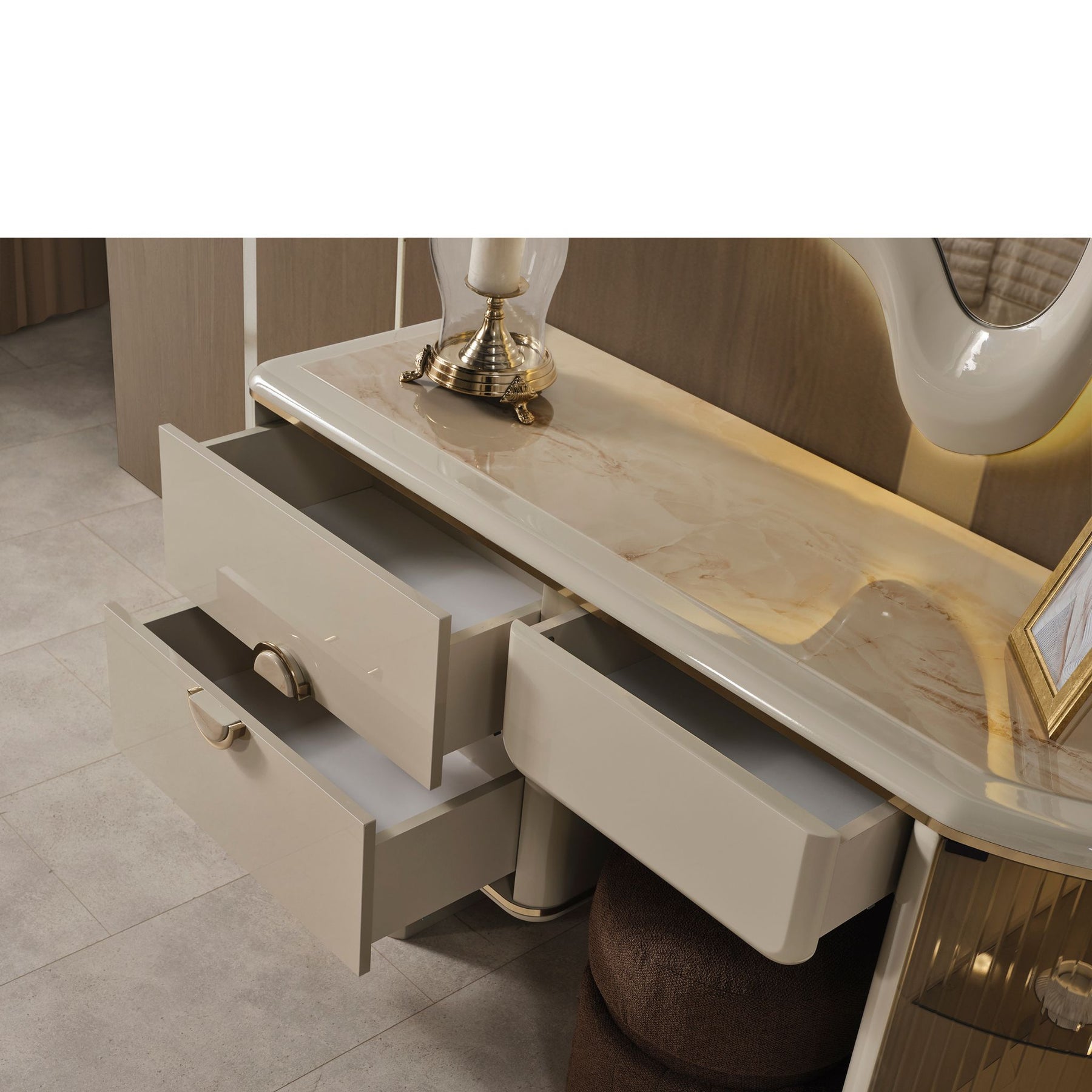 Schminktisch mit geschwungenem Spiegel und Glasvitrine als separates Highlight