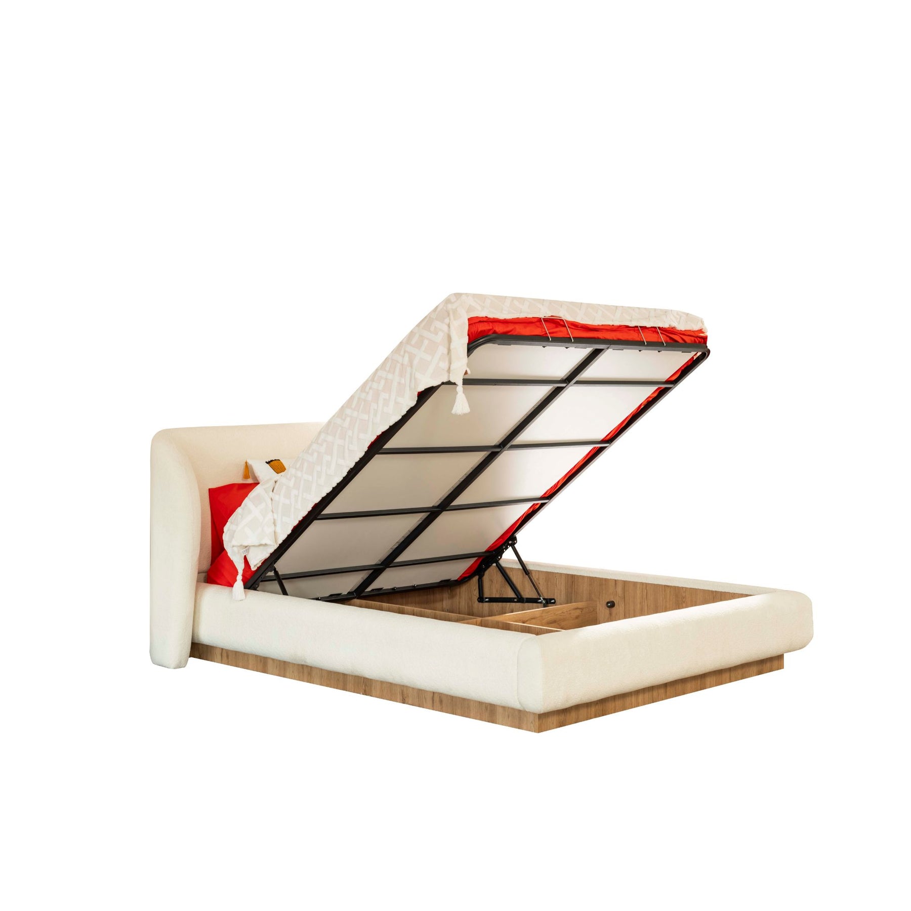 Bett: Gepolstertes Kopfteil mit seitlich gerundeten Ecken. Das Bett verfügt über einen aufklappbaren Bettkasten mit Metallrahmen und Gasdruckfedern.