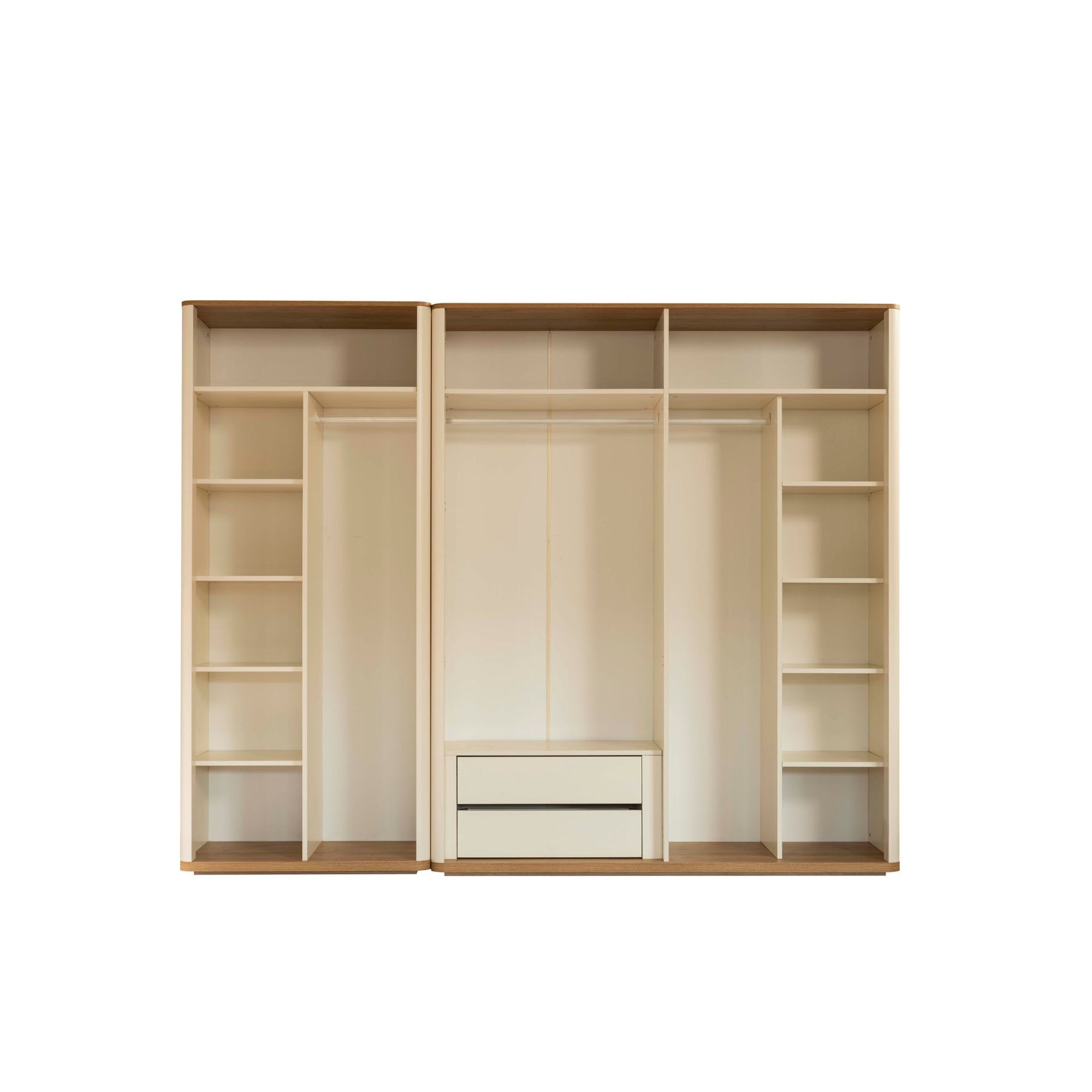 Das Coco Schlafzimmer zeichnet sich durch ein ruhiges, harmonisches Design mit hellen Farbtönen und abgerundeten Formen aus. Die Kombination aus cremefarbenen Fronten, Holzakzenten und klarer Linienführung verleiht dem Raum eine warme und freundliche Atmosphäre.