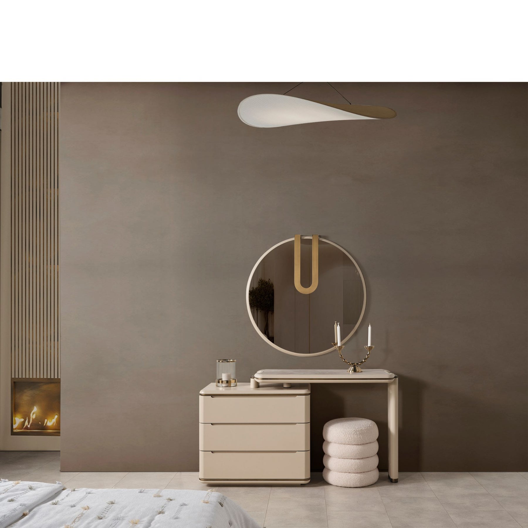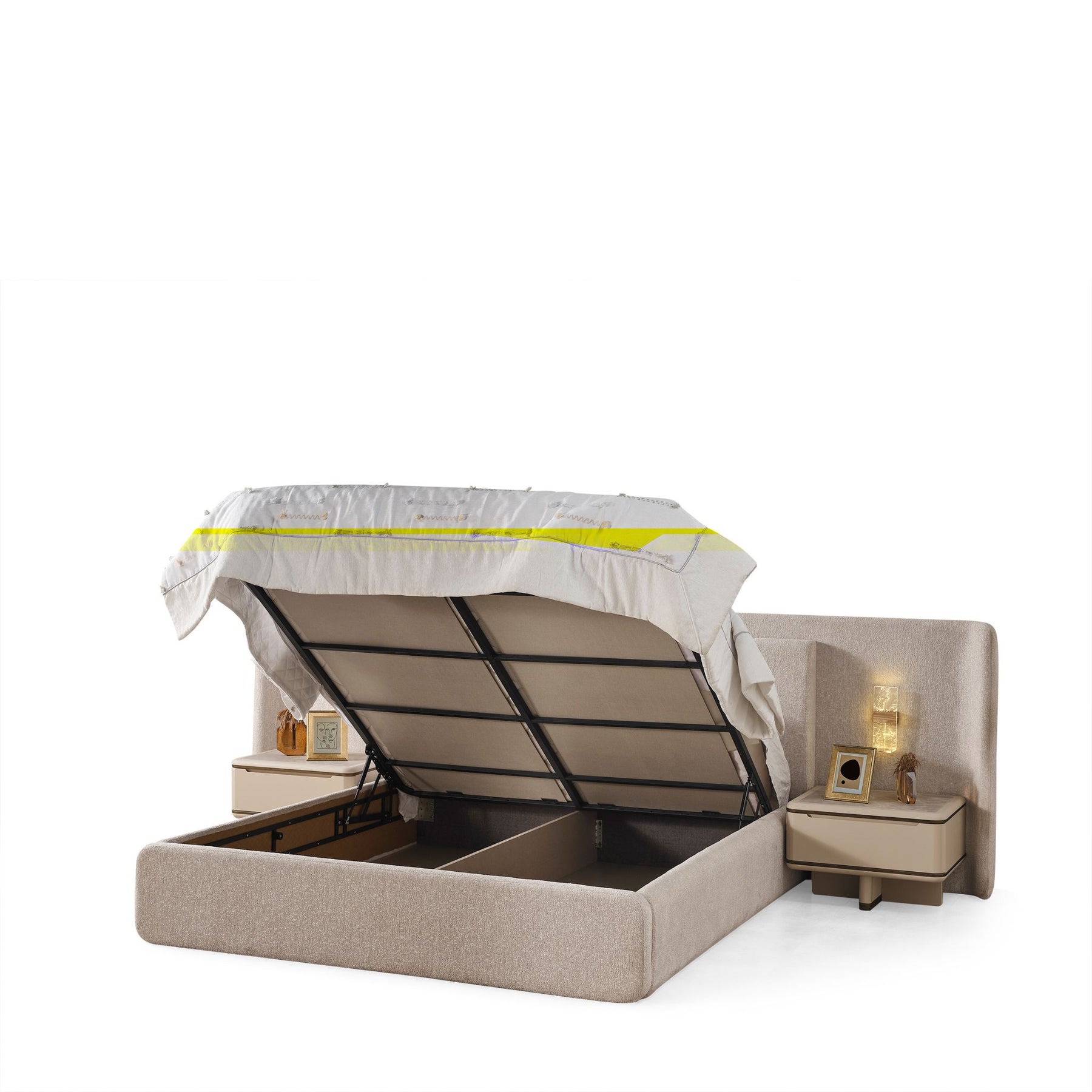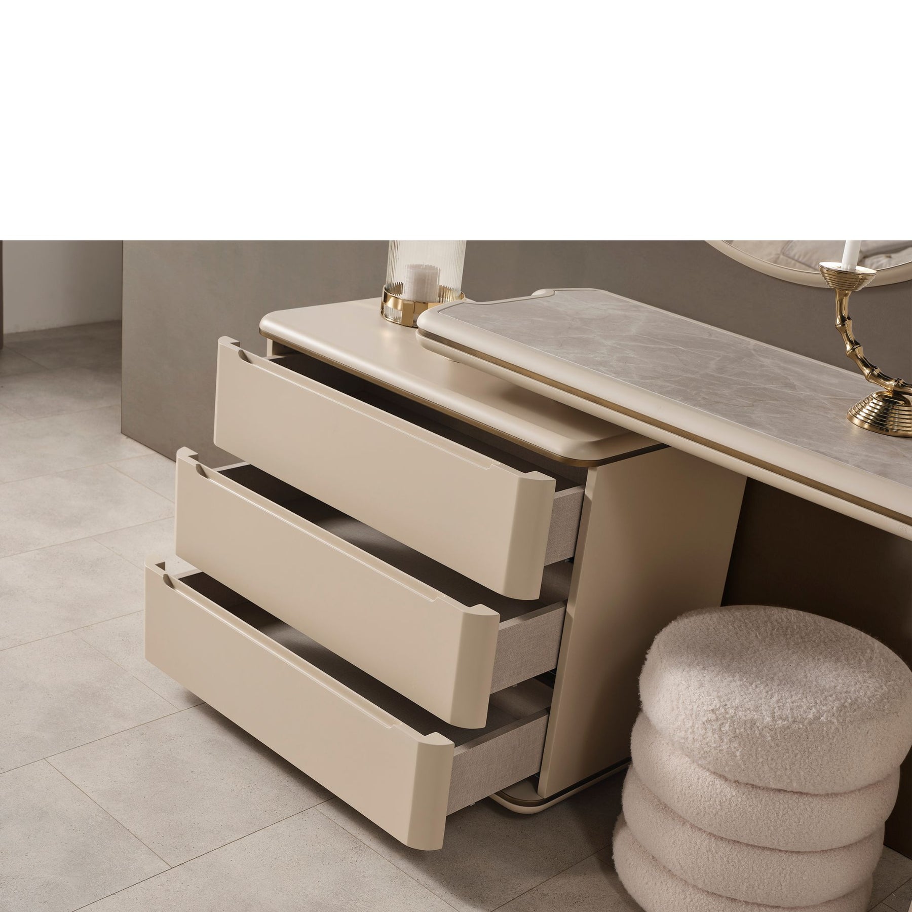 Das Dolunay Schlafzimmer-Set vereint modernes Design mit warmen, eleganten Farbtönen und durchdachter Funktionalität. Die Kombination aus sanften Beigetönen, goldenen Akzenten und hochwertigen Materialien schafft eine ruhige, stilvolle Atmosphäre für erholsame Nächte.