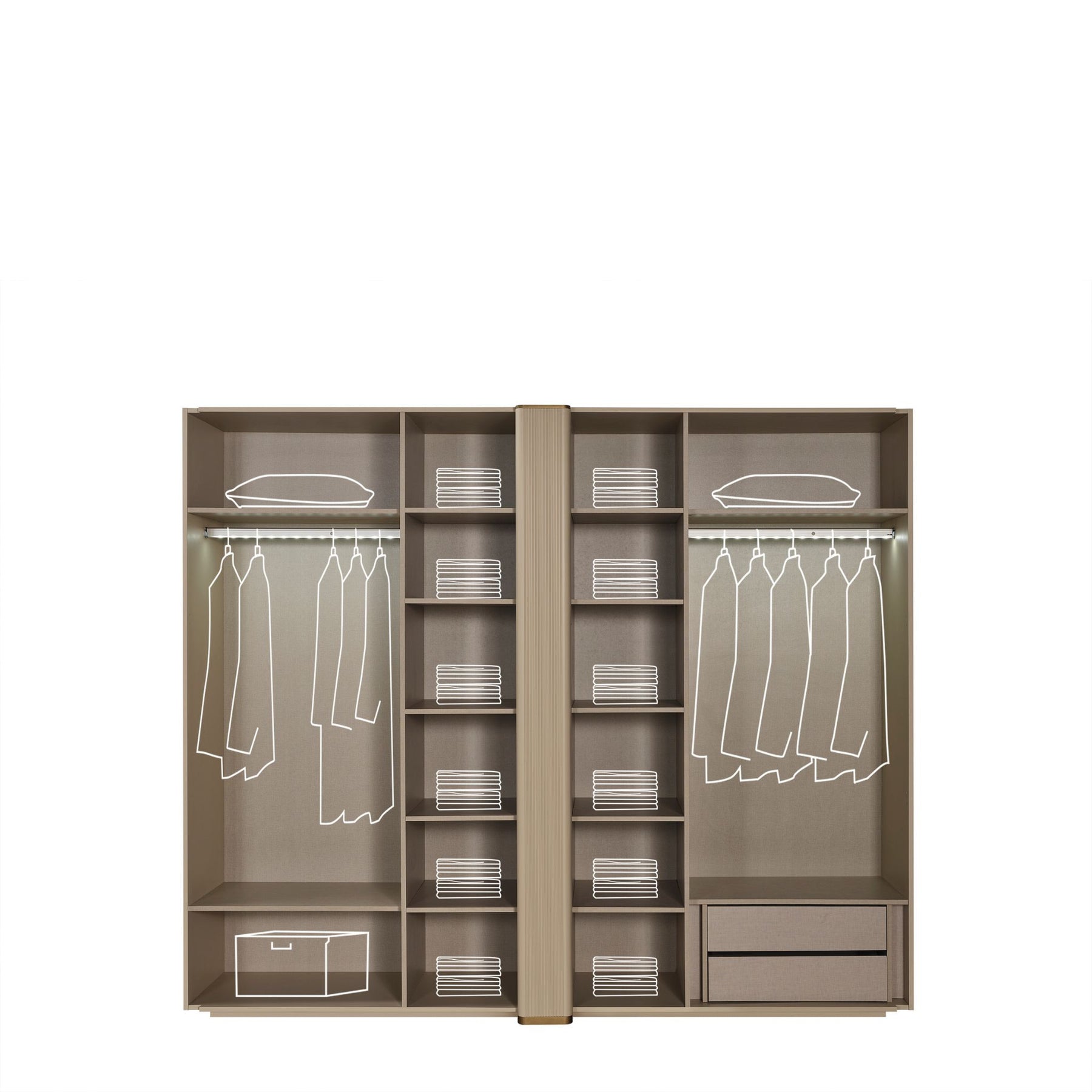 • Kleiderschrank: 6-türig mit Spiegel und strukturierter Mittelpartie, inklusive Kleiderstangen, Einlegeböden und Schubladen.