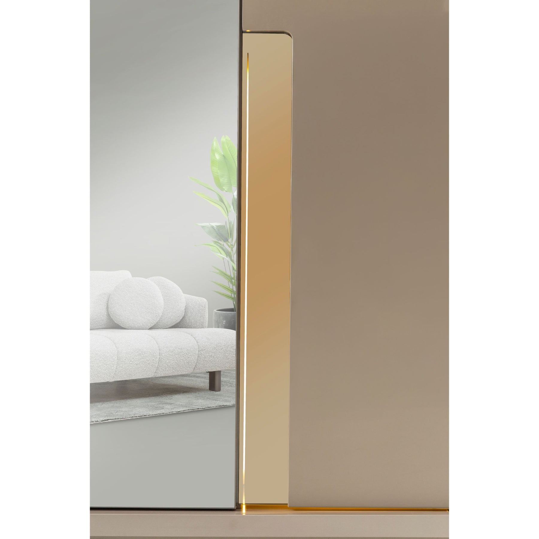 Das Zusammenspiel aus hellen Farbtönen, Spiegelglas und abgerundeten Formen schafft ein stilvolles Ambiente, das Ruhe und Eleganz ausstrahlt.