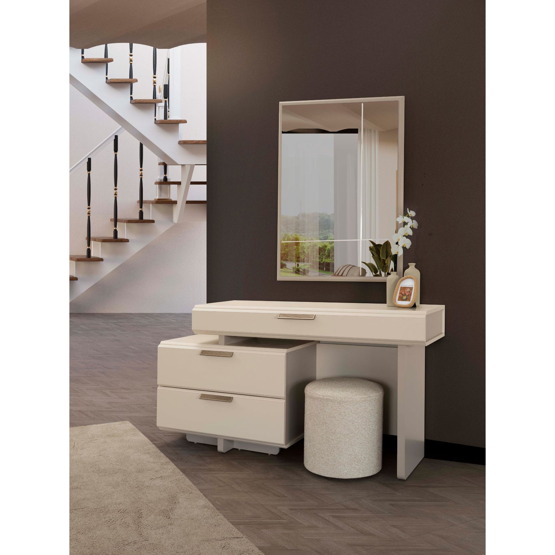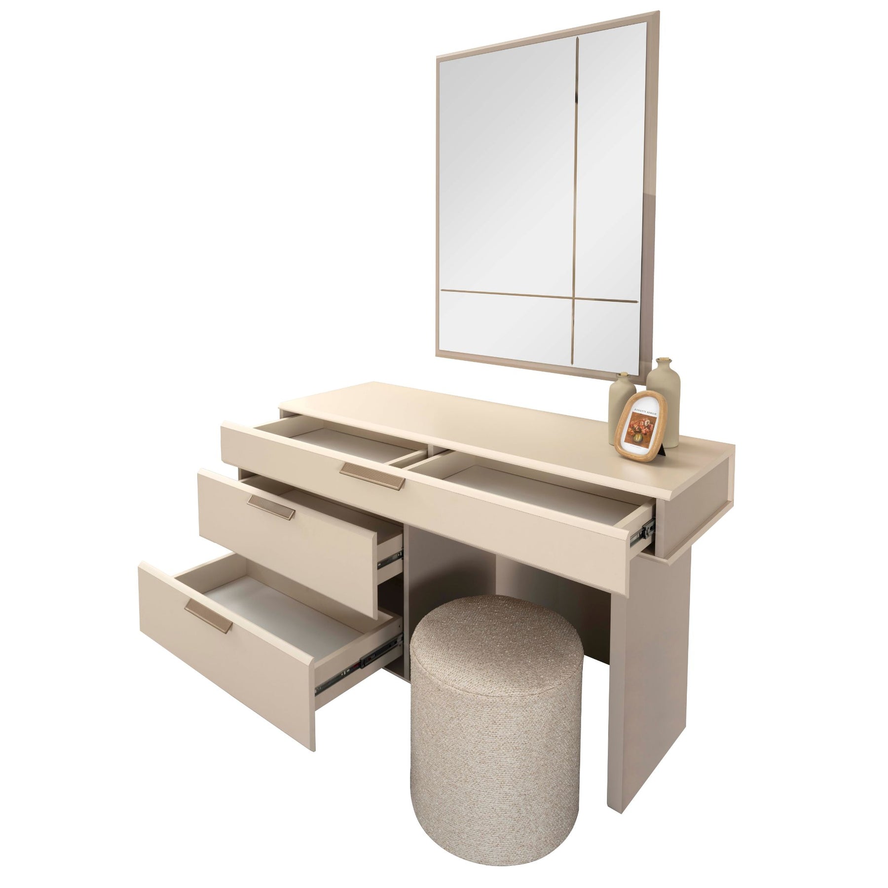 Schminktisch mit Spiegel: Breite Ablagefläche, mehrere Schubladen und rechteckiger Spiegel im passenden Design.