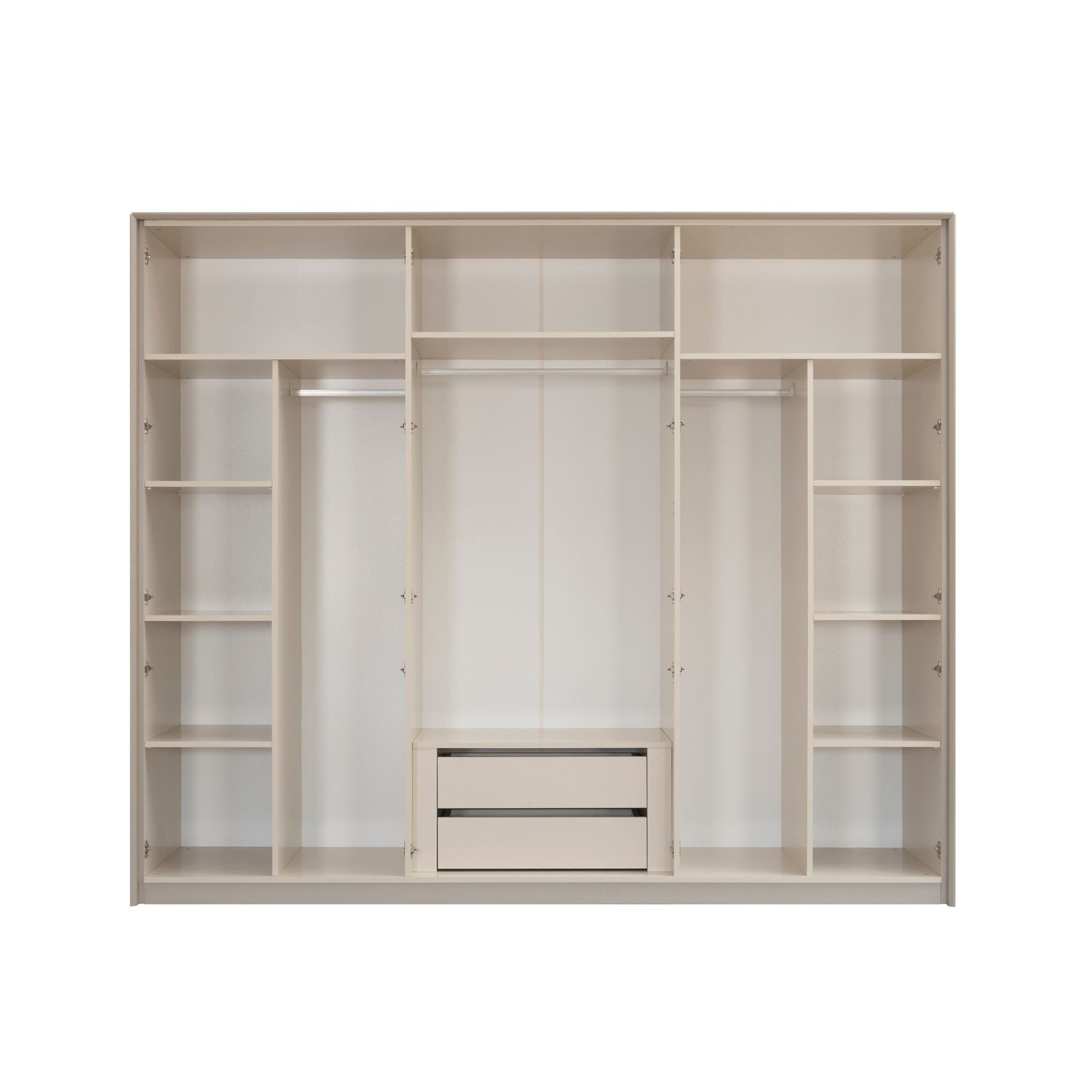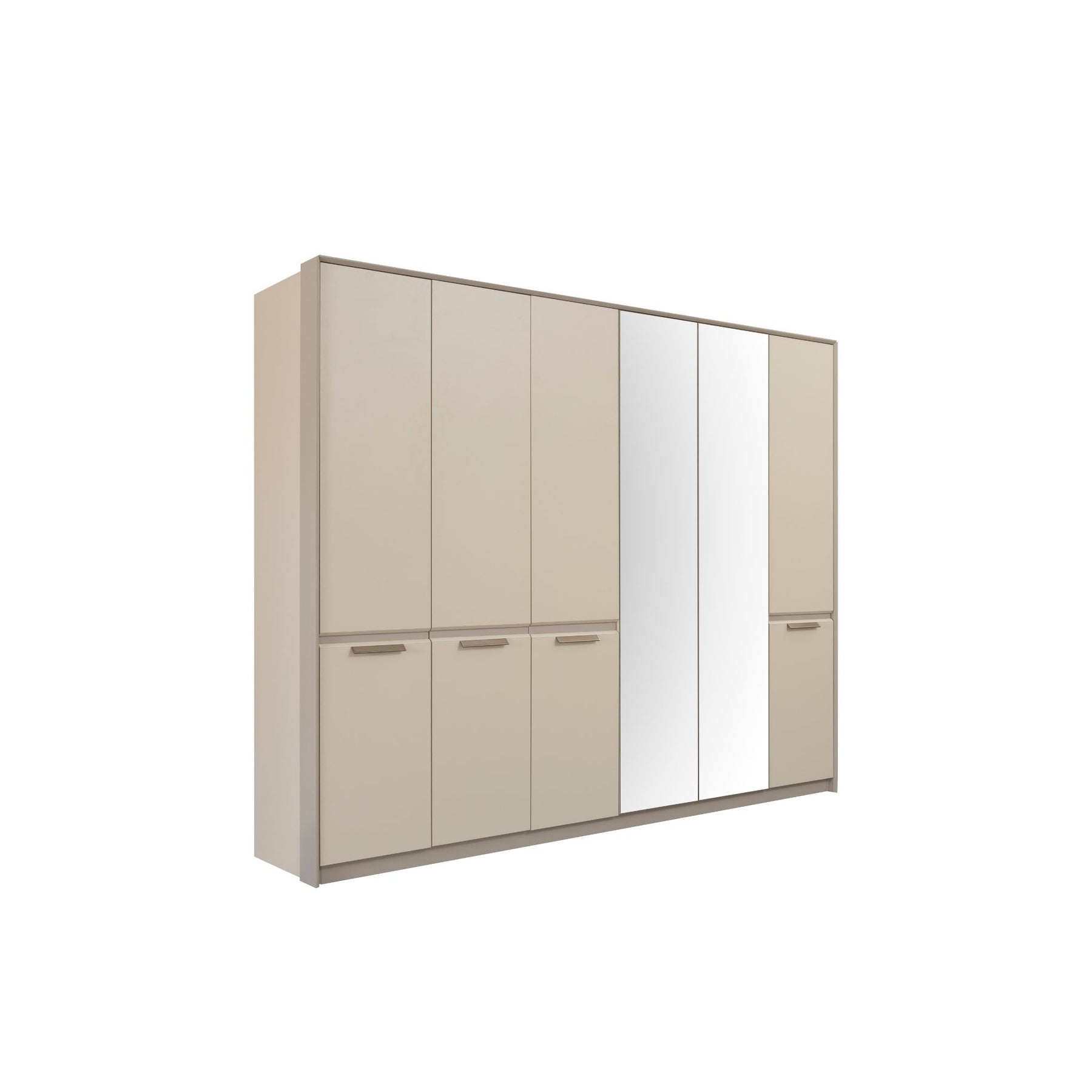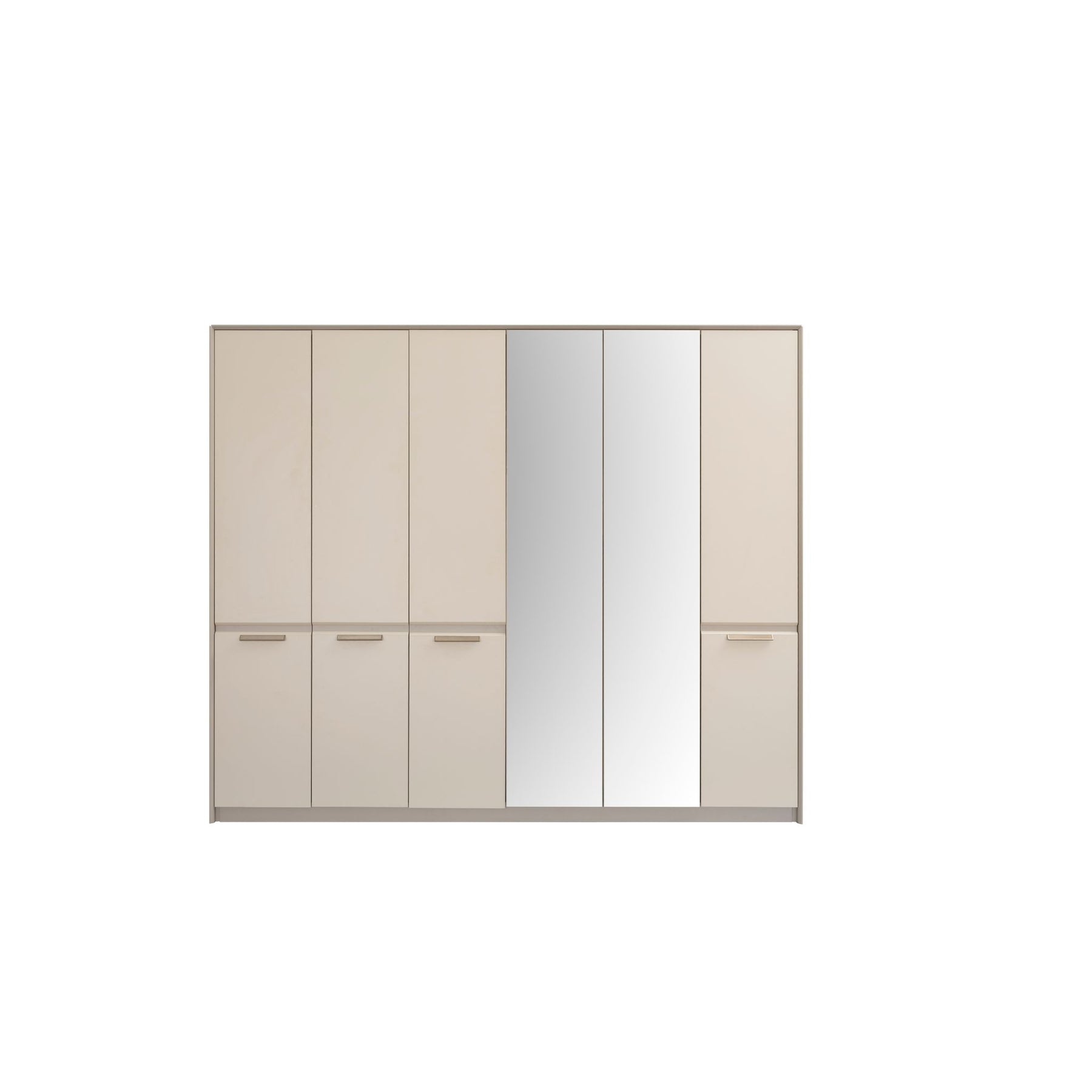 Kleiderschrank: Mehrtürig mit Spiegelelement in der Mitte. Dezente, waagerechte Griffe und glatte Fronten sorgen für ein modernes Erscheinungsbild.