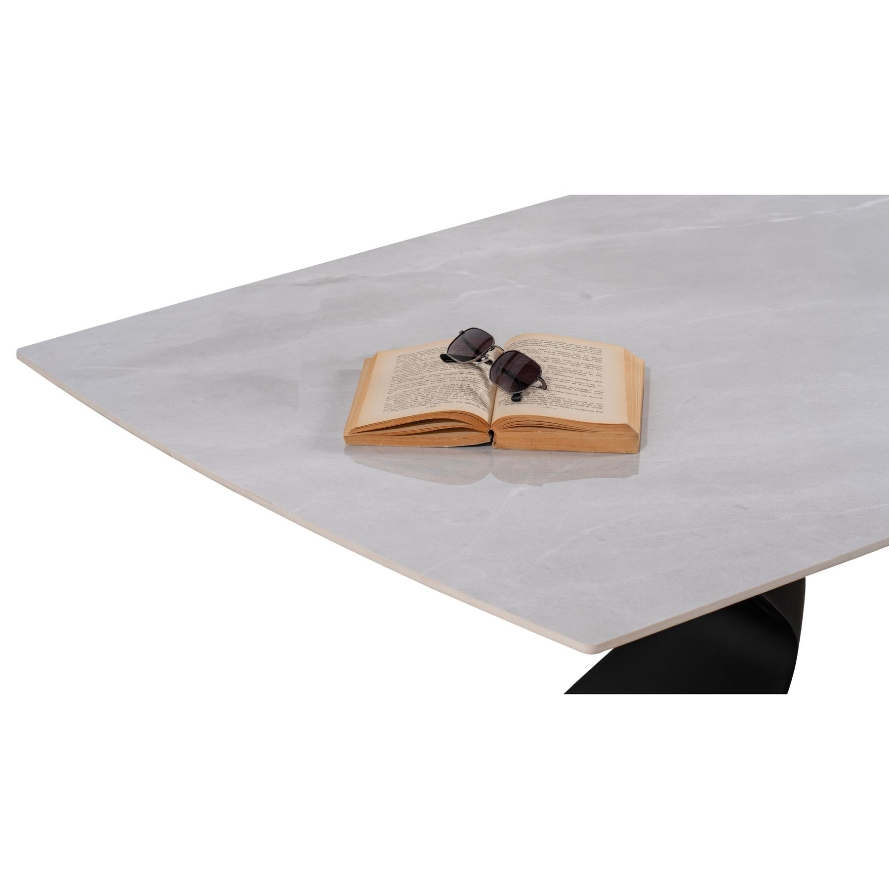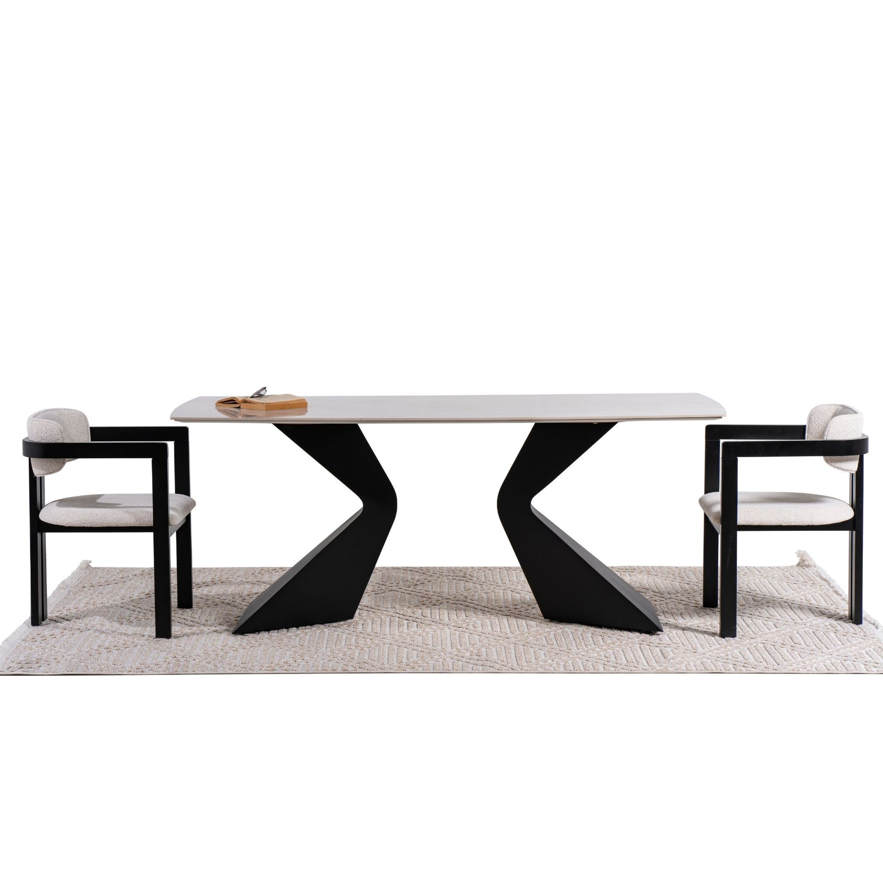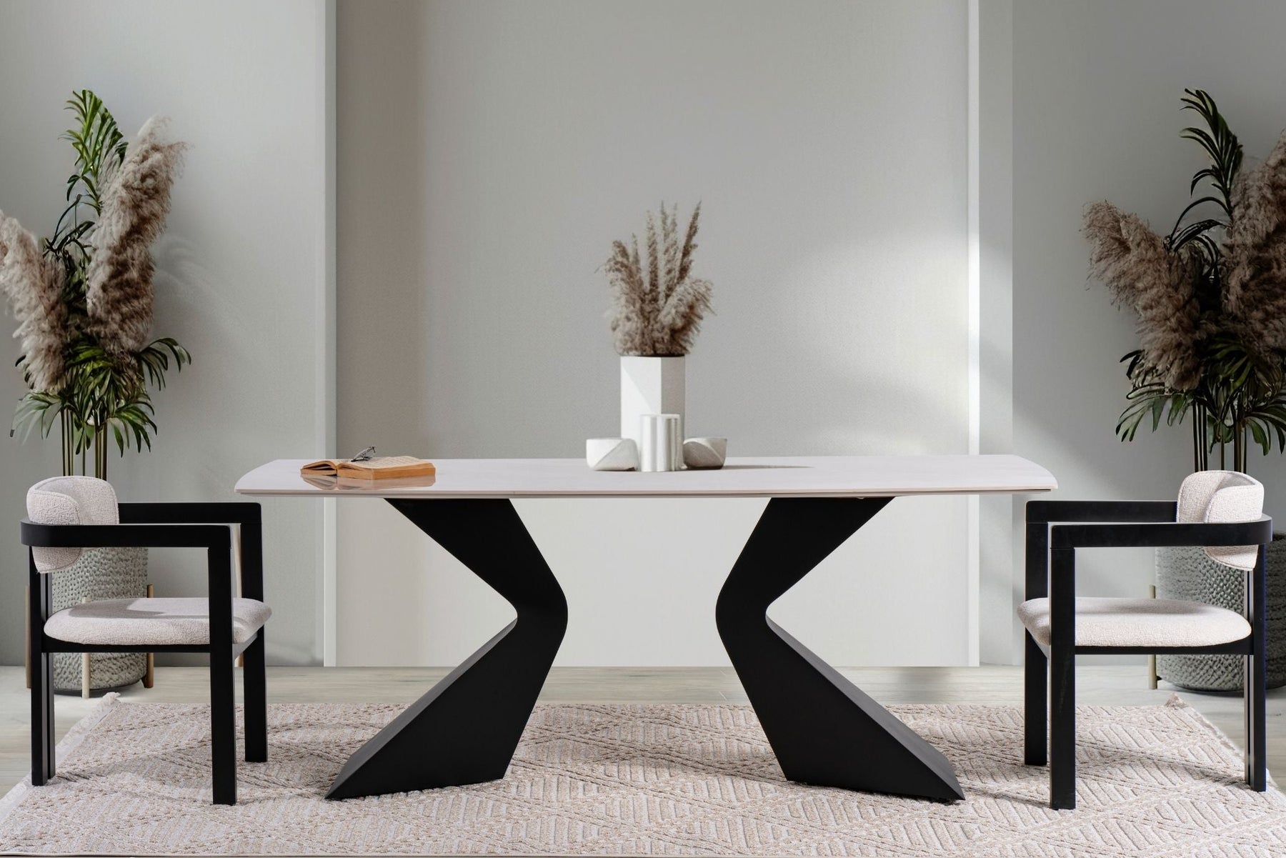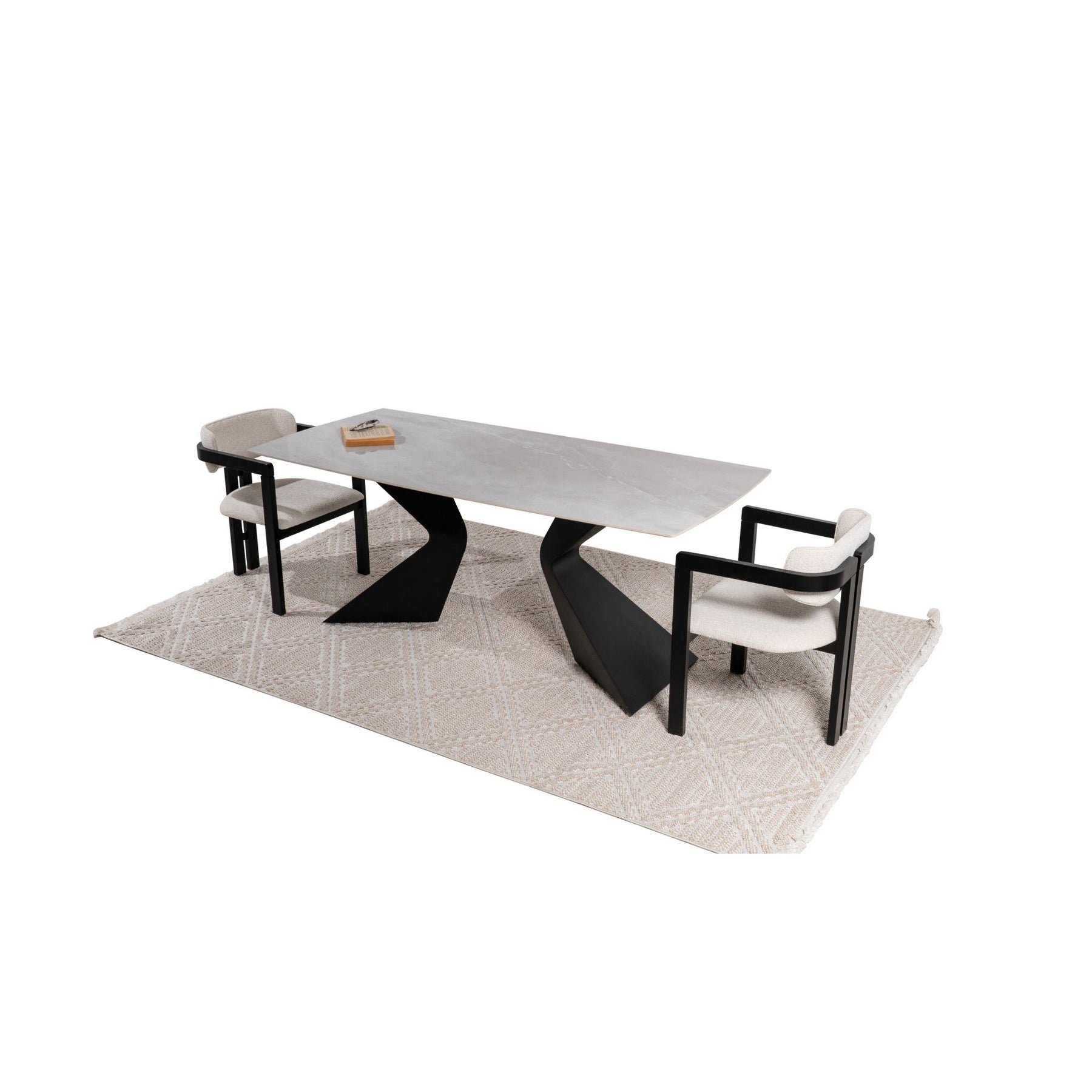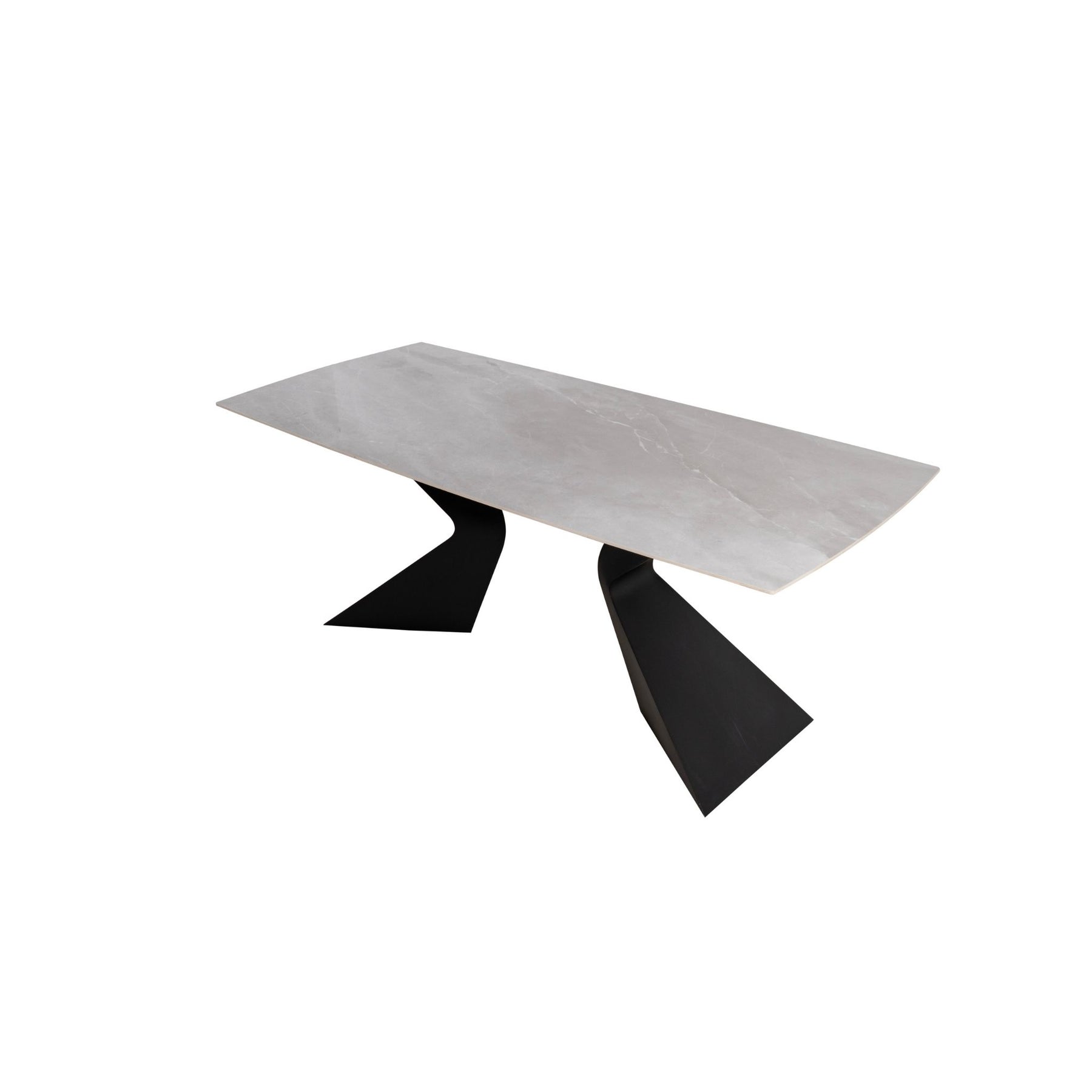 Die massive Keramikplatte sorgt für eine elegante, pflegeleichte Oberfläche, während das geometrisch geformte Metallgestell für Stabilität und einen modernen Charakter steht.