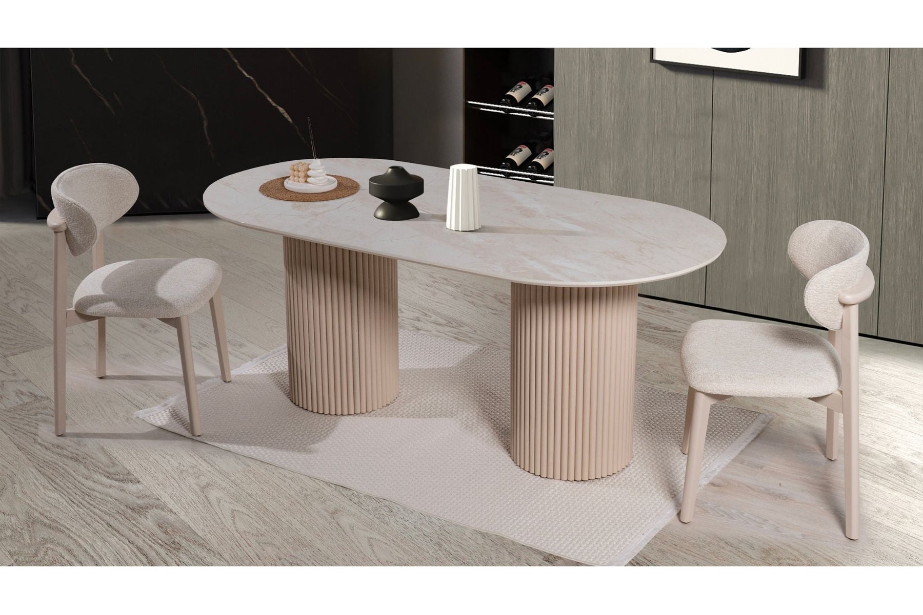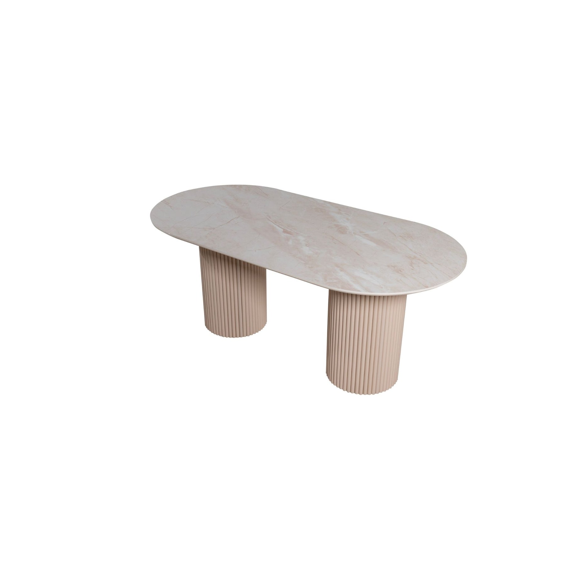 Die digital bedruckte Tischplatte verleiht ihm eine exklusive Marmor- oder Steinoptik, während das stabile Holzgestell mit seinen zwei zylindrischen Säulen für festen Stand und zeitlose Eleganz sorgt.
