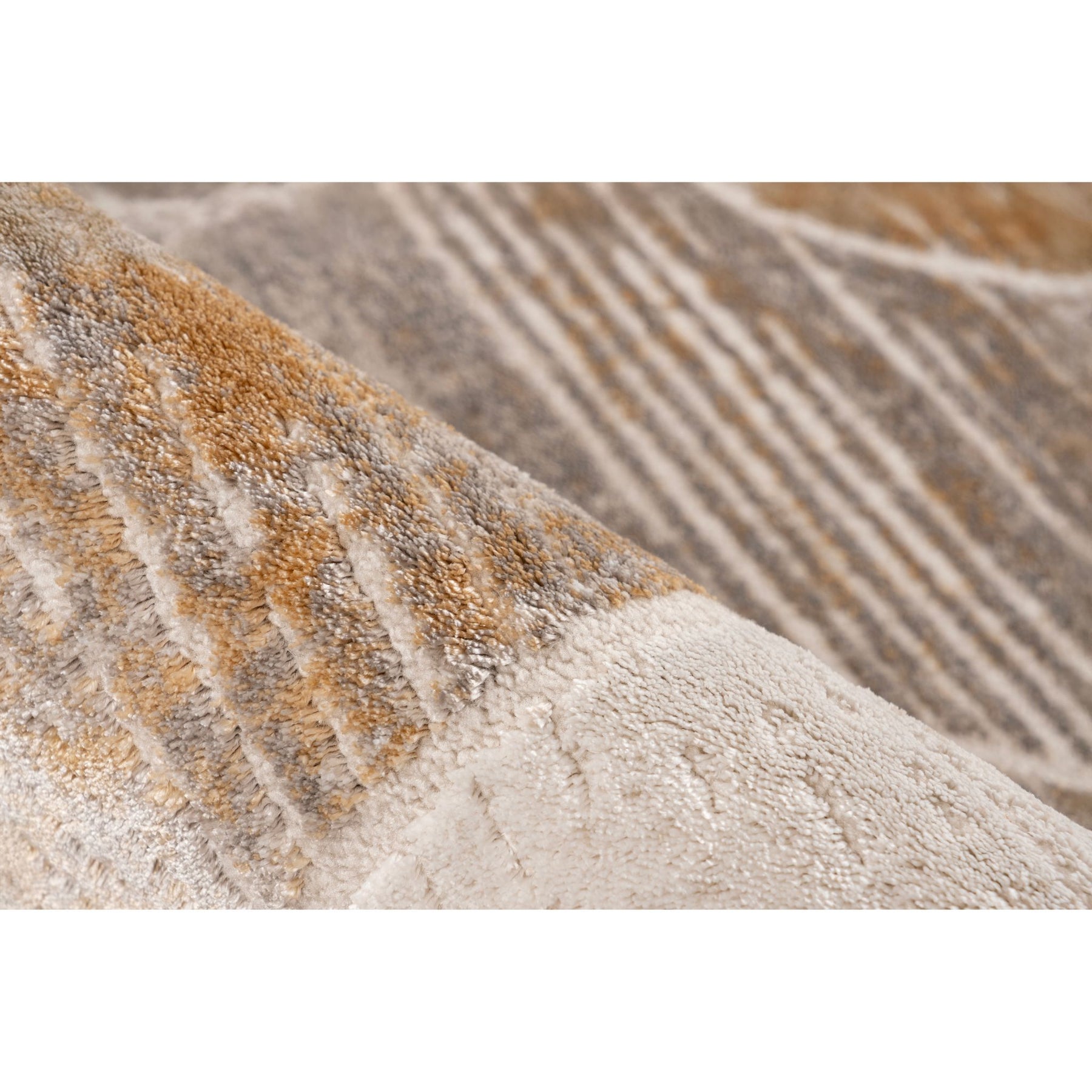 Der Modena 602 Gold verbindet ein markantes Rundbogen-Motiv mit warmen Goldakzenten und sanften Grau- und Beigetönen. Das Design wirkt dynamisch und gleichzeitig harmonisch, wodurch der Teppich zum Blickfang in modernen Wohnräumen wird. Die weiche Oberfläche sorgt für ein angenehm sanftes Laufgefühl und bringt Komfort in Wohnzimmer, Schlafzimmer oder Flure. Durch die Shrink-Garn-Verarbeitung entsteht ein feiner 3D-Effekt, der dem Muster mehr Tiefe und Struktur verleiht. Die hochwertige Polyesterqualität bietet Formstabilität, Langlebigkeit und eine pflegeleichte Handhabung. Die hohe Punktdichte sorgt für eine detailreiche und klare Optik.