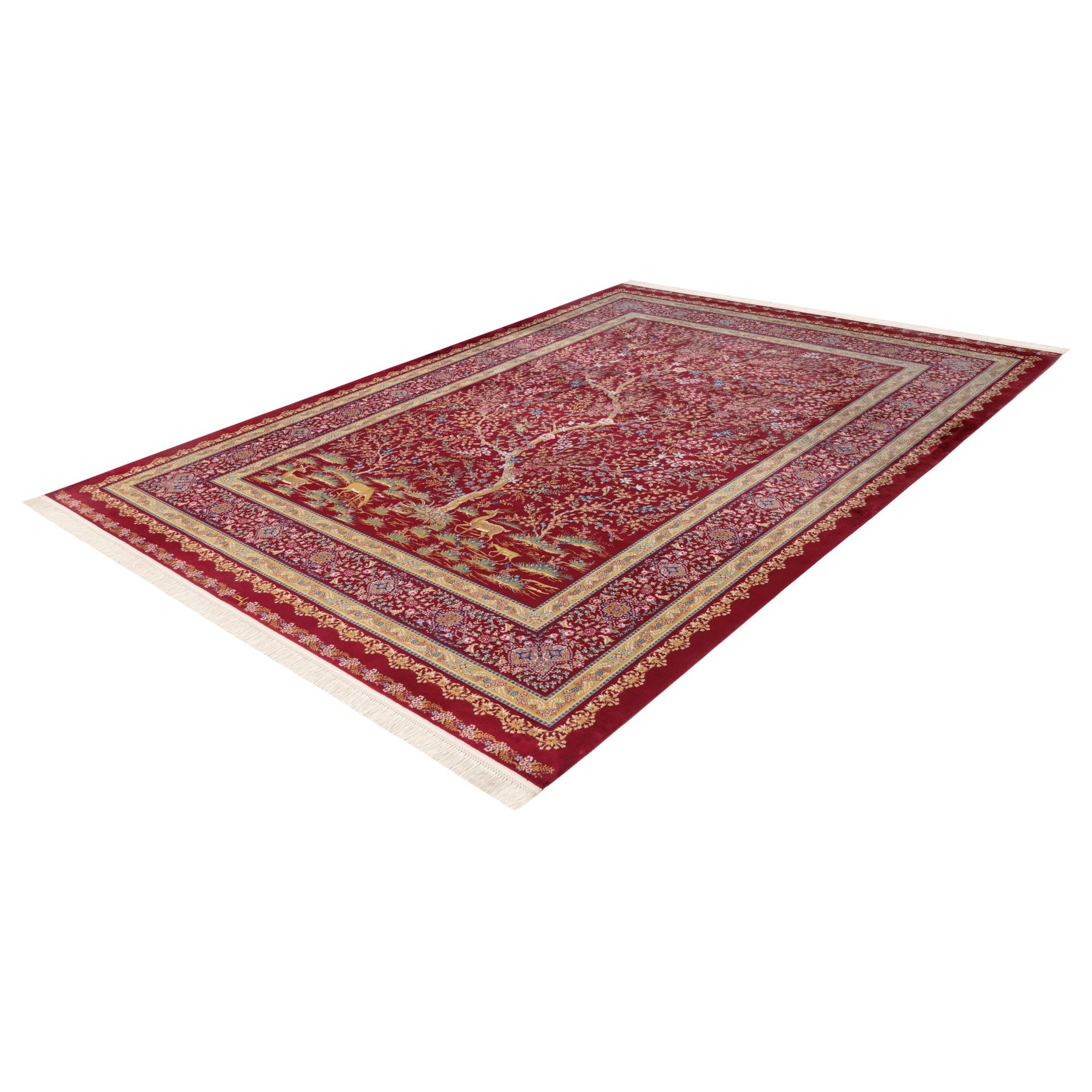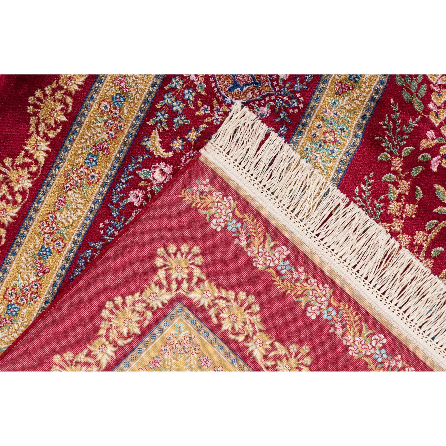 Der Portofino 903 Red kombiniert einen satten, klaren Rotton mit fein ausgearbeiteten Ornamentstrukturen, die dem Teppich eine besonders edle und traditionelle Ausstrahlung verleihen. Im Zentrum befindet sich ein detailliertes Motivfeld, das von einer gold- und cremefarbenen Bordüre stilvoll eingerahmt wird. Die natürlichen Modalfasern sorgen für einen dezenten, seidigen Glanz, der je nach Lichteinfall elegant schimmert. Mit seiner extrem hohen Punktdichte zeigt der Teppich eine außergewöhnlich präzise Musterung. Die weiche Oberfläche in Kombination mit den klassischen Fransen macht ihn ideal für Wohnräume, Essbereiche oder repräsentative Zimmer.