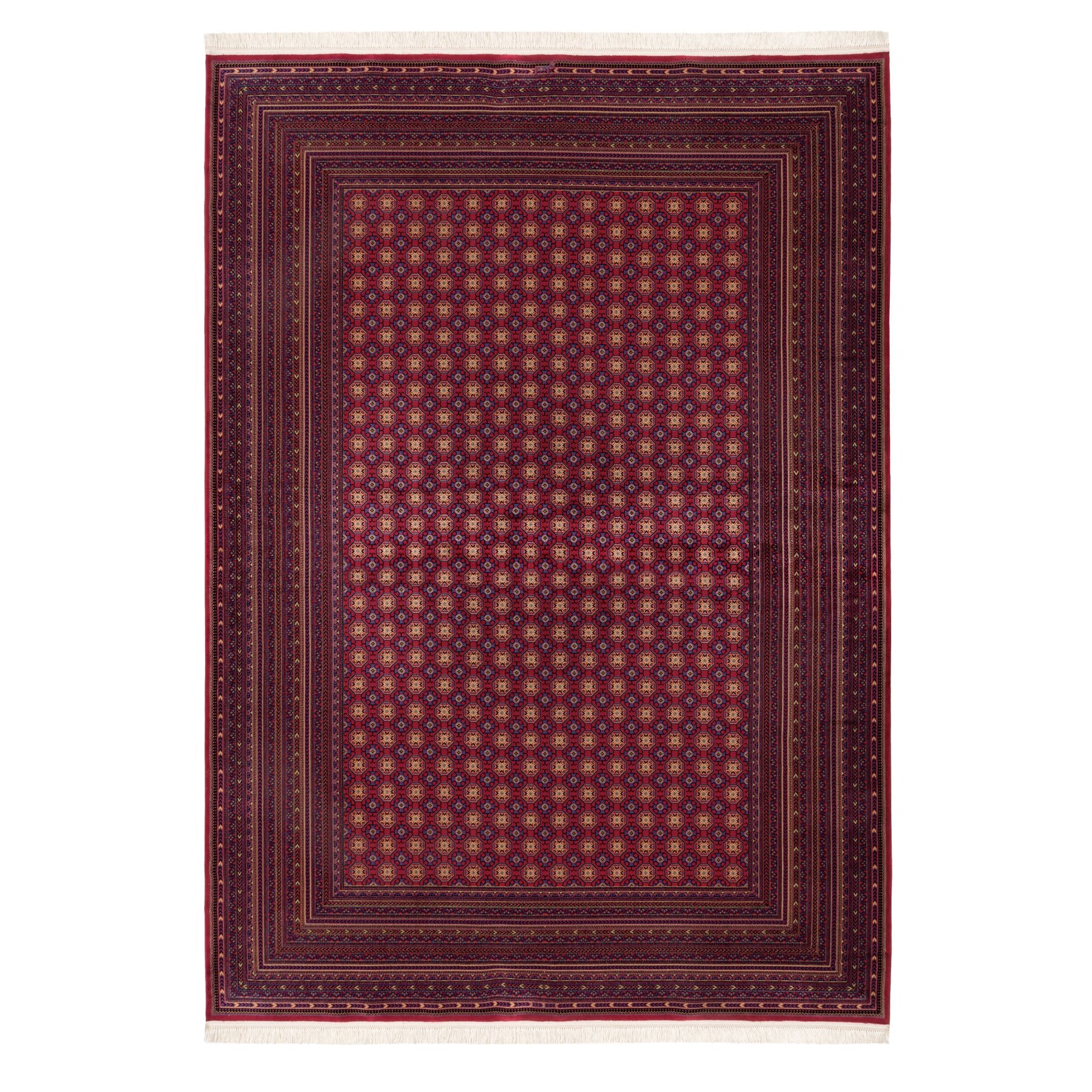Der Portofino 904 Red präsentiert ein fein wiederholtes, traditionell angelegtes Ghashghai-Muster auf einem tiefroten Grund, das dem Teppich eine ruhige, geordnete und zugleich hochwertige Ausstrahlung verleiht. Die umlaufende Bordüre in warmen Gold-, Beige- und Naturtönen sorgt für einen eleganten Rahmen und verstärkt den klassischen Charakter. Durch den Einsatz von 100% Modalfasern entsteht ein dezenter Seidenglanz, der die Musterung je nach Lichteinfall besonders klar hervorhebt. Die extrem hohe Dichte ermöglicht eine präzise Detaildarstellung, während die weiche Haptik und die typischen Fransen den luxuriösen Gesamteindruck abrunden. Ideal für Wohnräume, Essbereiche und repräsentative Innenräume.