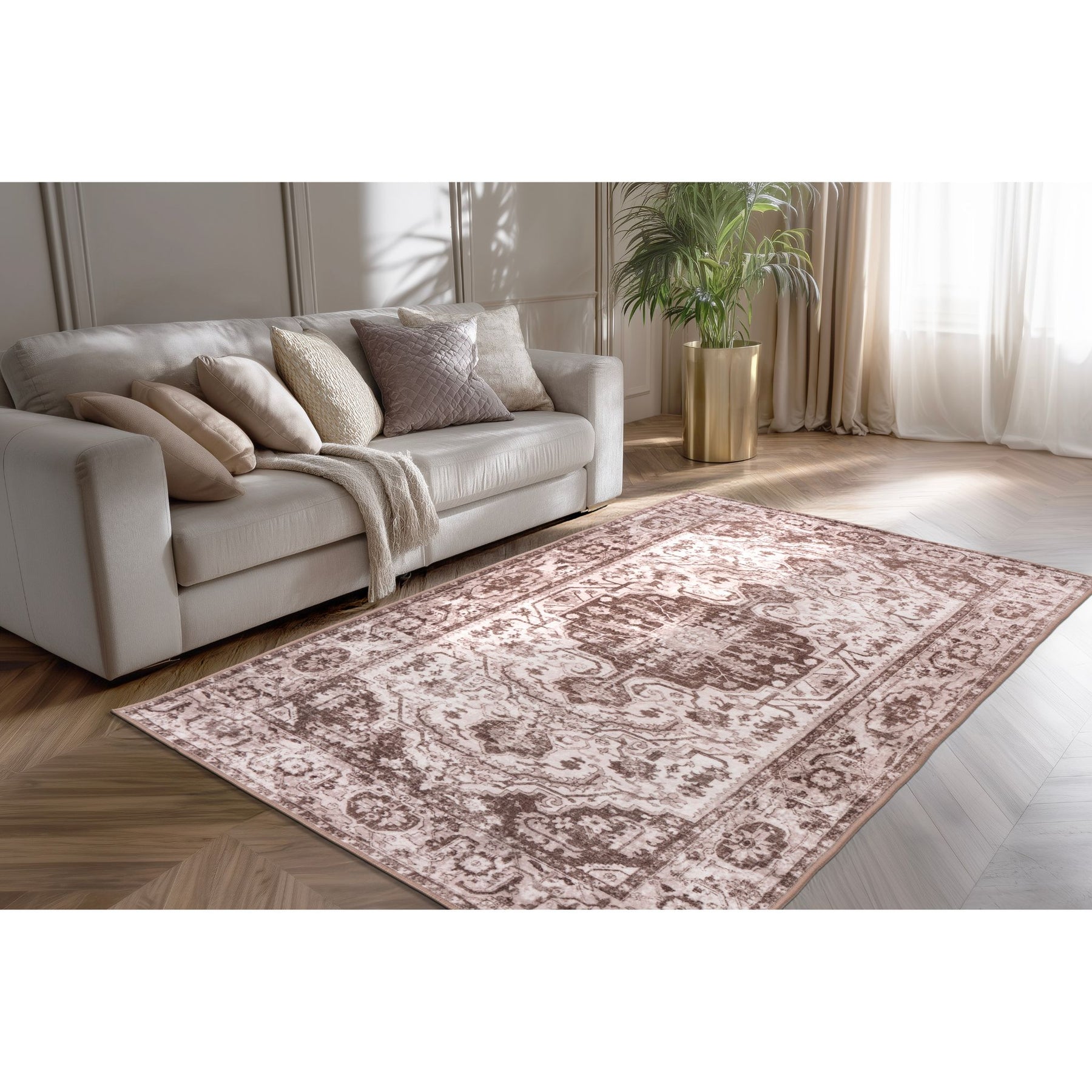 Der Vegas 201 Taupe verbindet ein traditionell angehauchtes Muster mit modernen, warmen Taupe-Nuancen. Der präzise Digitaldruck bringt die ornamentreichen Details klar zur Geltung und verleiht dem Teppich eine hochwertige, fein abgestimmte Optik. Die 100% Polyester-Oberfläche bietet eine angenehm weiche Haptik, während die flache Gesamthöhe eine einfache Pflege ermöglicht. Durch die Anti-Slip-Rückseite liegt der Teppich stabil auf dem Boden und eignet sich ideal für Wohnräume, Schlafbereiche, Flure und Esszimmer. Die hohe Dichte sorgt für ein sauberes, kontrastreiches Bild, das sich harmonisch in unterschiedliche Einrichtungsstile einfügt. Dank Maschinenwaschbarkeit ist er zudem besonders alltagstauglich.