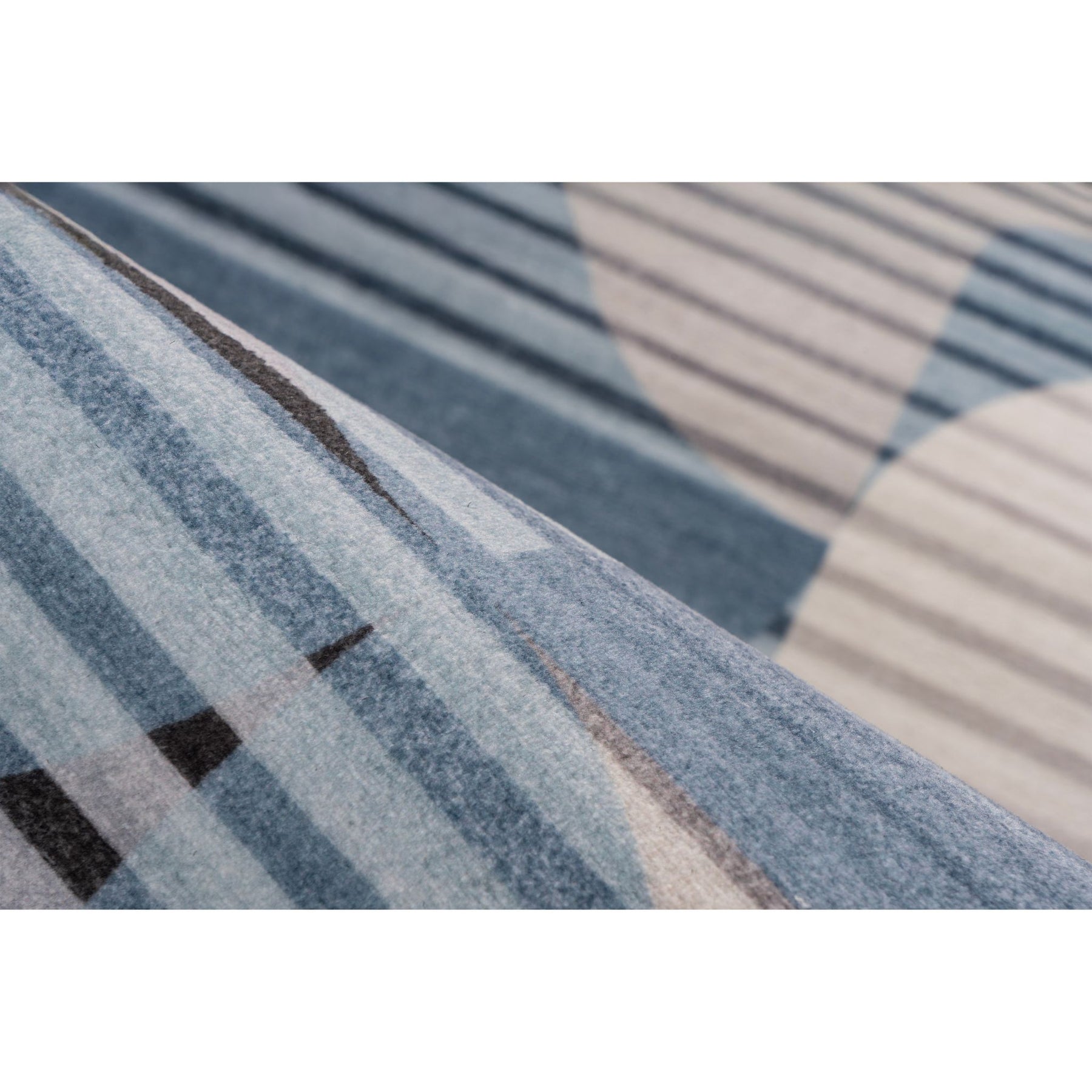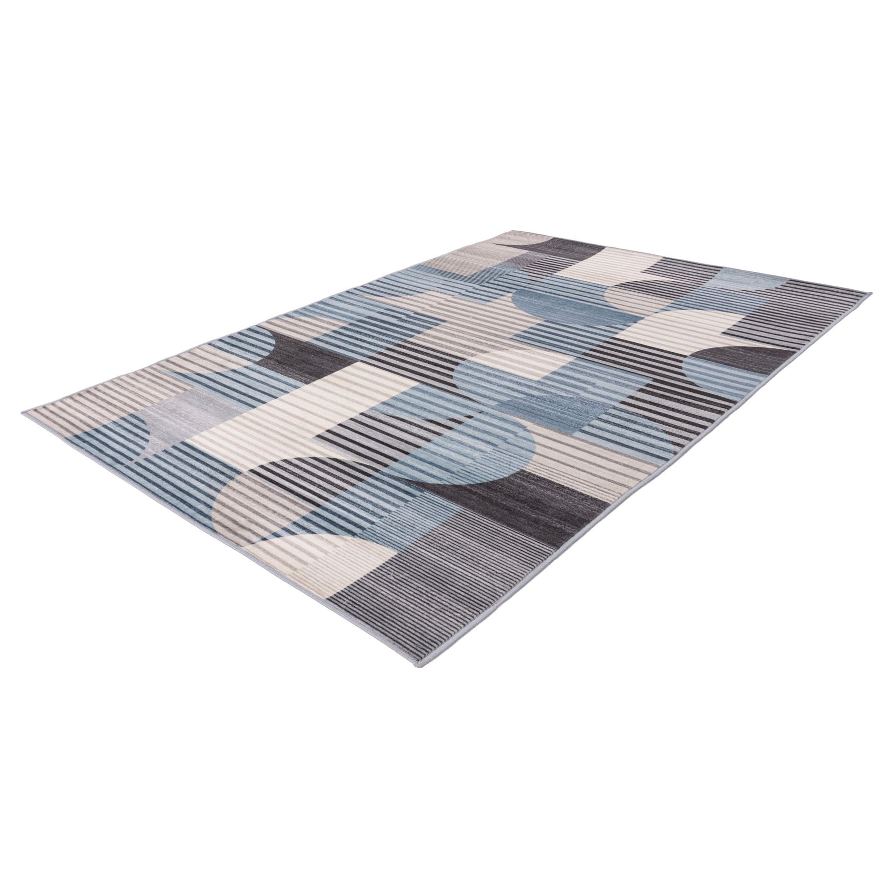 Der Vegas 204 Blue kombiniert ein dynamisches, geometrisches Design mit einer harmonischen Farbwelt aus Blau-, Grau- und Naturtönen. Die Mischung aus Streifen, Rundungen und präzisen Linien schafft eine moderne, klar strukturierte Optik, die jedem Raum eine frische und zeitgemäße Note verleiht. Durch die hochwertige Digitaldrucktechnik wirken die Formen besonders sauber und kontrastreich. Der Polyesterflor fühlt sich angenehm weich an, während die flache Gesamthöhe eine einfache Pflege ermöglicht. Dank Anti-Slip-Rückseite bleibt der Teppich sicher an seinem Platz – ideal für Wohnzimmer, Schlafzimmer, Essbereiche oder Arbeitszimmer. Die hohe Dichte und Maschinenwaschbarkeit machen ihn zudem äußerst alltagstauglich.