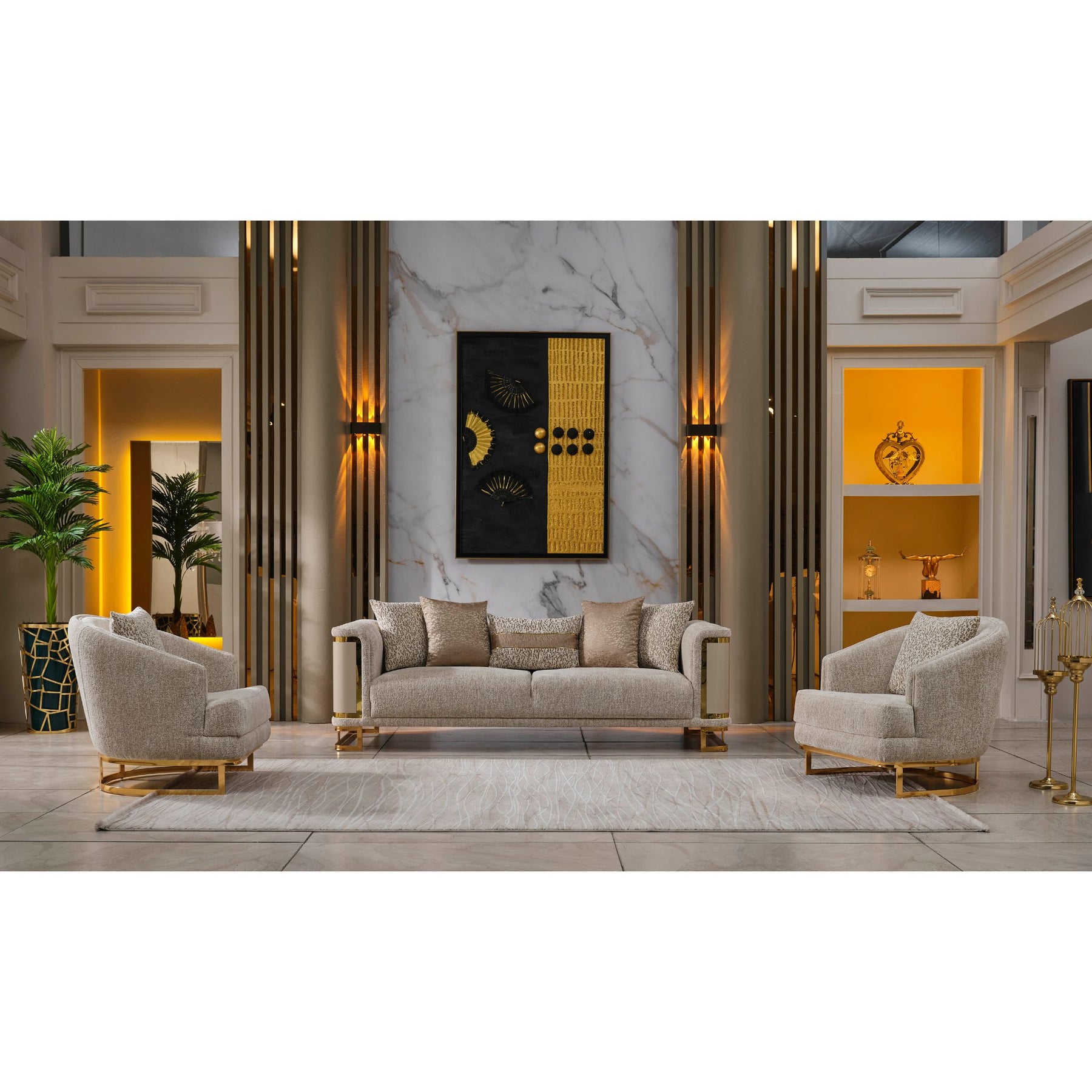 Das Set besticht durch seinen hellen, strukturierten Stoffbezug, der in Kombination mit den goldfarbenen Metallfüßen und Rahmendetails für einen stilvollen Kontrast sorgt.