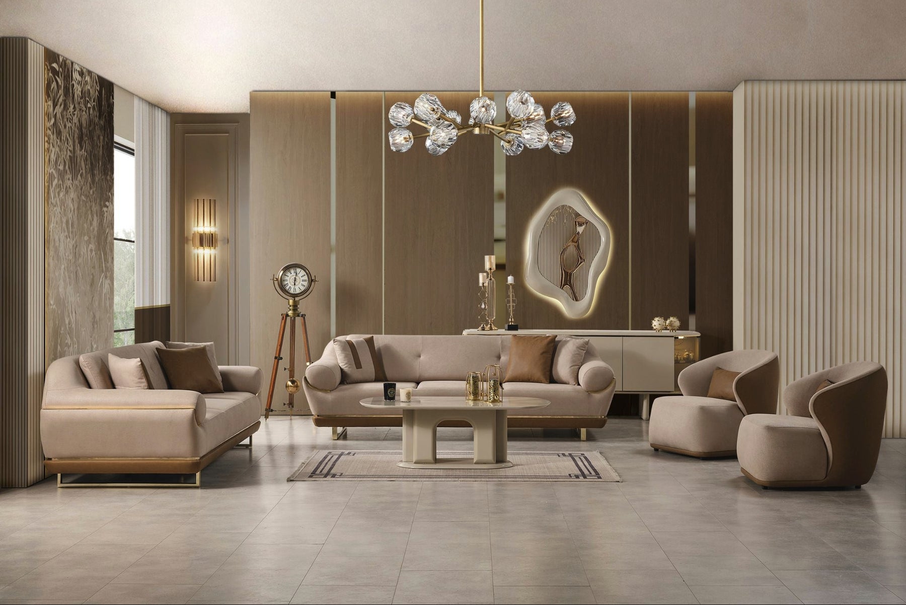 Das Ciragan Sofa-Set vereint Komfort, Eleganz und luxuriöse Handwerkskunst in einem harmonischen Design. Mit seinen geschwungenen Linien, goldenen Akzenten und warmen Beigetönen schafft es ein stilvolles Ambiente, das Ruhe und Exklusivität ausstrahlt.