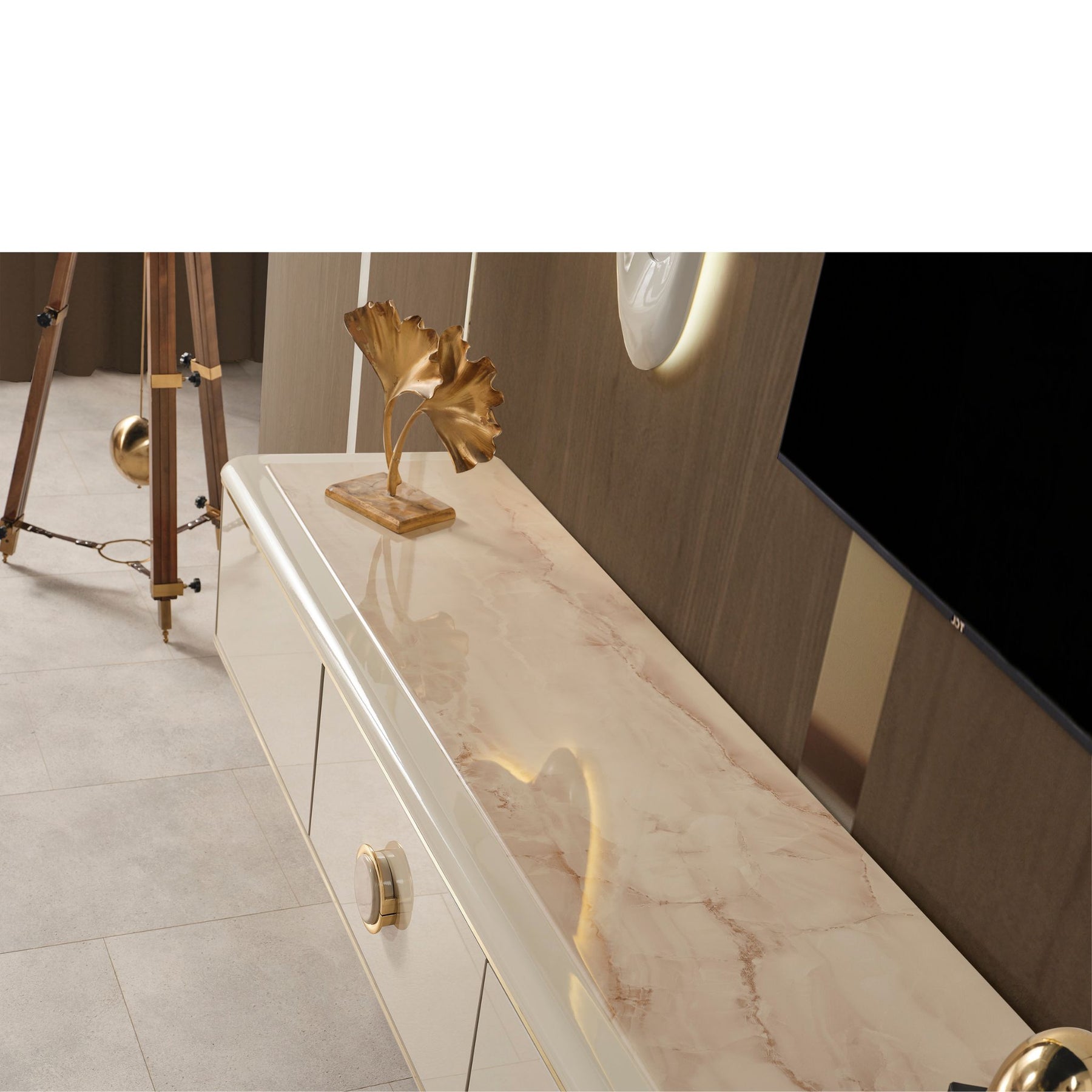 TV-Lowboard: Mit drei Schubladen, goldenen Griffdetails und seitlicher Glasvitrine mit Beleuchtung – ideal für dekorative Akzente.