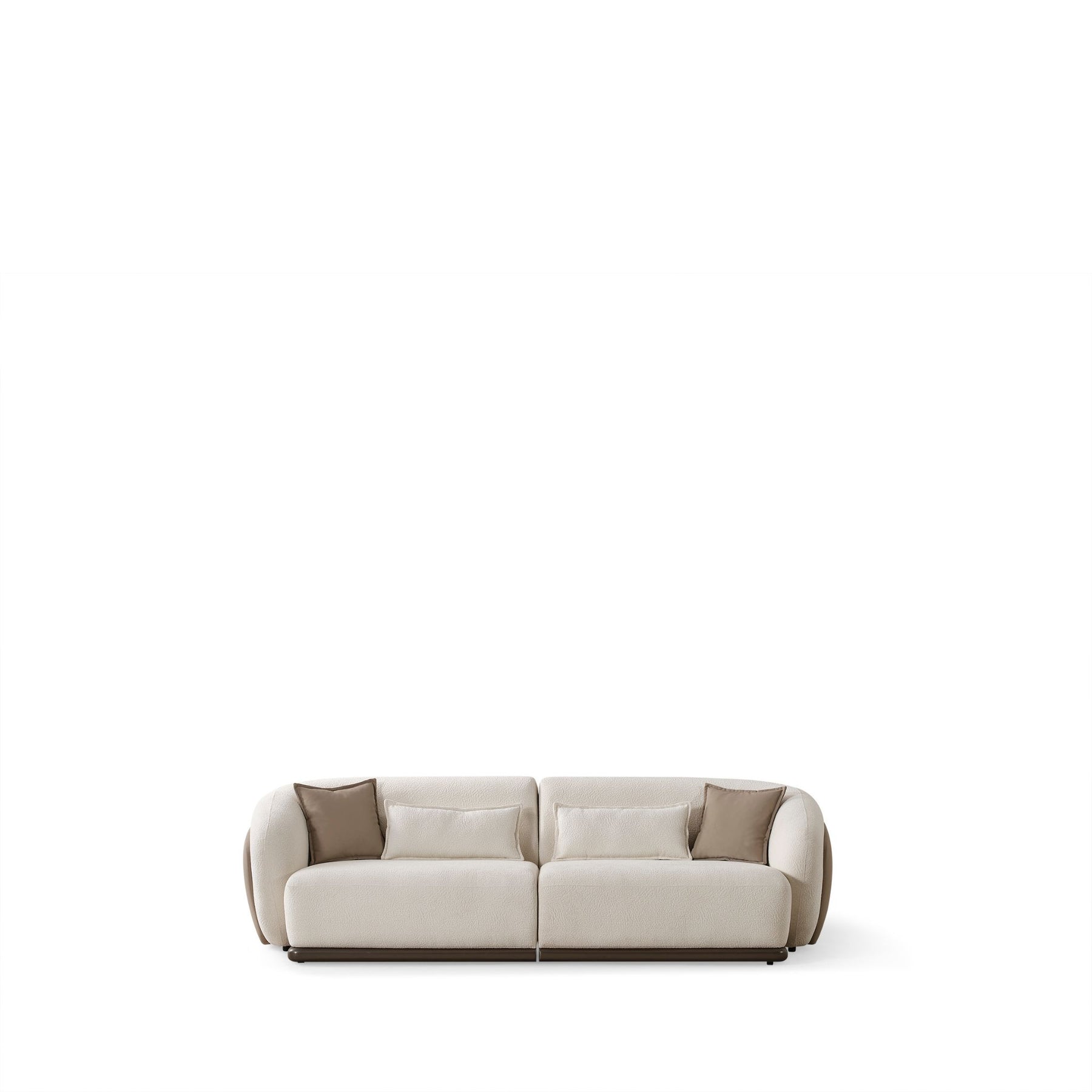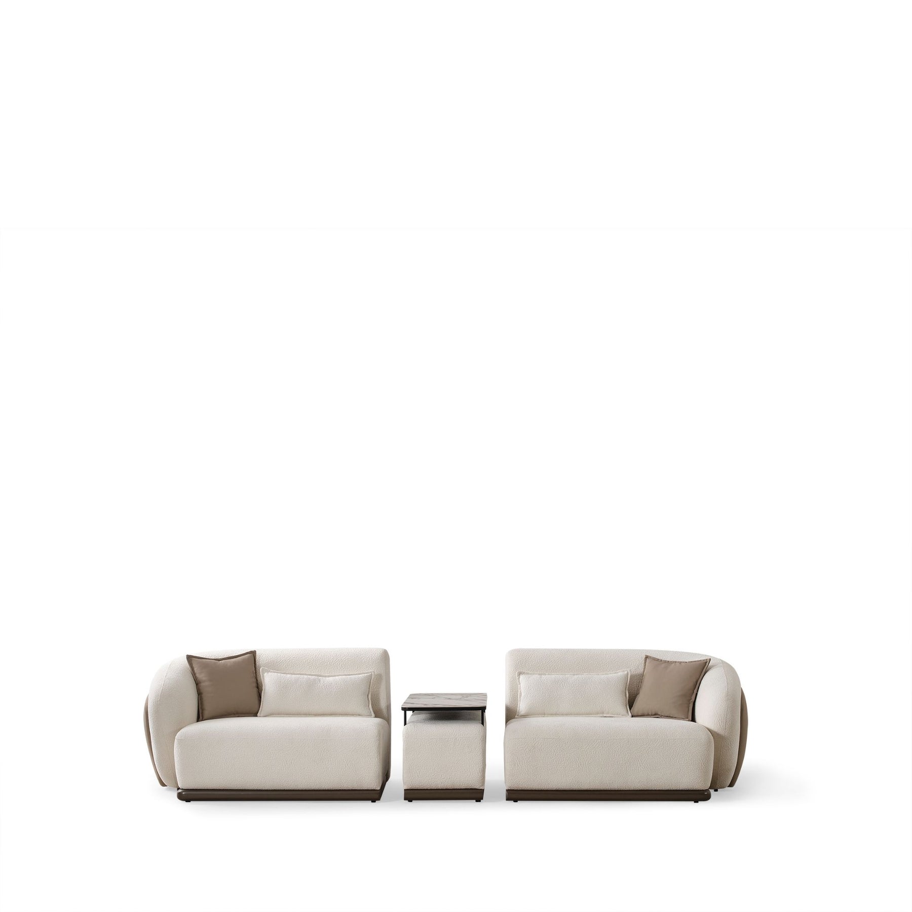 Die harmonische Kombination aus warmen Latte-Tönen, weichem Stoff und formschönen Rundungen verleiht jedem Wohnzimmer ein elegantes, ruhiges Ambiente.