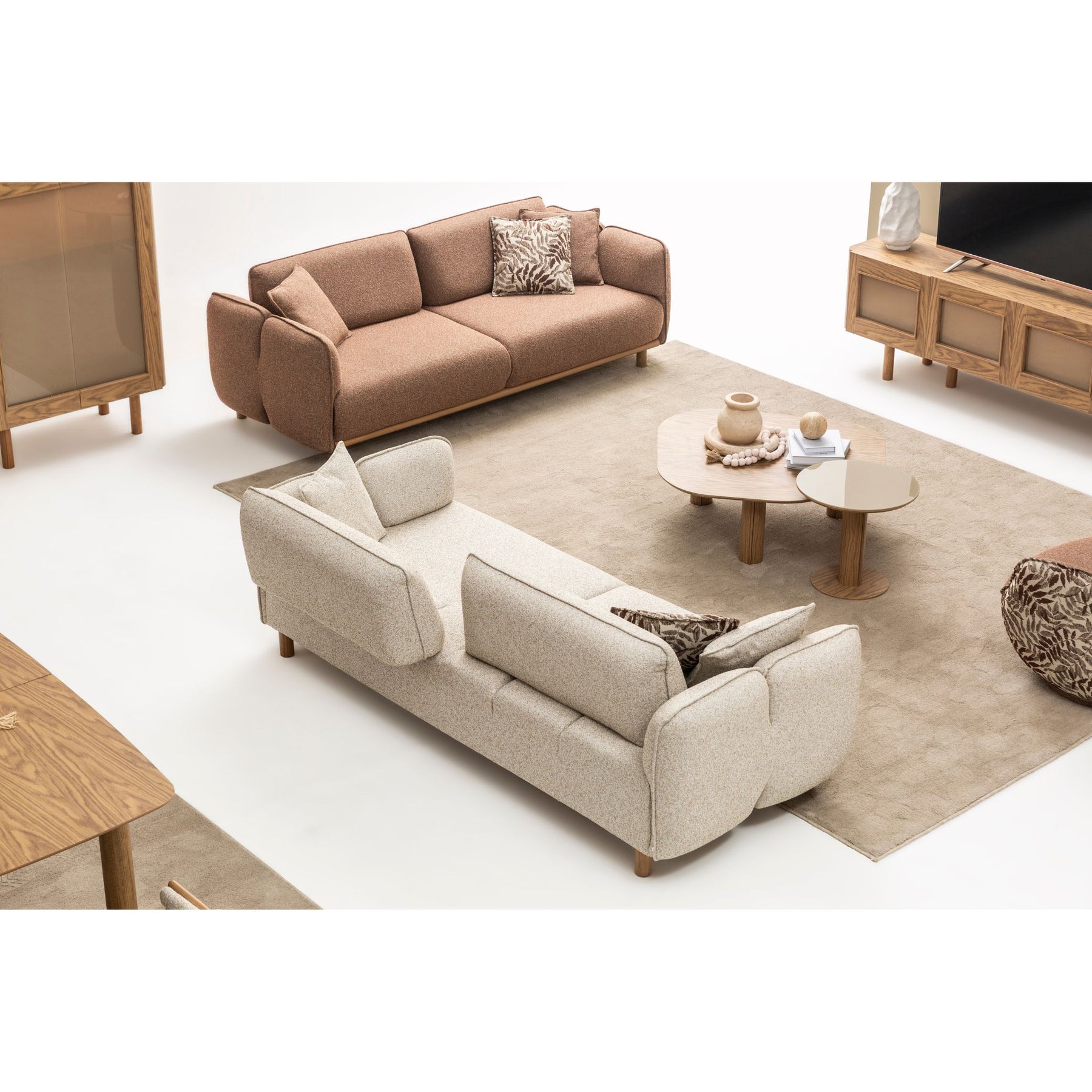 Das Set besticht durch seine strukturierten Stoffbezüge in warmen Erdtönen und massive Holzfüße, die Stabilität und Natürlichkeit vermitteln.