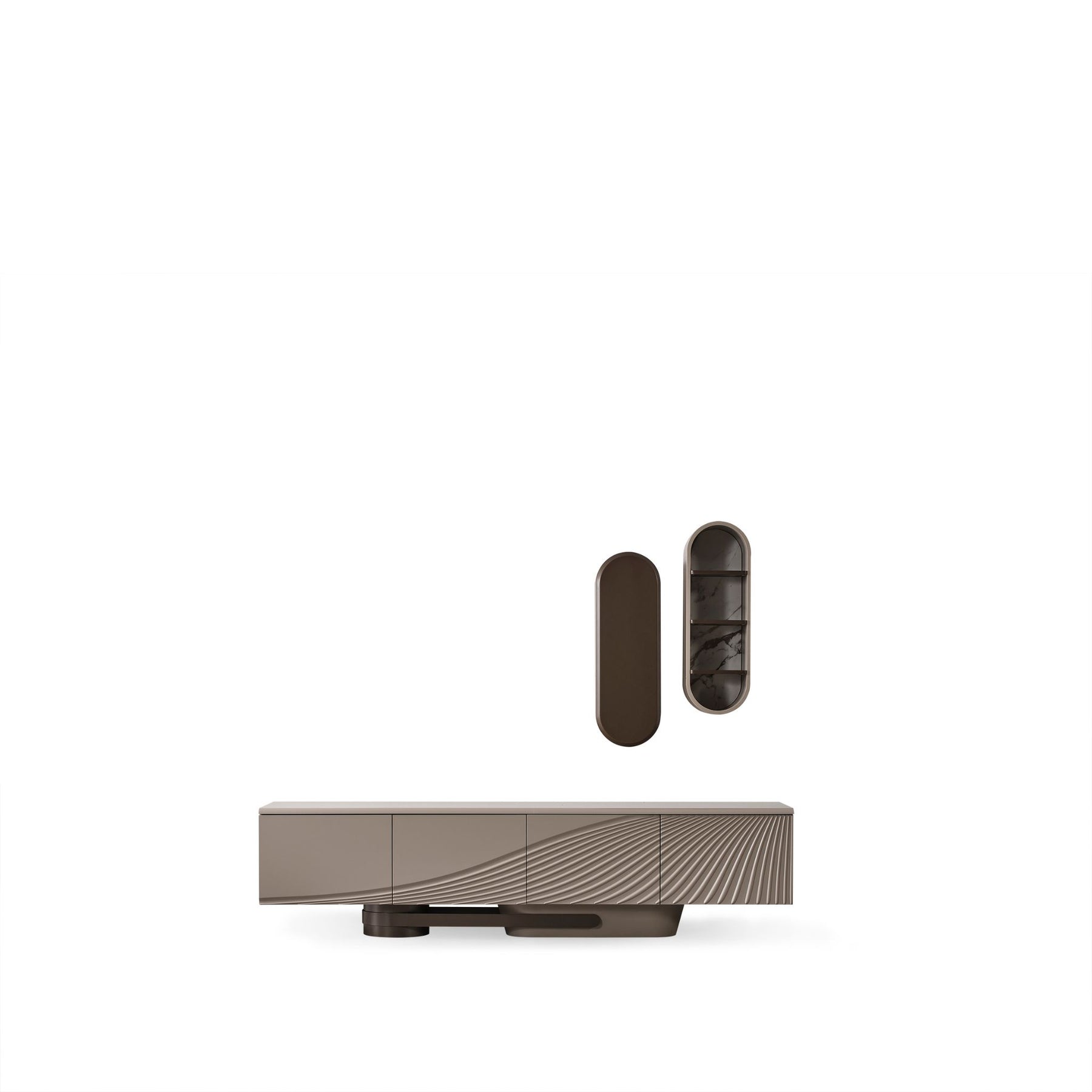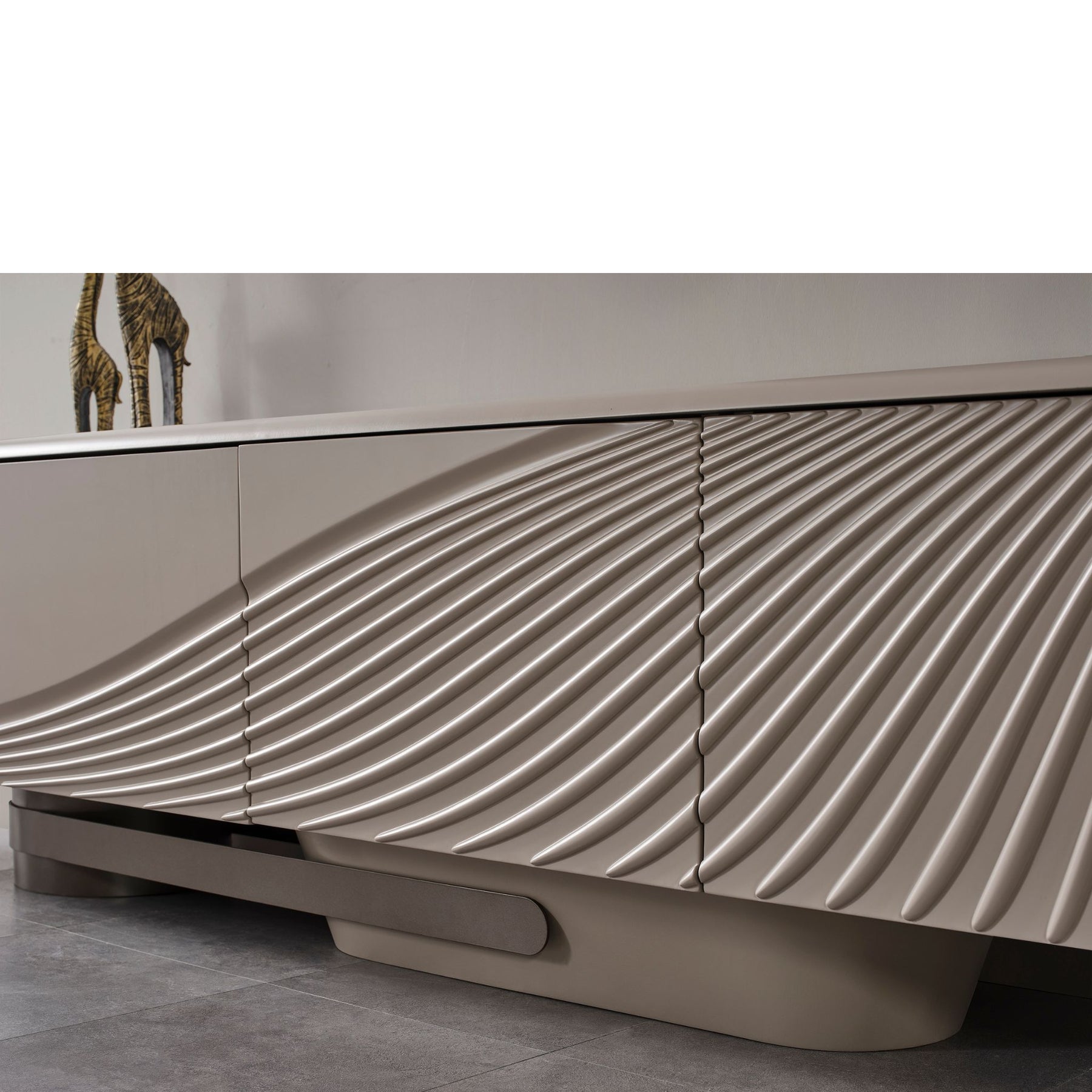 TV-Lowboard: Breite Ablagefläche mit markanter Frontgestaltung in 3D-Wellenoptik. Bietet großzügigen Stauraum hinter grifflosen Türen mit Soft-Close-System.
