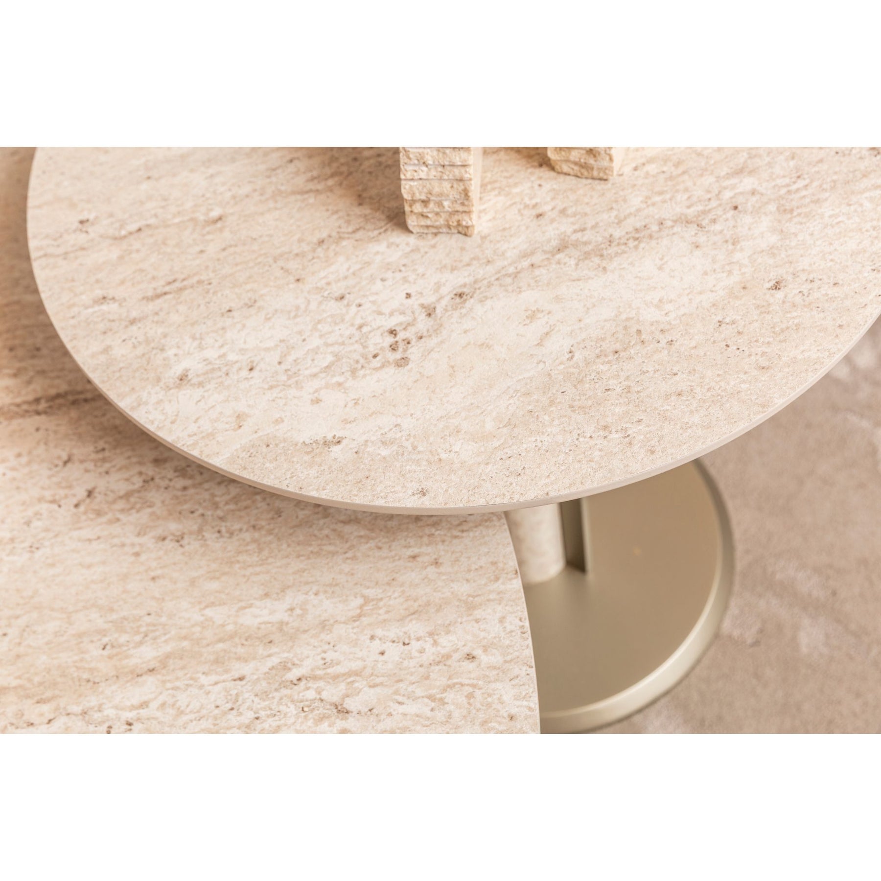 • Runde Tischplatten in Travertin-Steinoptik, auf schlanken Säulenfüßen – optisch leicht und elegant.