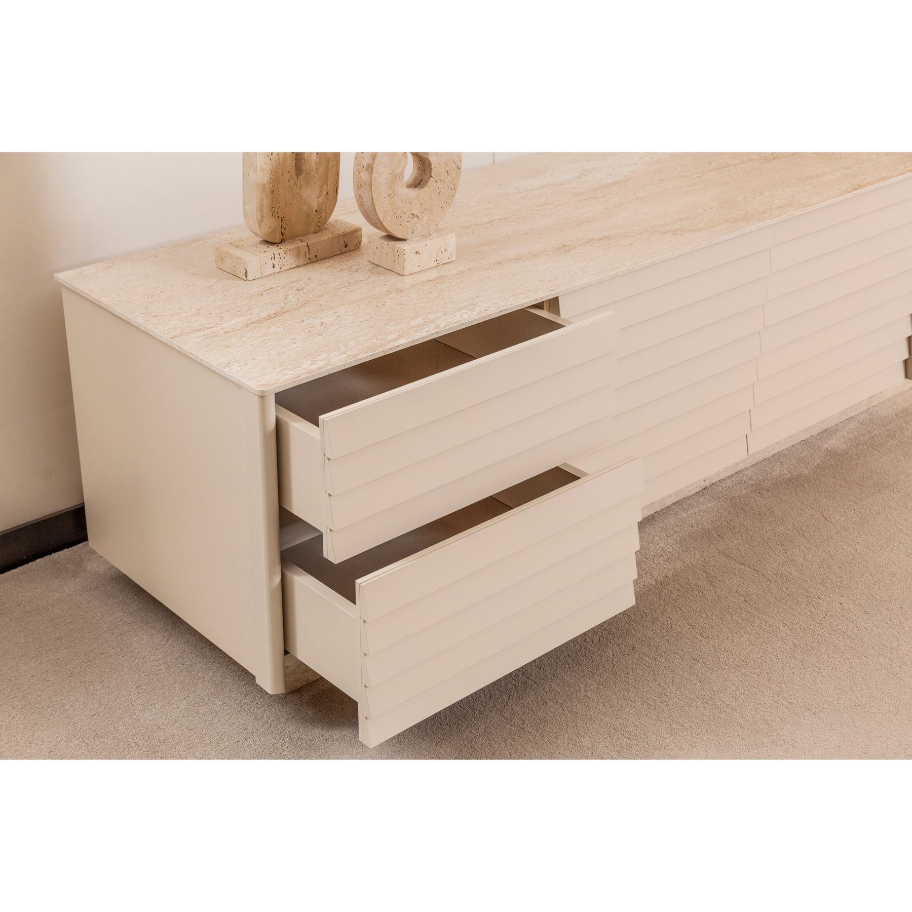 • TV-Lowboard mit horizontaler Lamellen-Front und durchgehender Oberfläche in Travertin-Steinoptik.