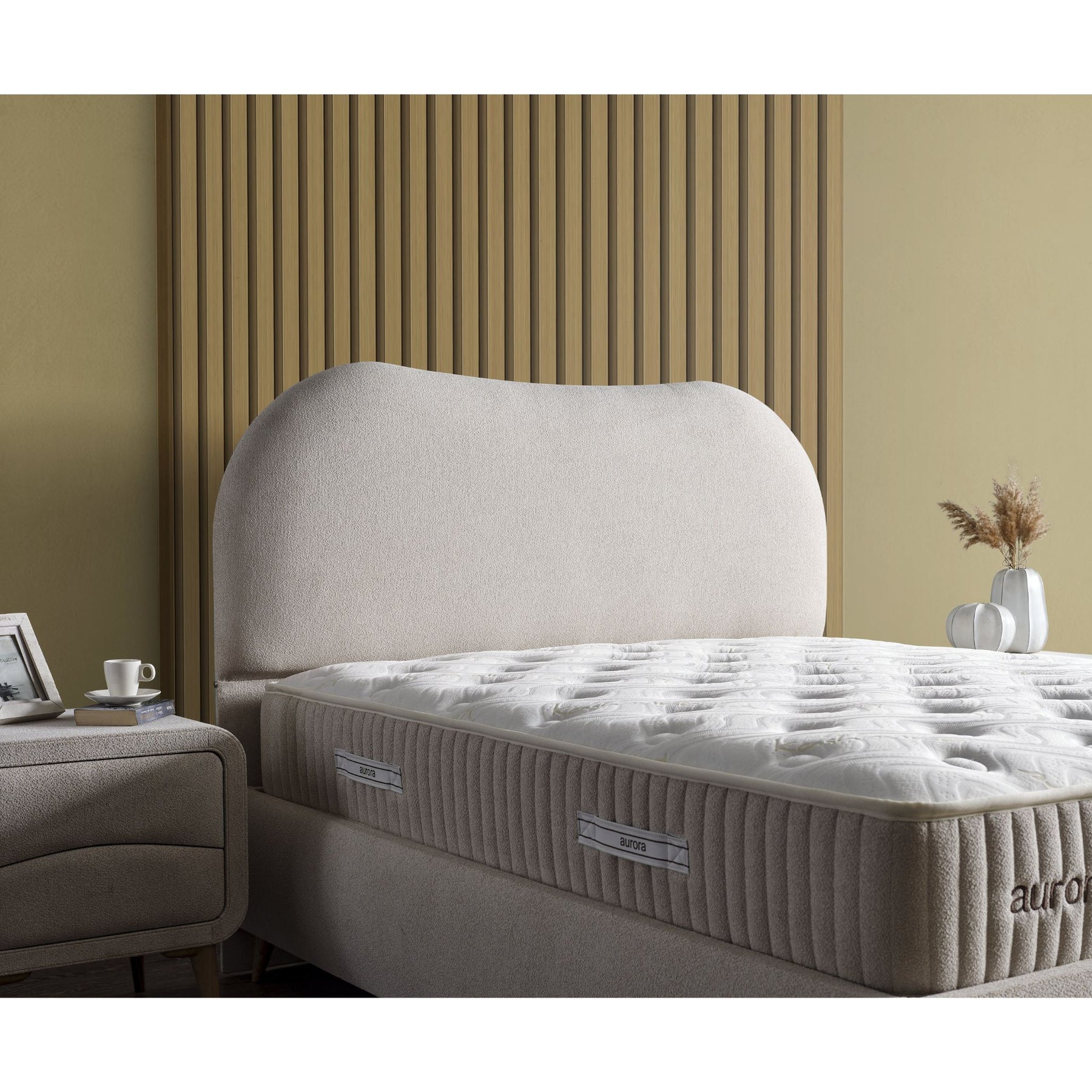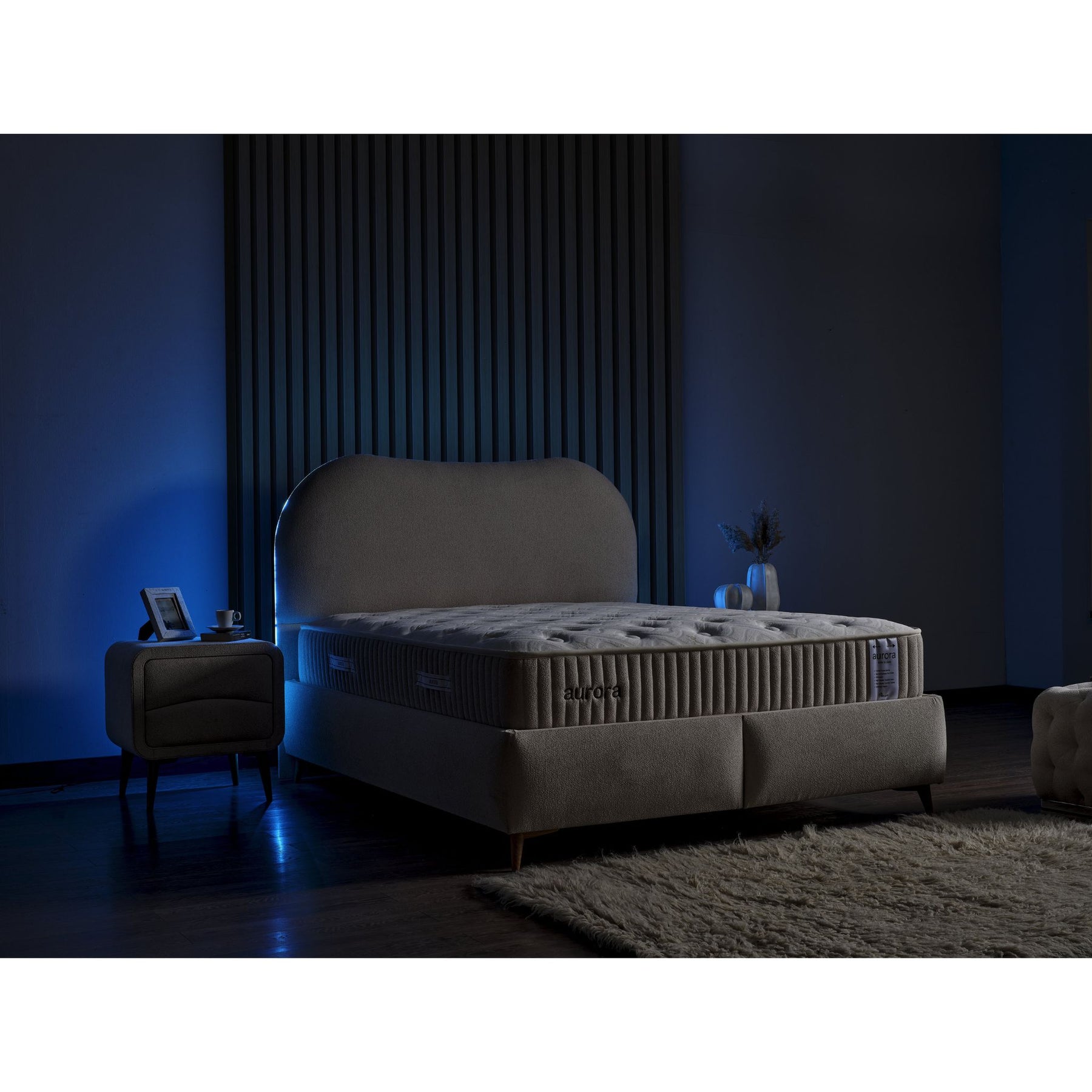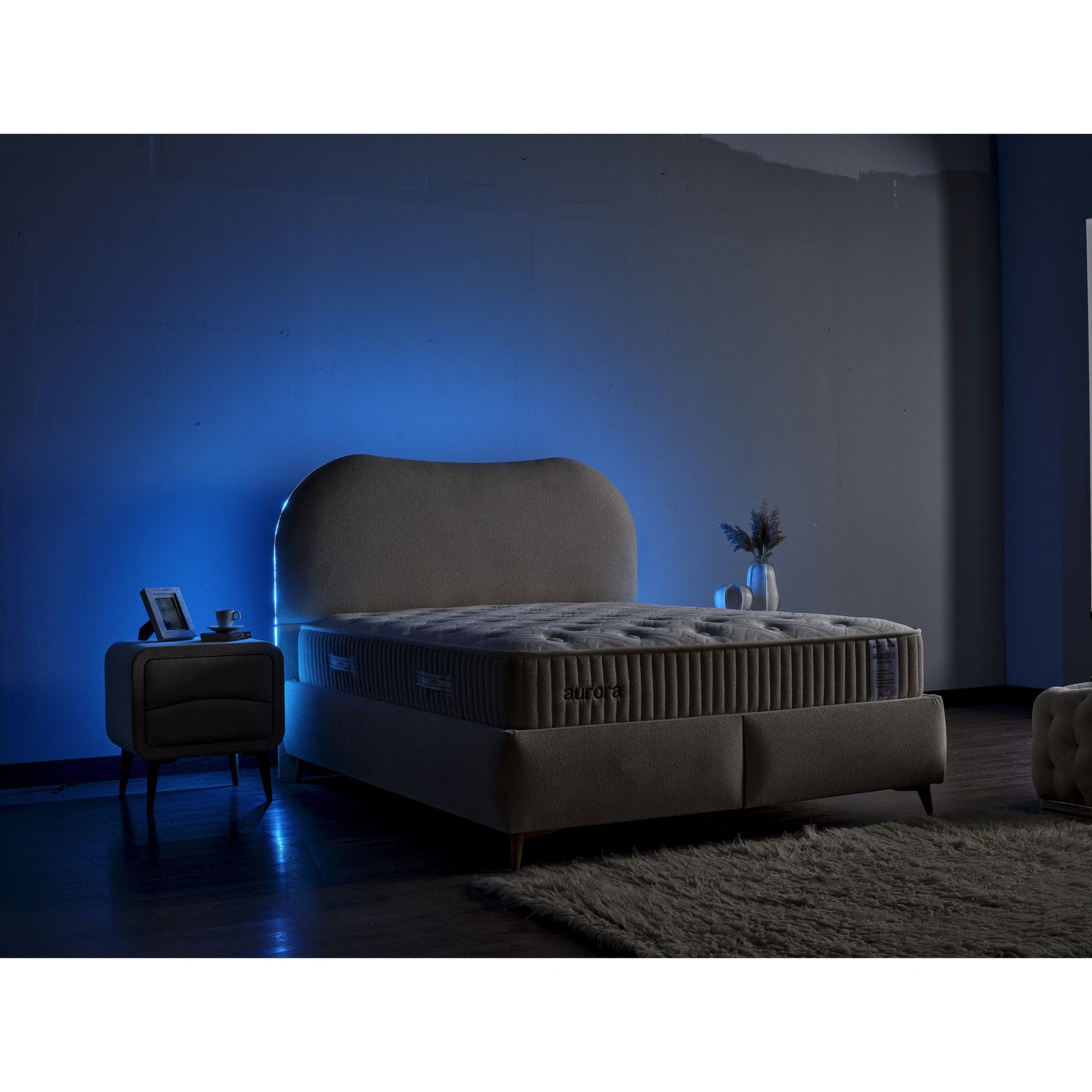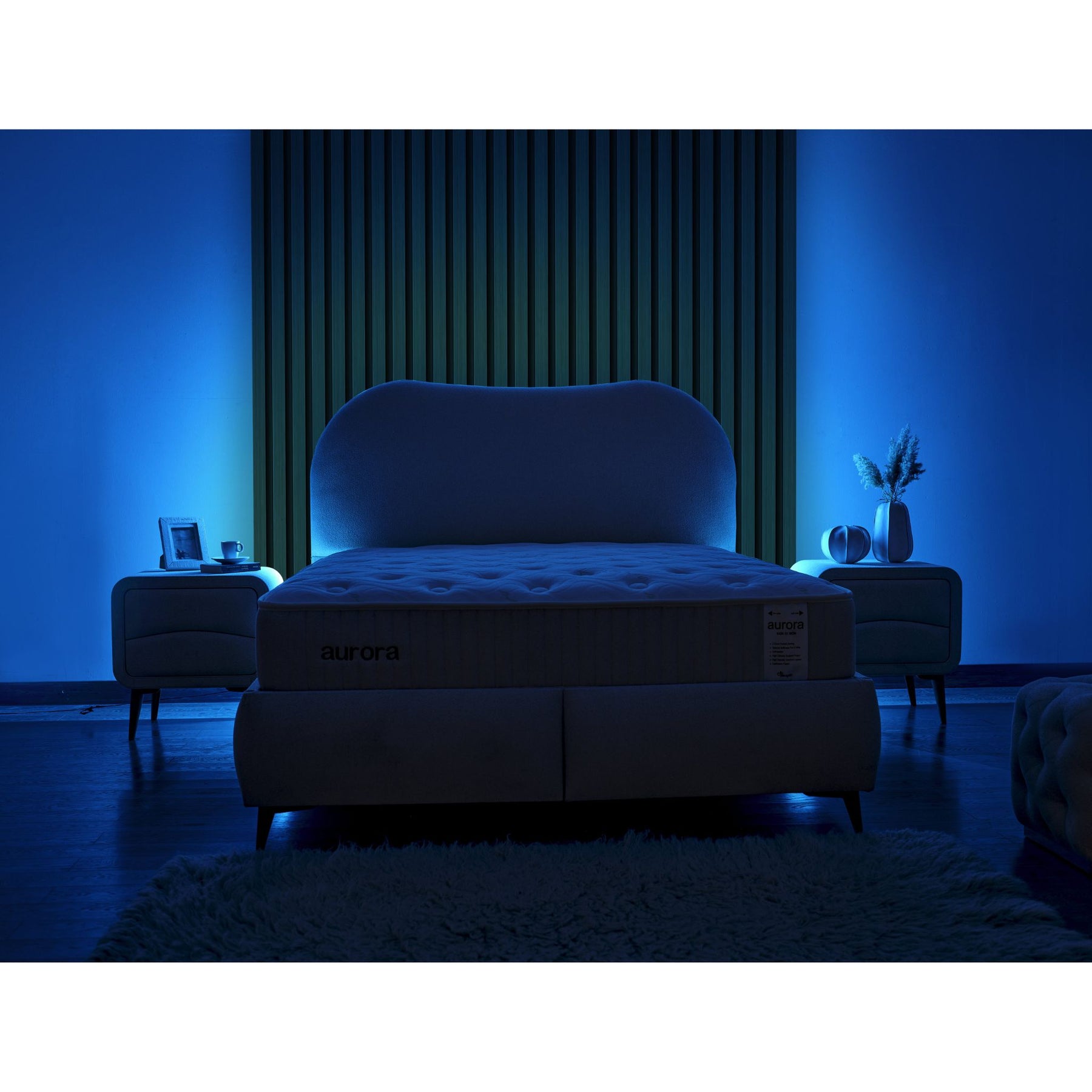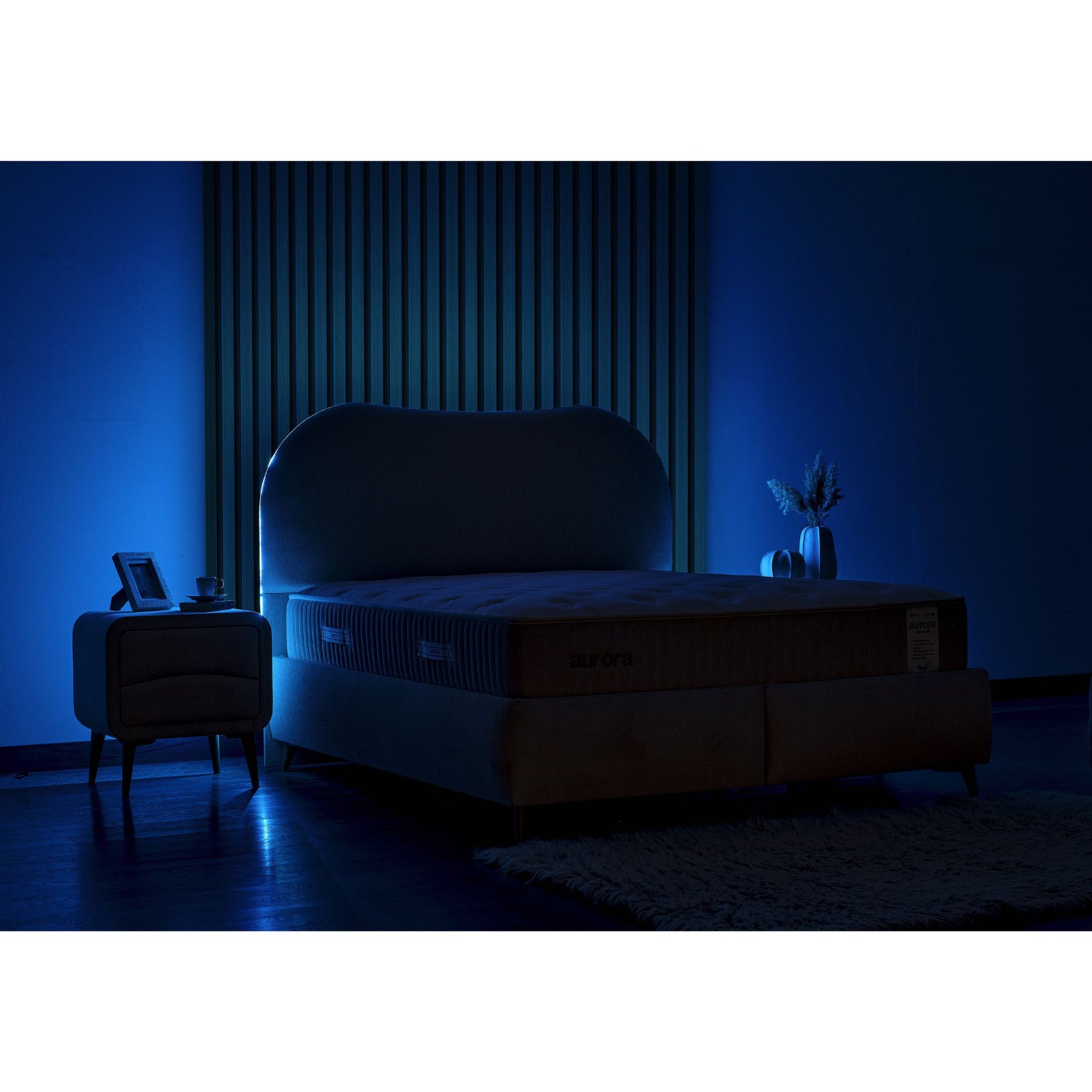 Das Aurora Boxspringbett verbindet elegantes Design mit hohem Schlafkomfort. Das weich geschwungene Kopfteil, die sanfte Stoffstruktur und die optionale LED-Beleuchtung verleihen deinem Schlafzimmer eine beruhigende Atmosphäre. Die integrierte Stauraumbox bietet viel Platz für Bettwäsche, Kissen und Decken – leicht zu öffnen dank stabiler Metallkonstruktion.