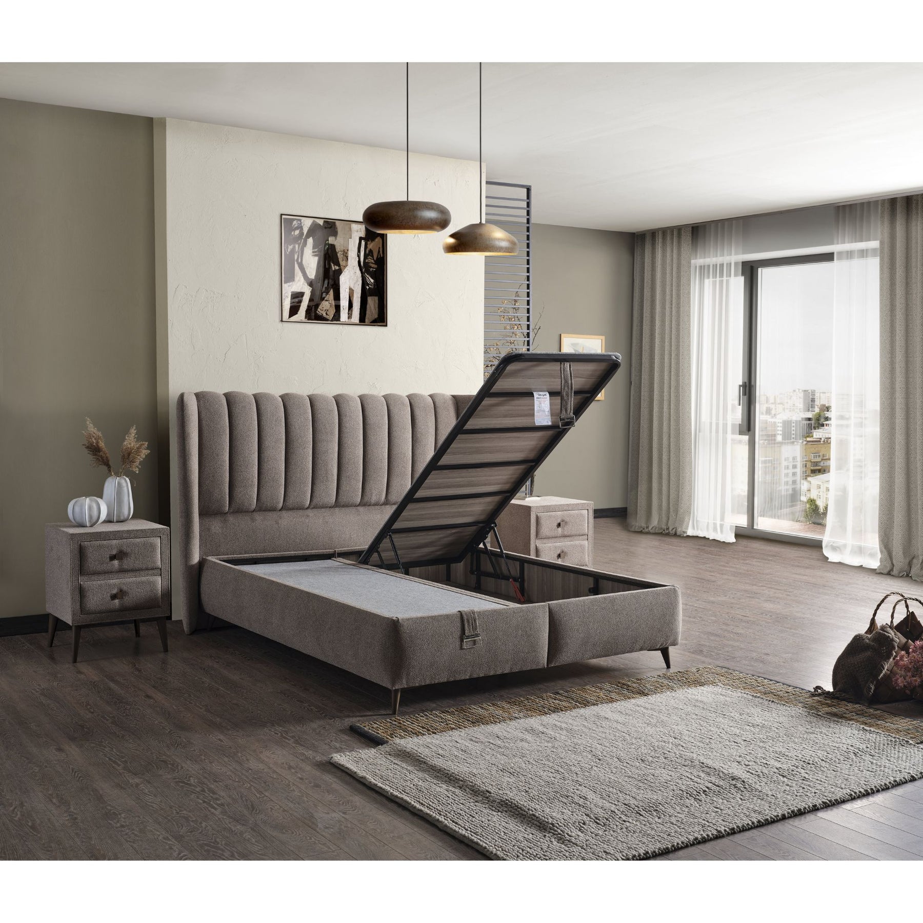 Die weiche Struktur des Stoffbezugs wirkt harmonisch und verleiht dem Schlafzimmer eine ruhige, elegante Atmosphäre.