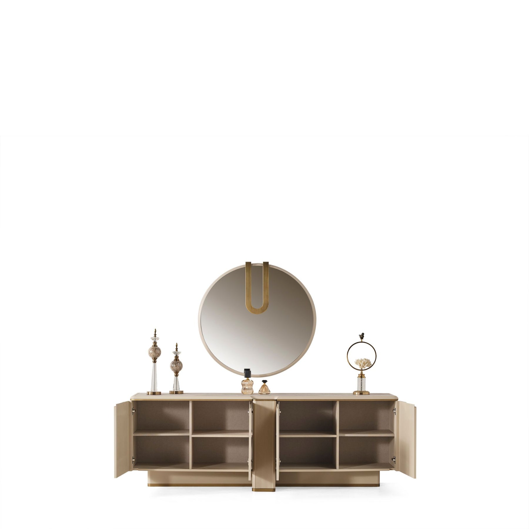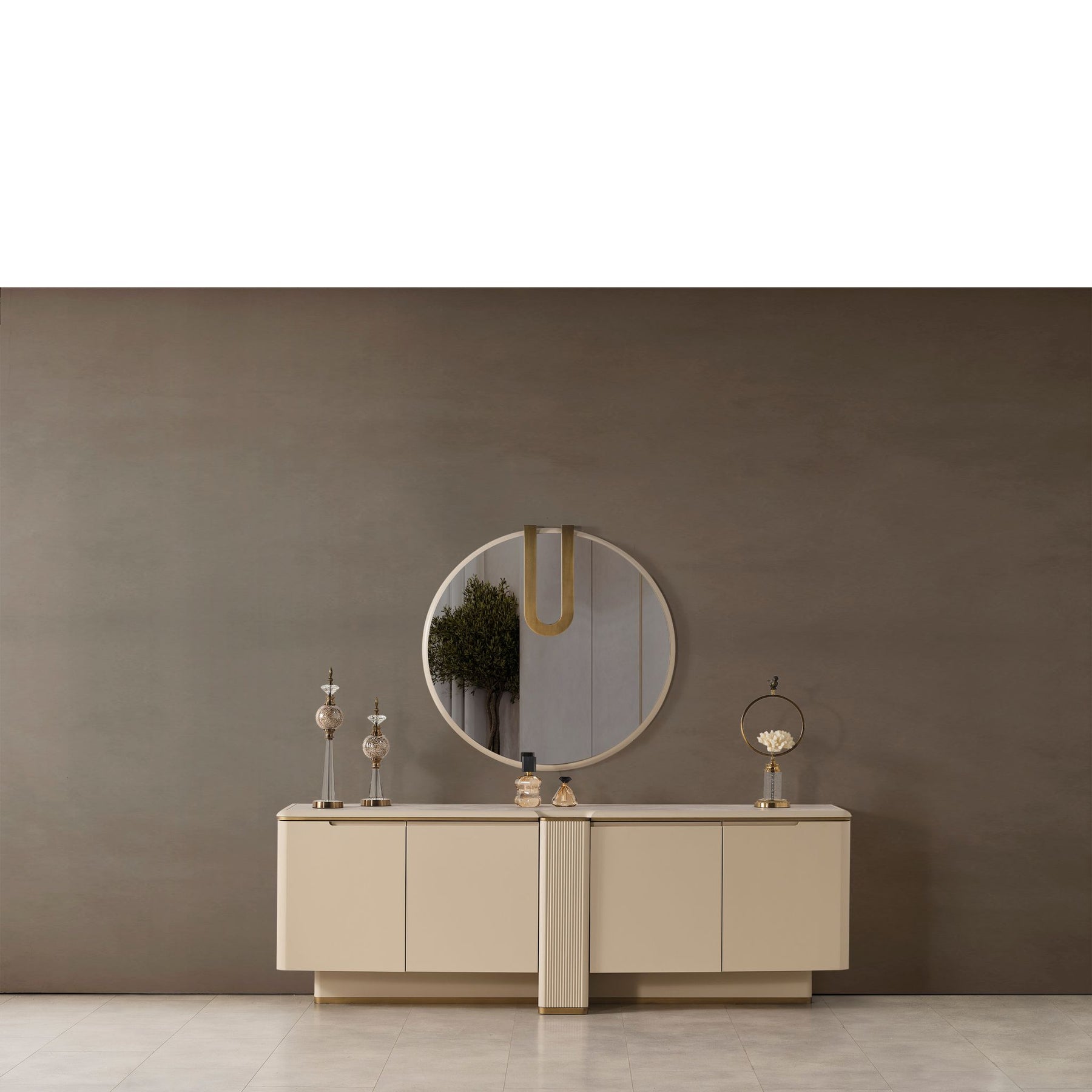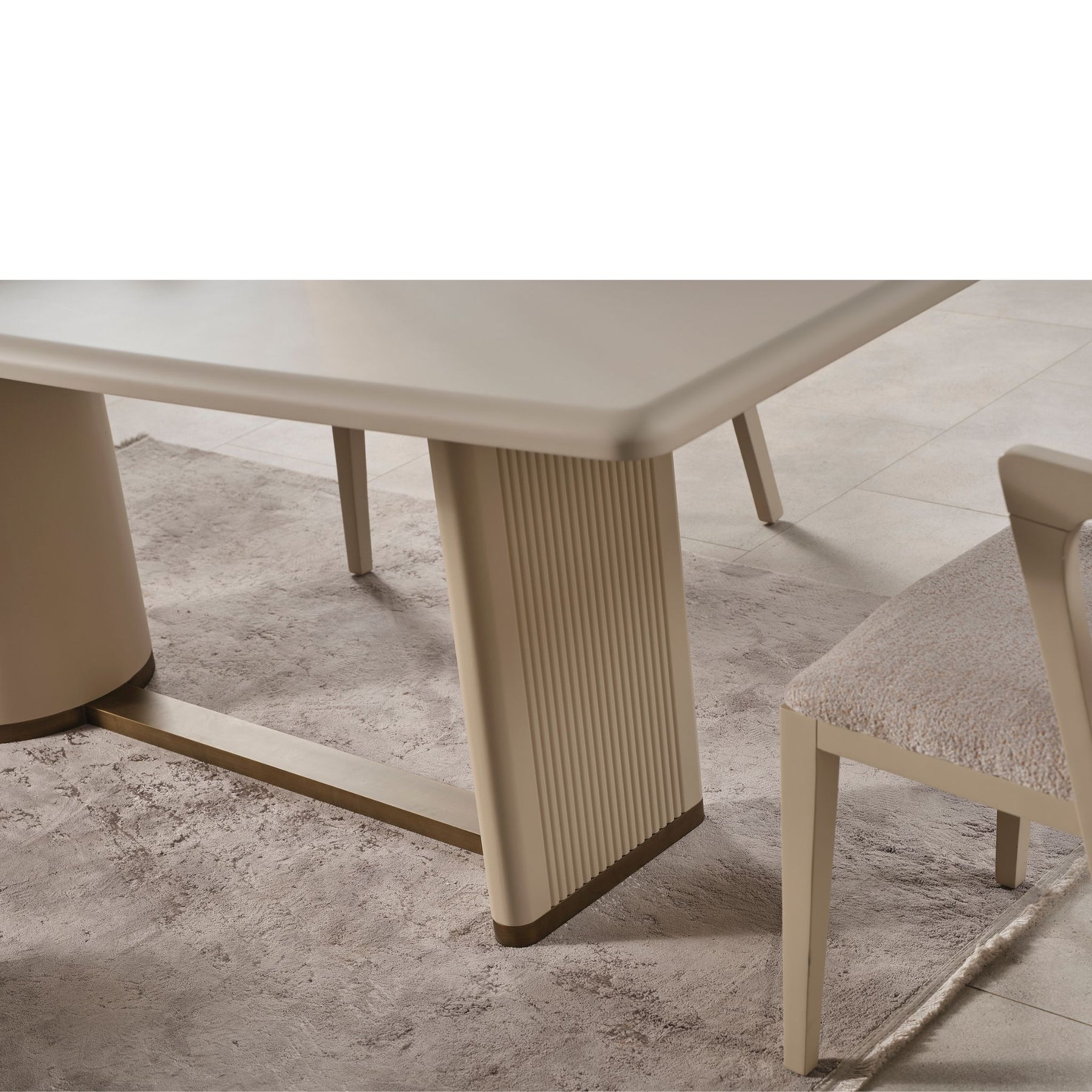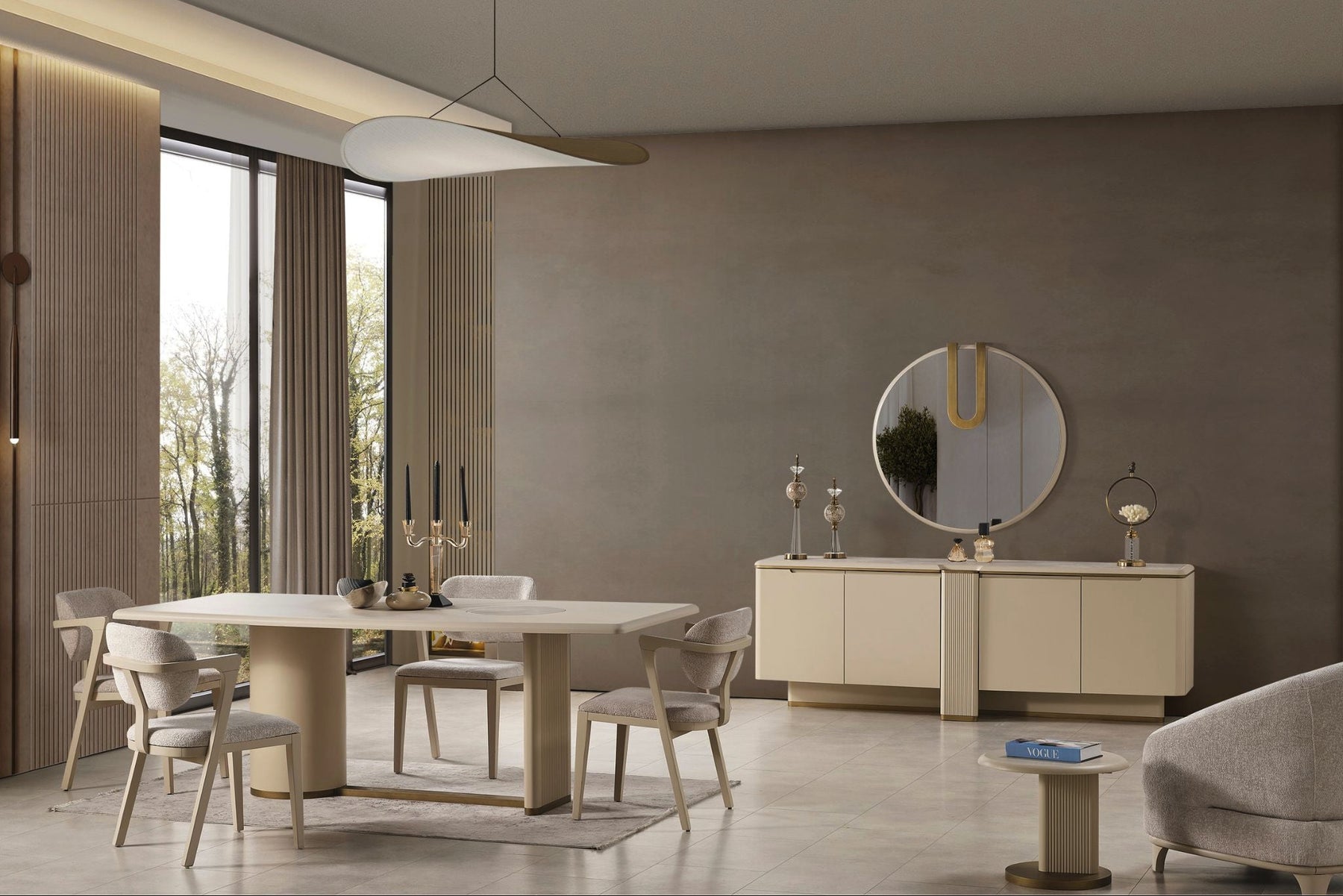 Das Dolunay Esszimmer-Set kombiniert edle Materialien, sanfte Farben und klare Formen zu einem eleganten Gesamtbild. Die harmonische Verbindung aus Beige und Gold sorgt für ein warmes, einladendes Ambiente – ideal für stilvolle Abende mit Familie und Gästen.