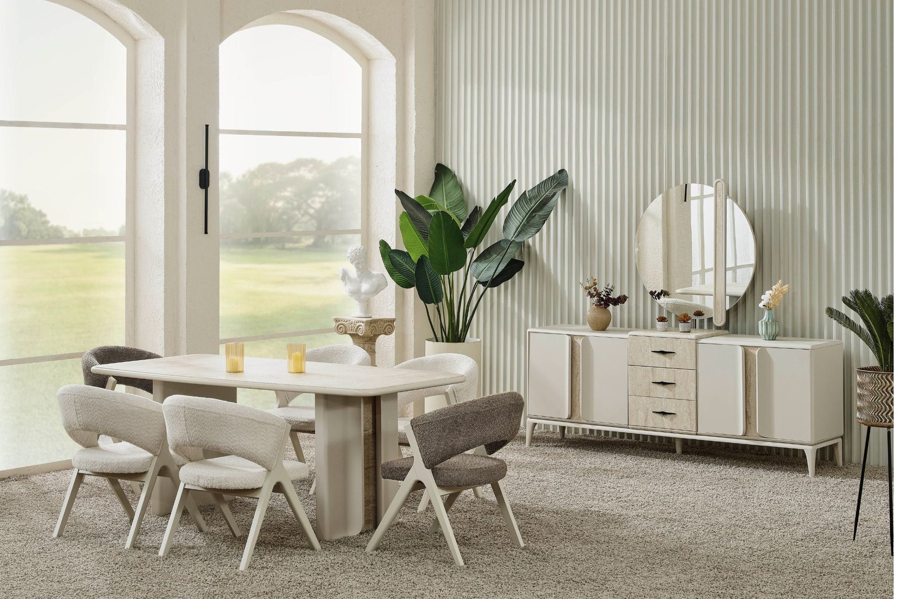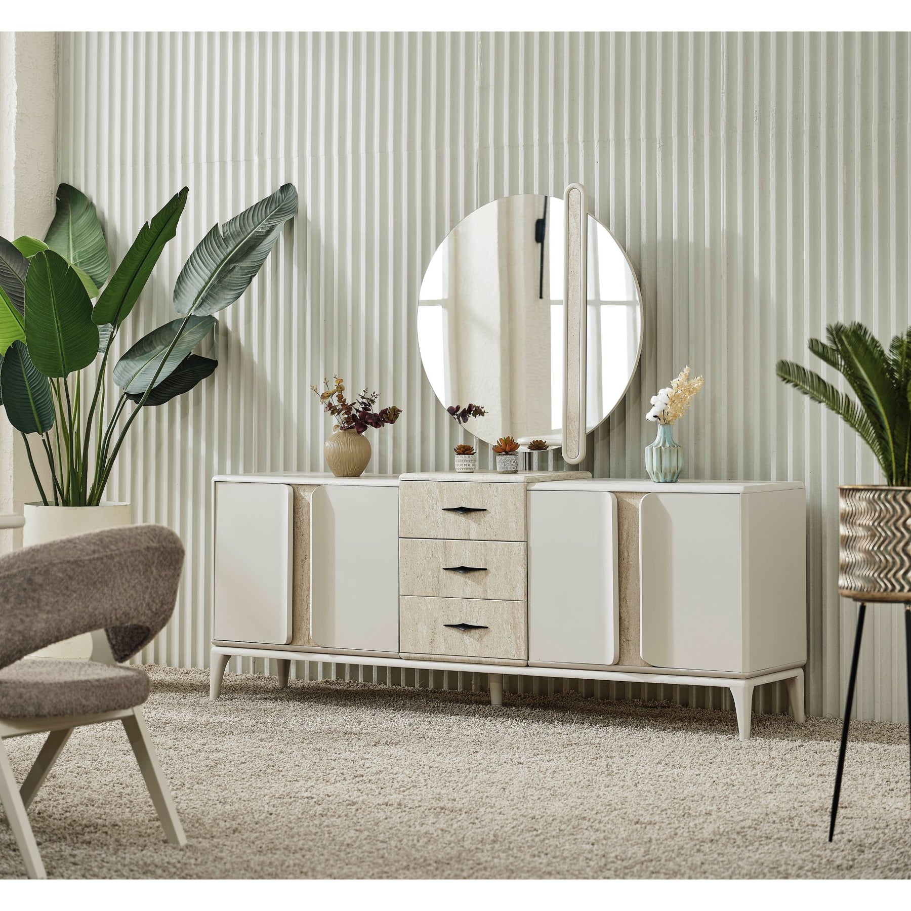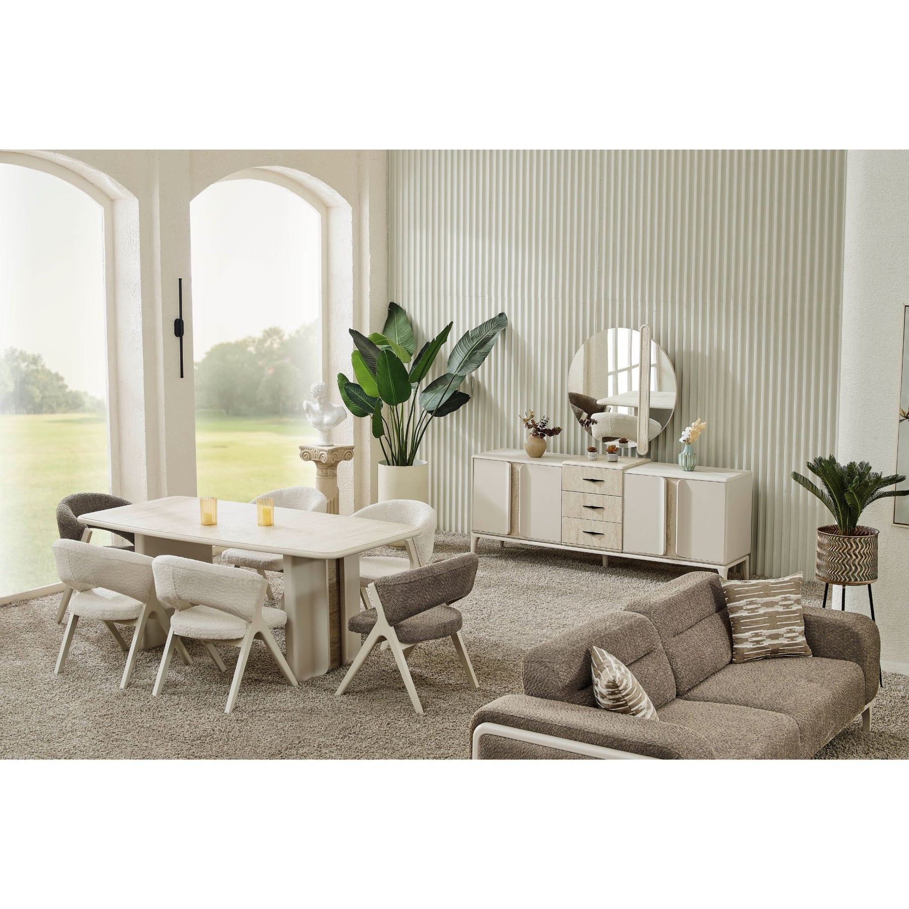 Das Golfsan Set beeindruckt durch seine ausgewogene Kombination aus Creme- und Sandtönen sowie die natürliche Steinoptik der Tisch- und Sideboard-Oberflächen.