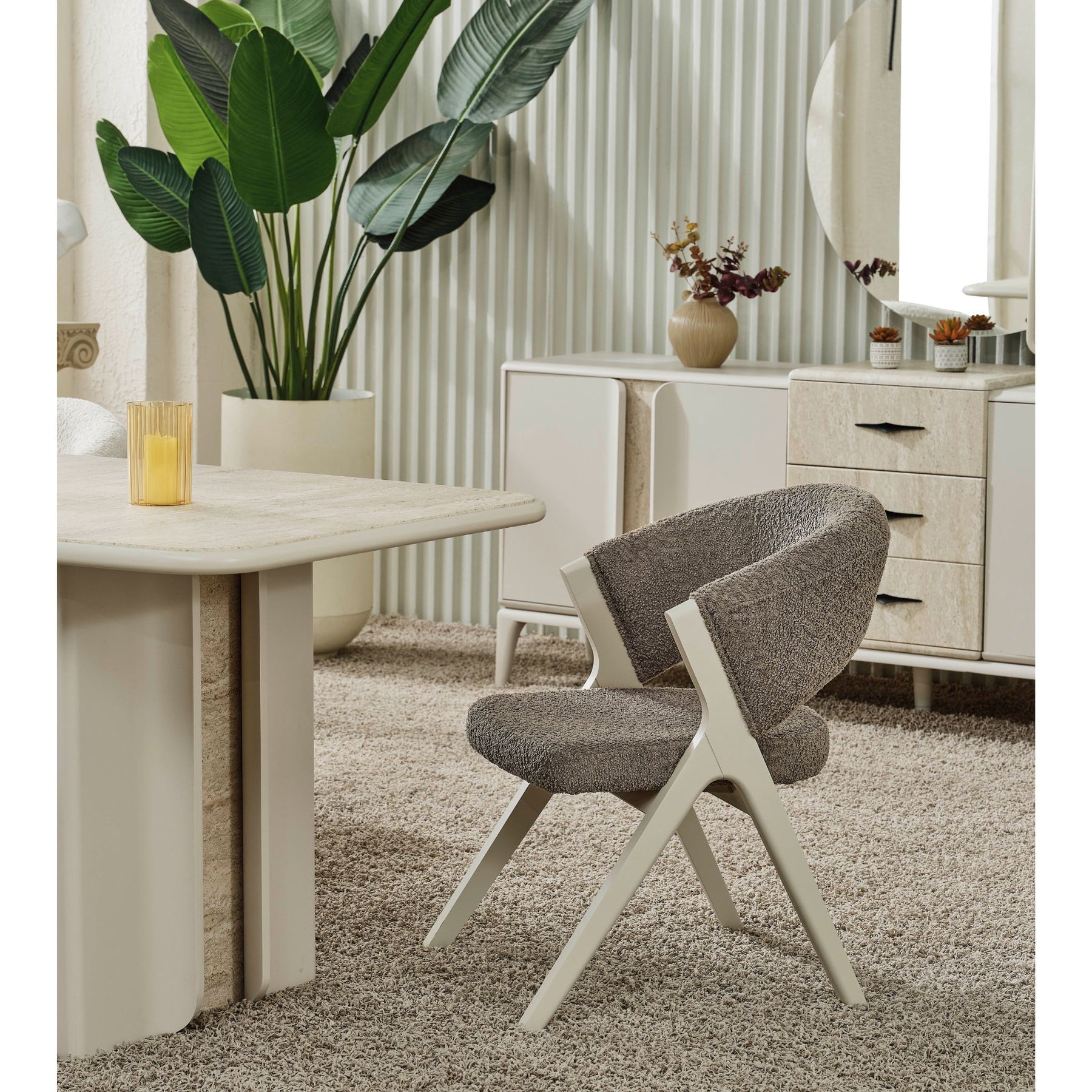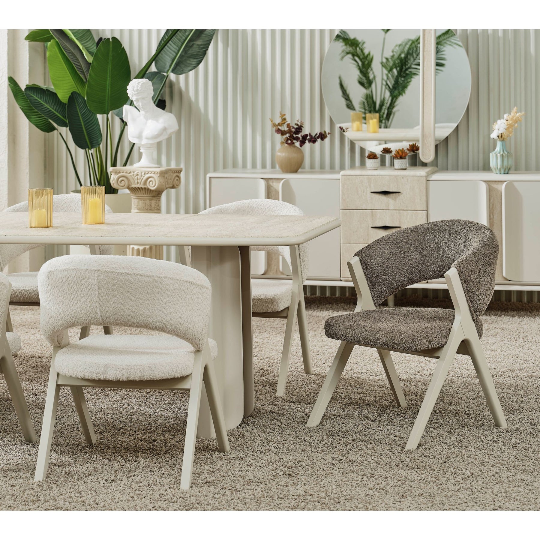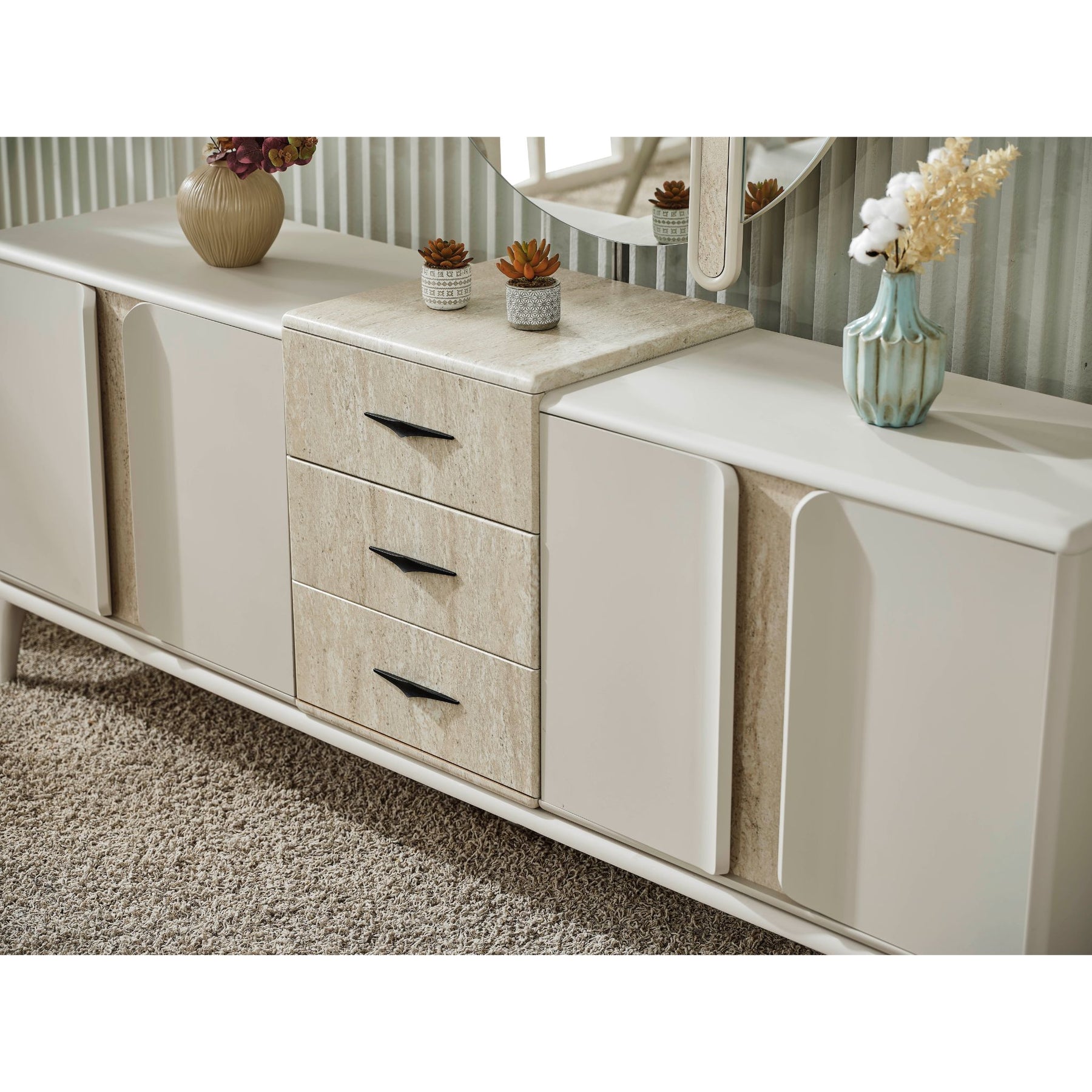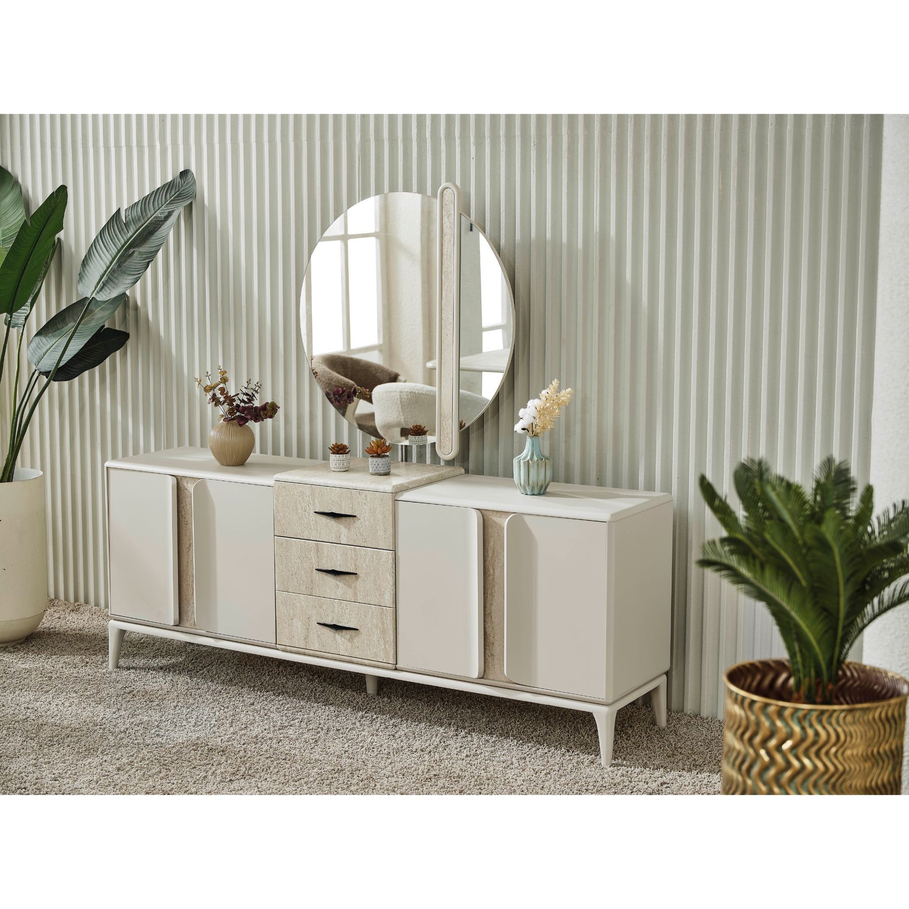 Das Golfsan Set beeindruckt durch seine ausgewogene Kombination aus Creme- und Sandtönen sowie die natürliche Steinoptik der Tisch- und Sideboard-Oberflächen.