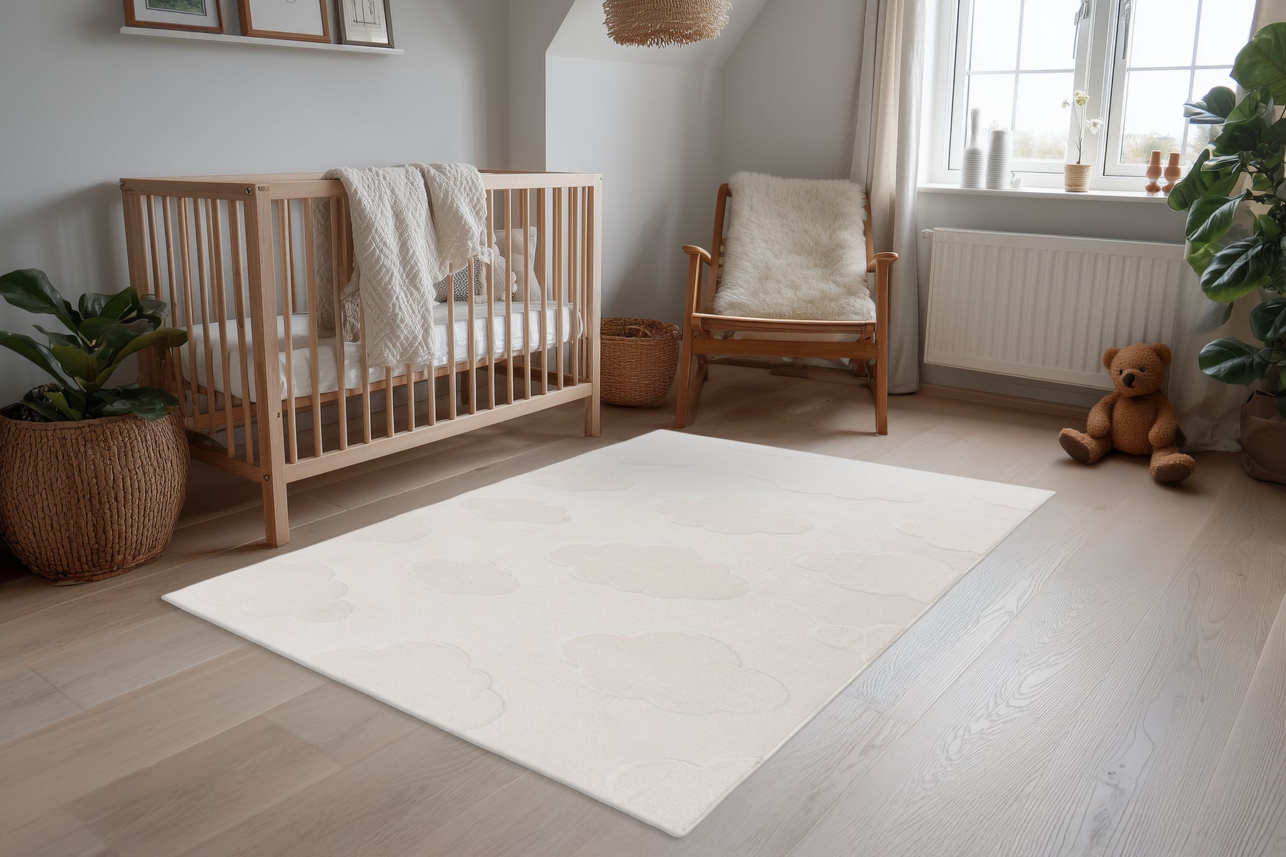 Sanfte Wolken, beruhigende Farben und ein kuschelig weiches Gefühl – der Kinderteppich „Bambi“ in Ivory verwandelt jedes Baby- und Kinderzimmer in eine weiche Wohlfühloase. Das Ton-in-Ton Wolkenrelief wirkt beruhigend und passt perfekt zu modernen, hellen Natur-Einrichtungen.