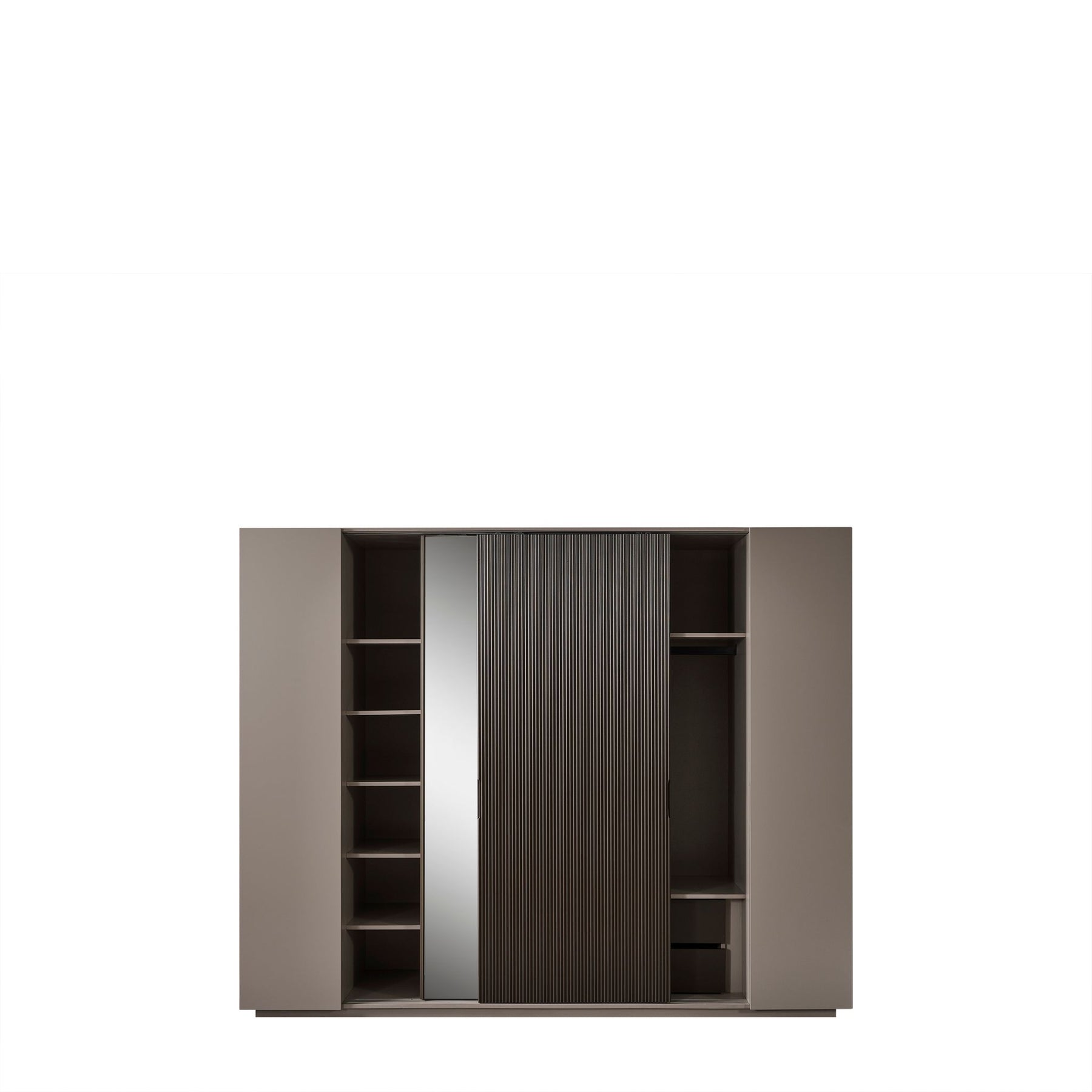 • Kleiderschrank: Mit Schiebetüren, Spiegelelement und strukturierter Front. Innenaufteilung mit Kleiderstangen, Einlegeböden und Schubladen für optimale Organisation.