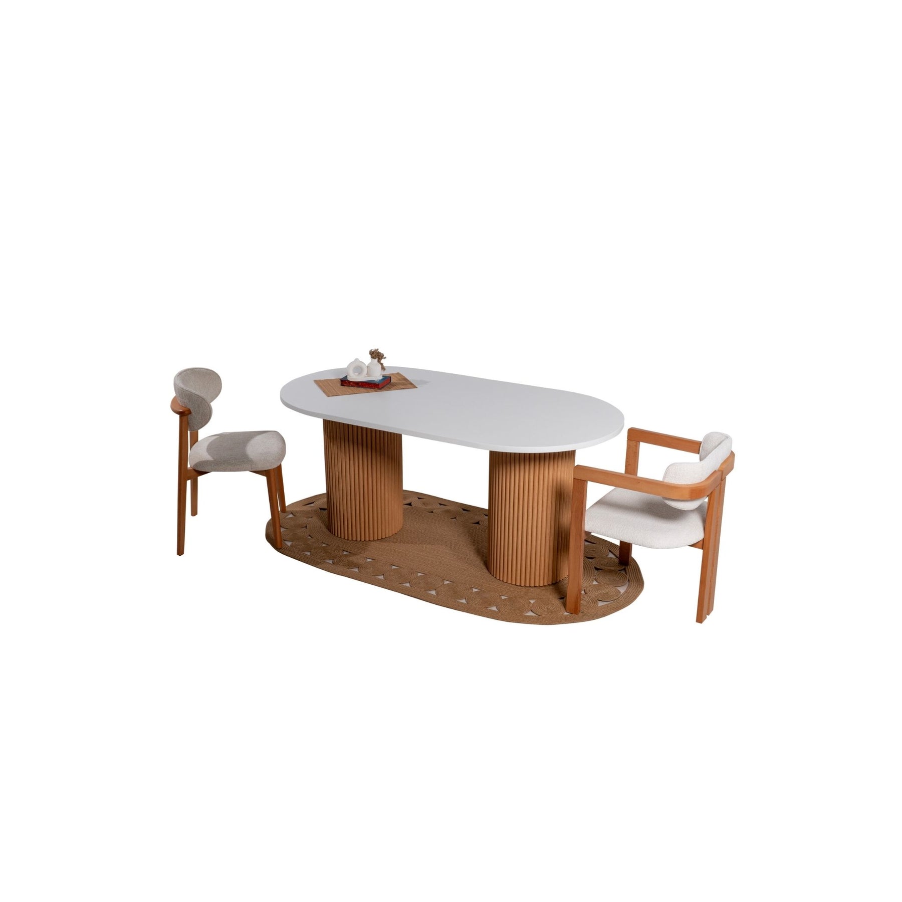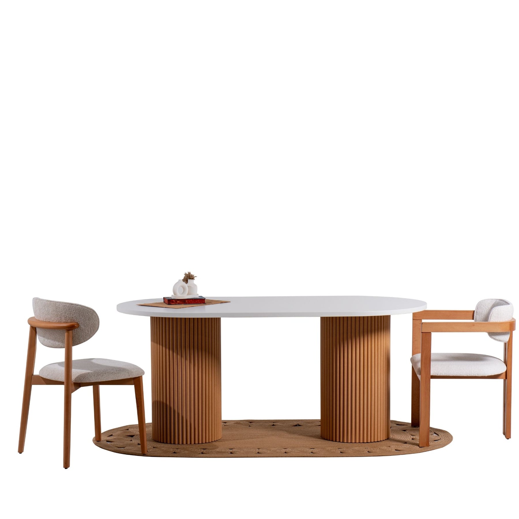 Seine ovale Tischplatte mit digital bedruckter Oberfläche bringt die edle Marmor- oder Steinoptik zur Geltung, während das doppelte Holzsäulen-Gestell in brauner Holzfarbe dem Tisch Charakter und Stabilität verleiht.