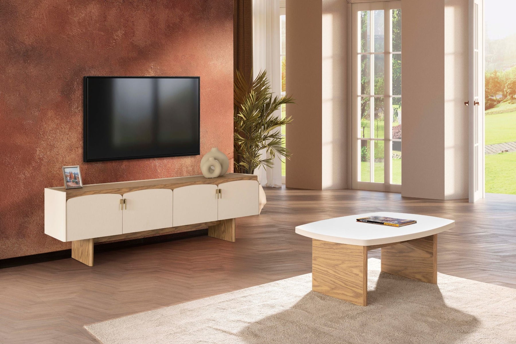 TV-Lowboard: Drei Türen mit leicht abgerundeten Fronten und dezenten Griffen, auf stabilen Holzfüßen stehend. Die Kombination aus heller Oberfläche und Holzstruktur sorgt für ein ausgewogenes Erscheinungsbild.