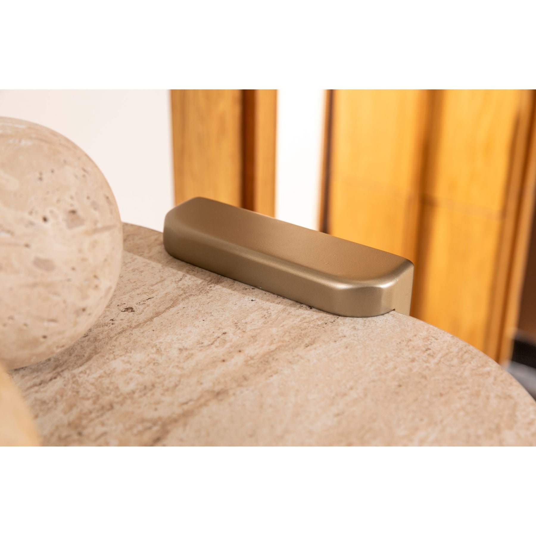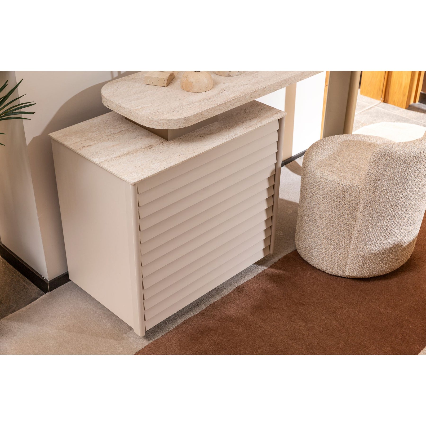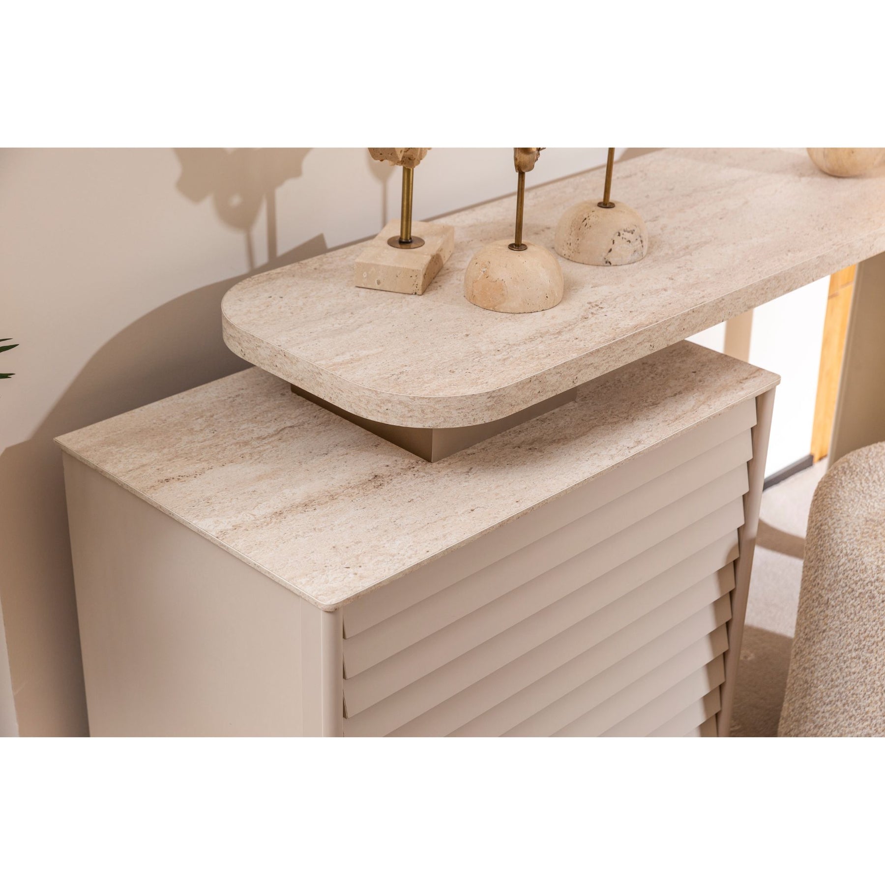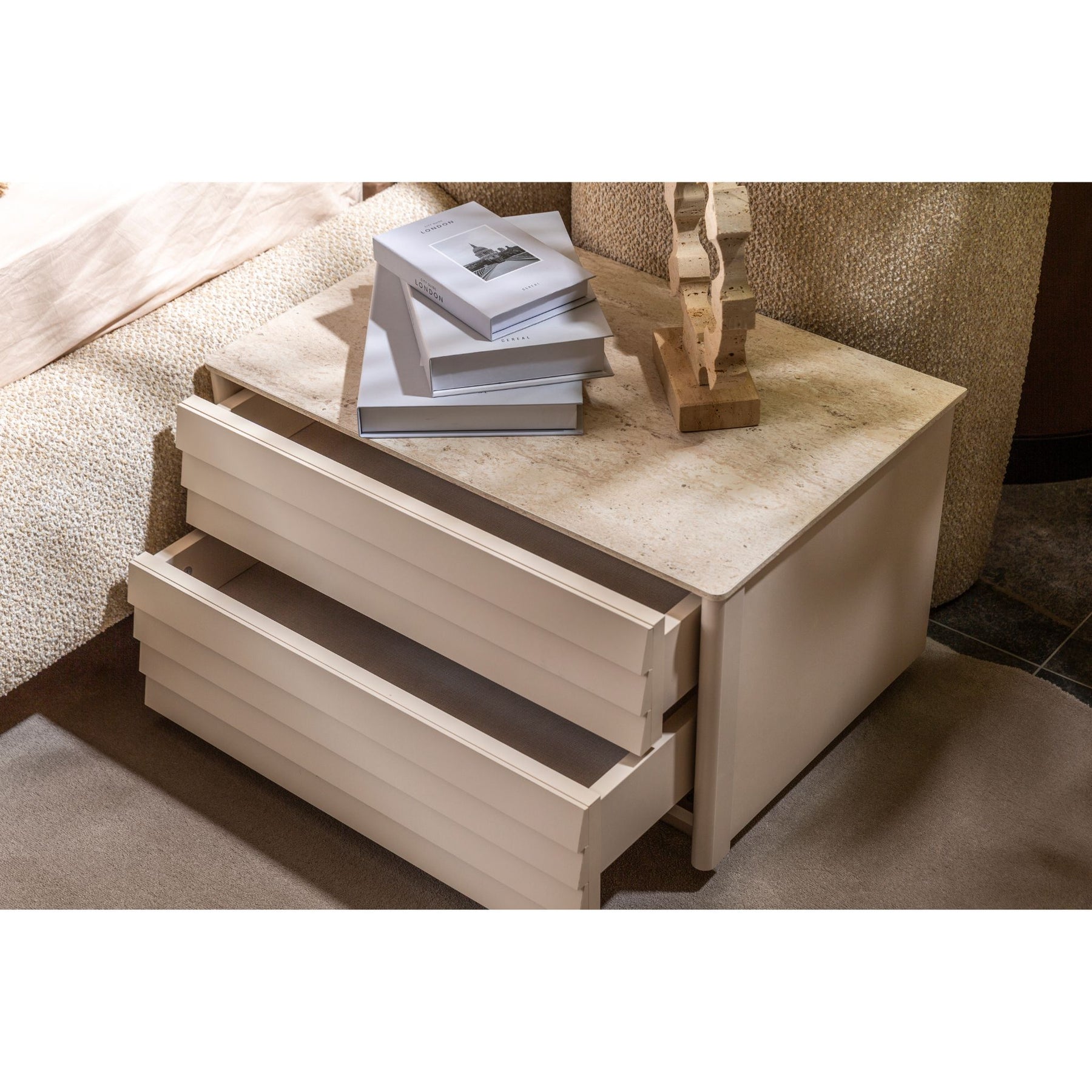 2 Nachtkonsolen mit waagerechter Lamellen-Front und Oberseite in Travertin-Steinoptik