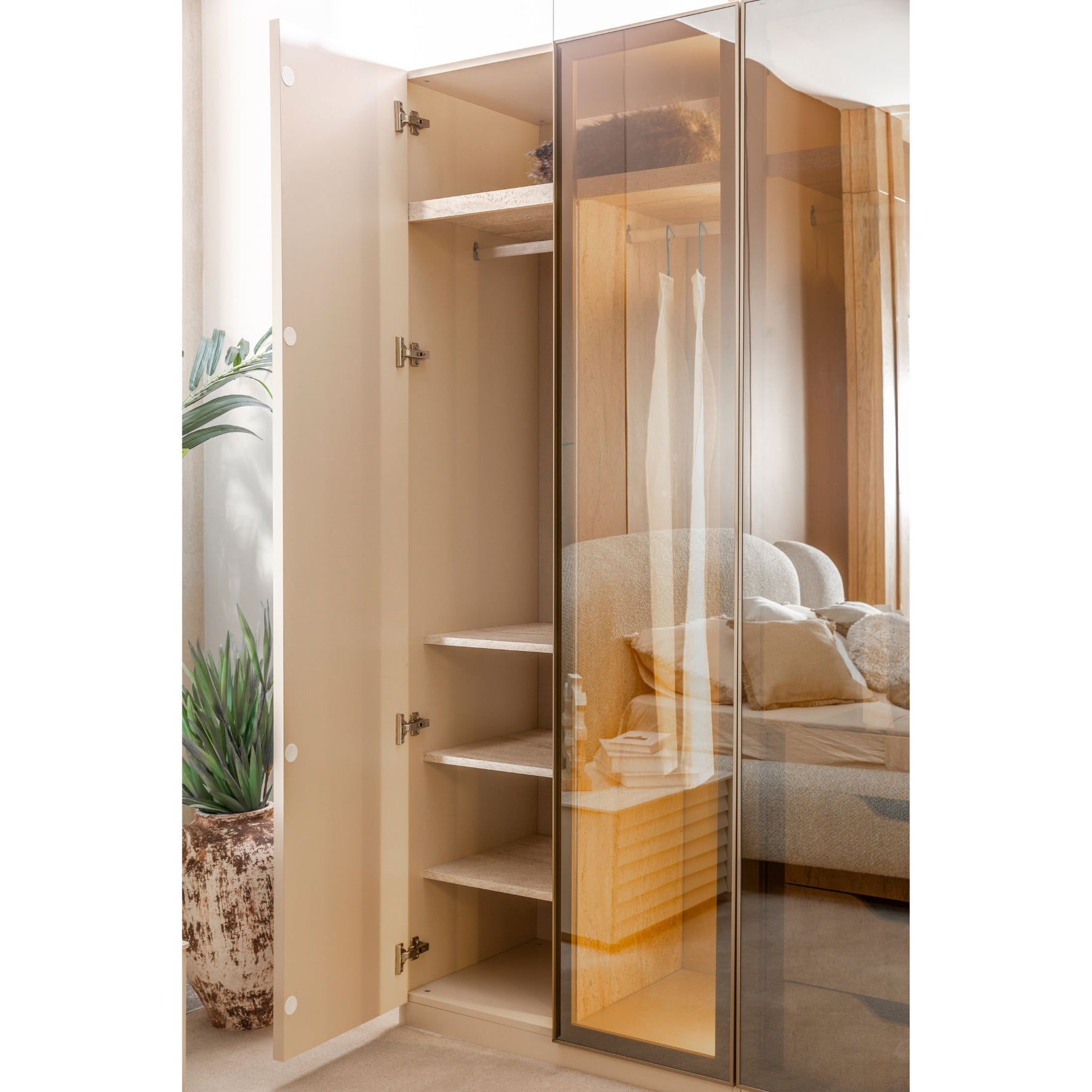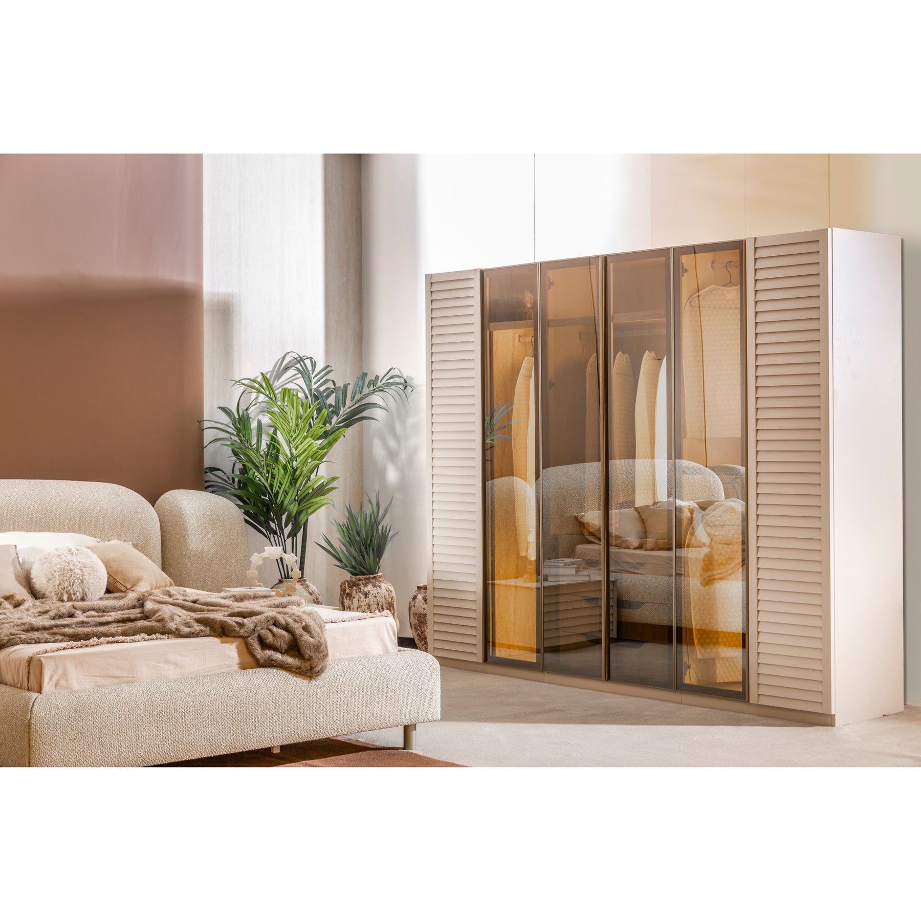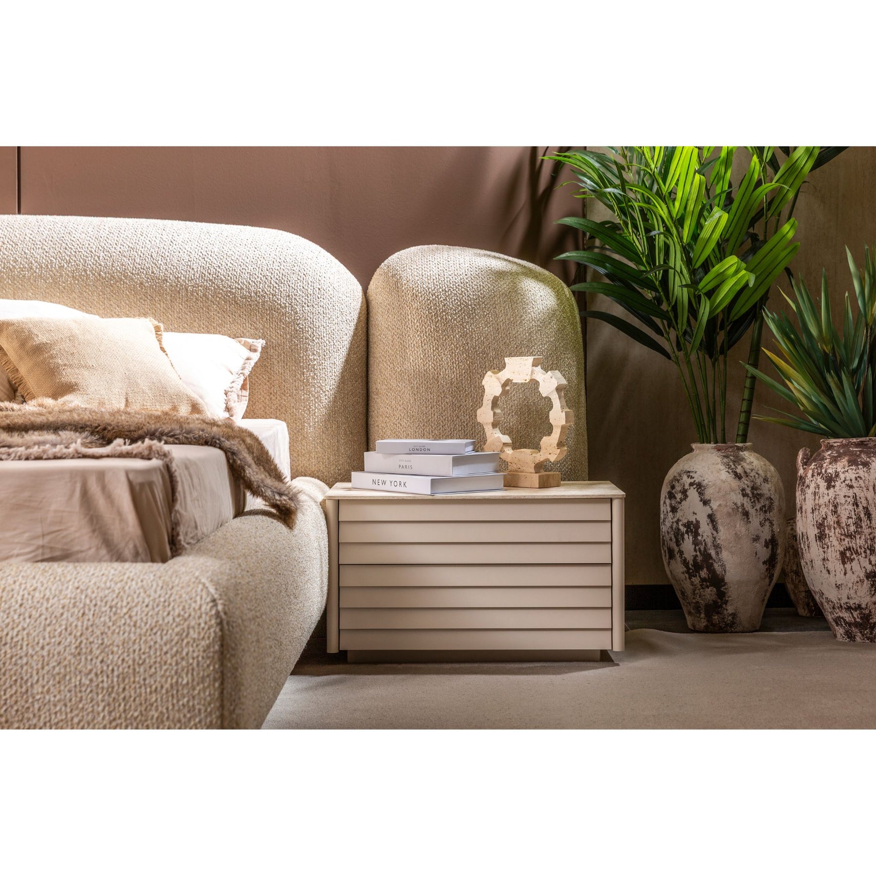Das Troya Schlafzimmer Set verbindet weiche Formen mit klarer Linienführung und schafft so ein stilvolles, ruhiges Ambiente. Die Kombination aus hellen Farbtönen und abgestimmten Strukturen sorgt für ein harmonisches Gesamtbild mit durchdachten Details.