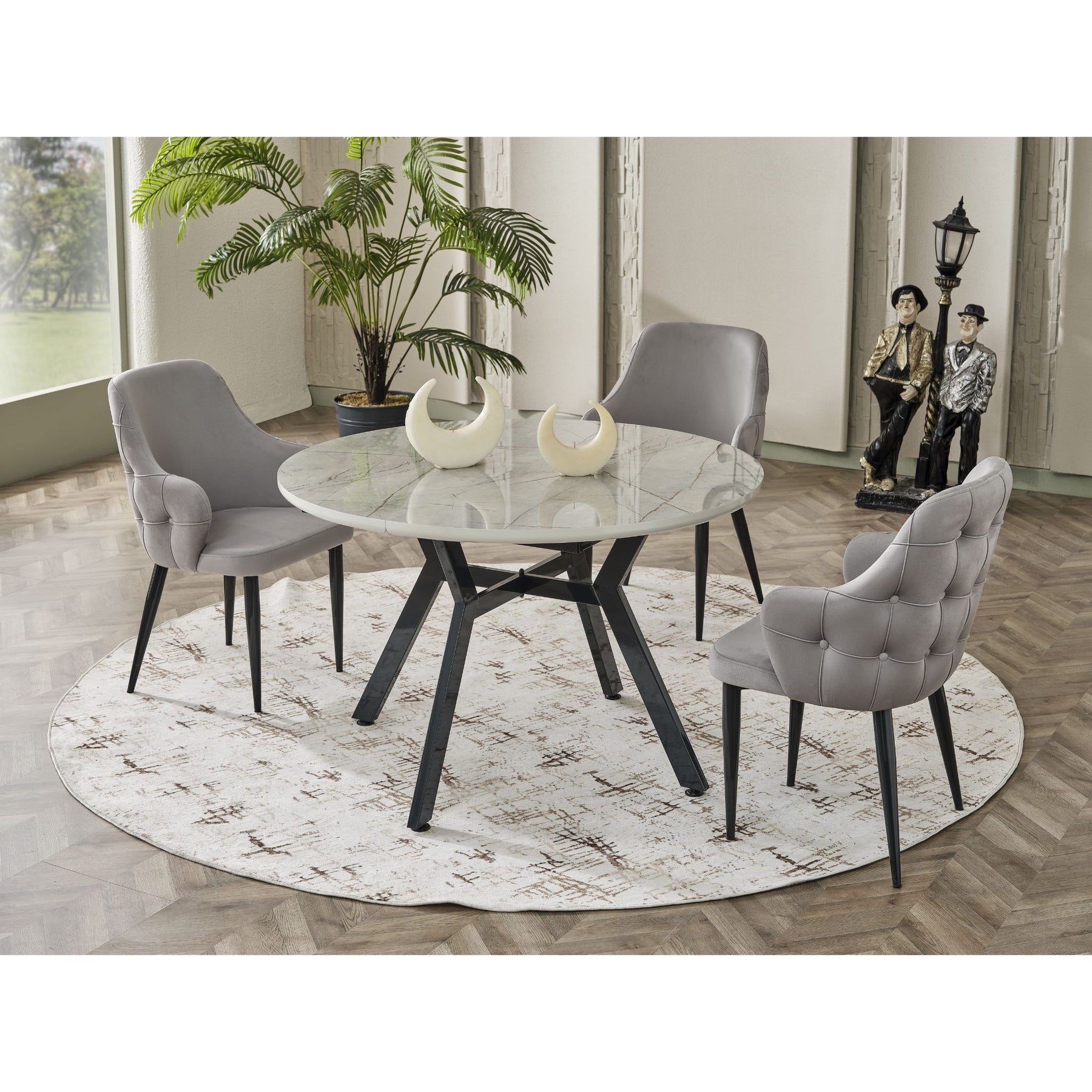 Der runde Tisch mit ausziehbarer Platte bietet genügend Platz für Familie und Gäste, während die Alfa Stühle mit ihrem gepolsterten Sitzbereich und Metallgestell für Komfort und Stabilität sorgen.