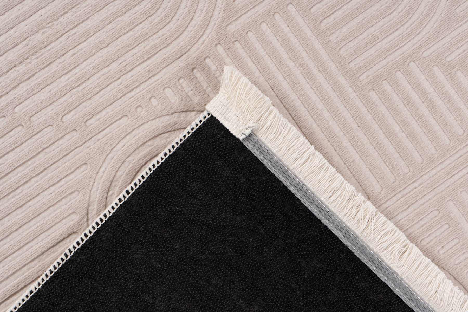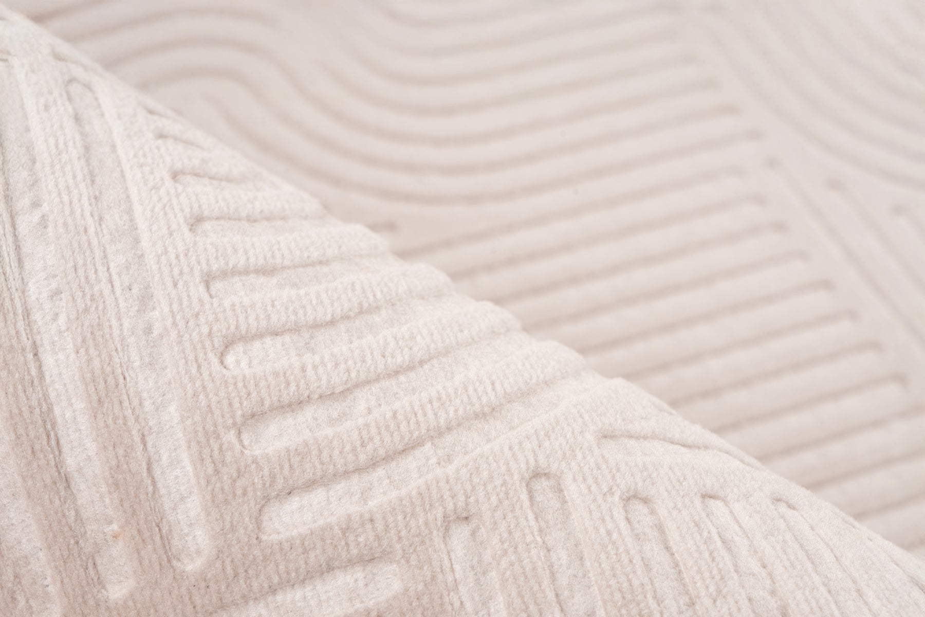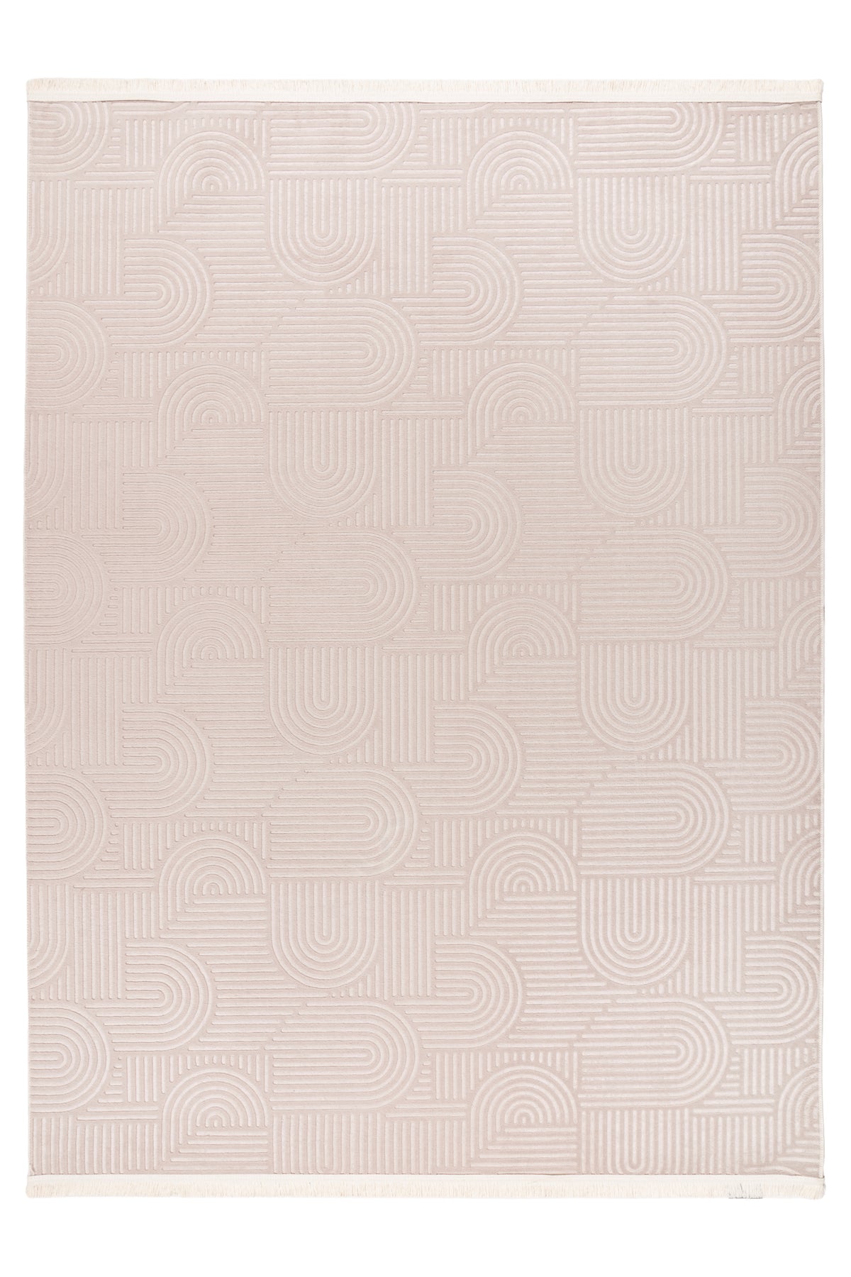 Das Highlight des Teppichs ist sein raffiniertes, geometrisches Design. Ein subtiles Muster aus stilisierten Bögen und klaren Linien wird durch eine moderne Hoch-Tief-Struktur erzeugt. Dieser 3D-Effekt verleiht dem Teppich eine faszinierende optische Tiefe und eine spannende Haptik, die sich unter den Füßen wunderbar weich anfühlt. Feine, kurze Fransen an den Kanten runden das hochwertige Gesamtbild stilvoll ab.